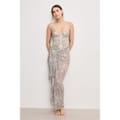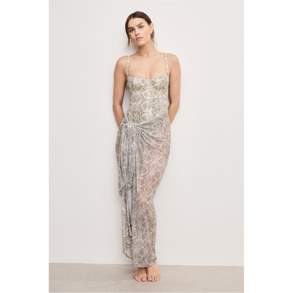 Discover the Good American maxi sarong, perfect for casual and beach collections. This relaxed fit skirt features a striking snake pattern with snake skin texture, complemented by elegant mesh details. The tie closure adds a touch of convenience, while ruffle embellishments enhance its stylish appeal. -