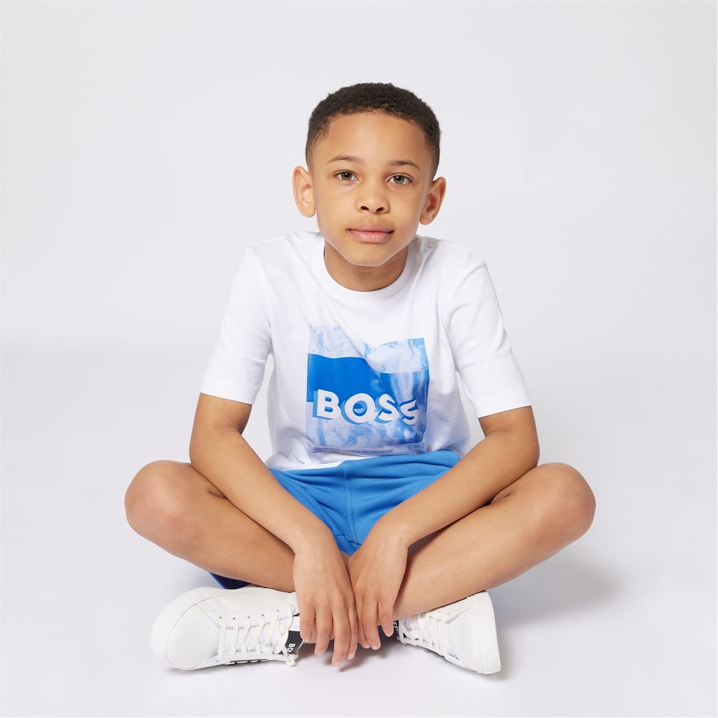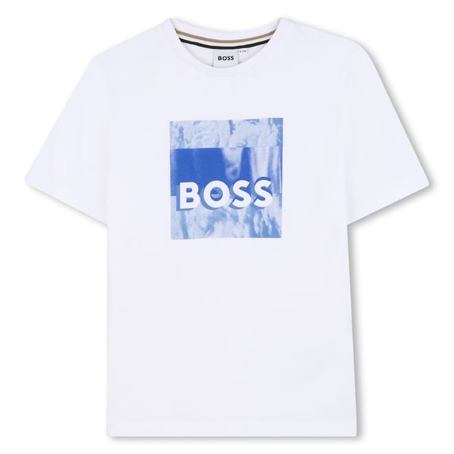 This Boss top for juniors features a regular fit and a crew neck. It showcases a graphic print with lettering and a logo embellishment, making it a standout piece in any casual collection. The short sleeves add to its relaxed style, perfect for everyday wear. -
