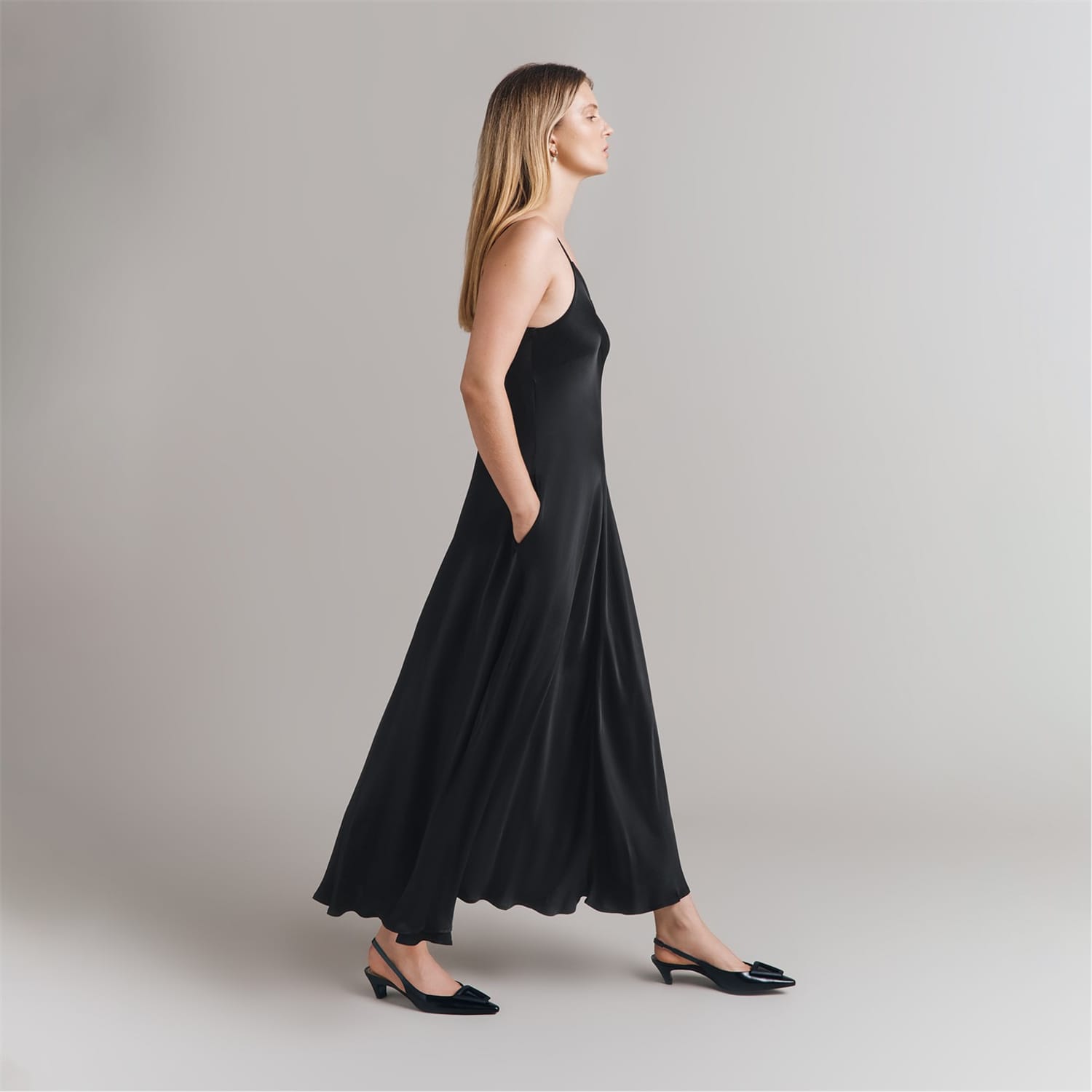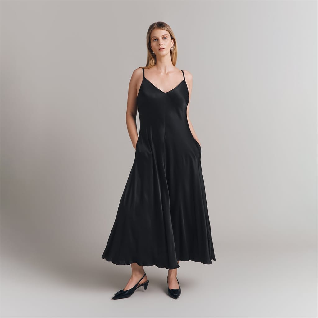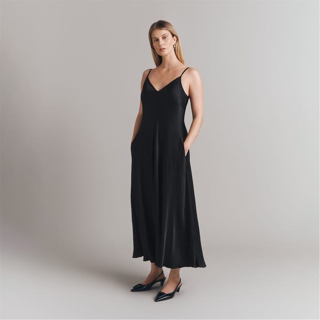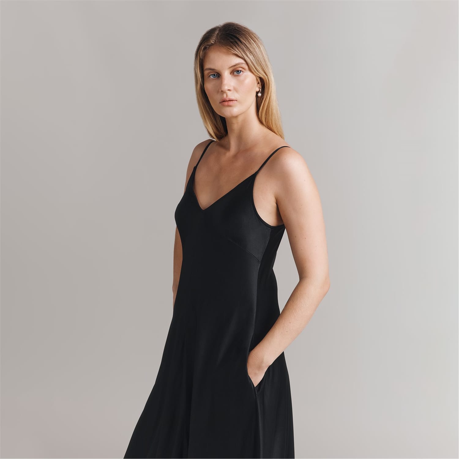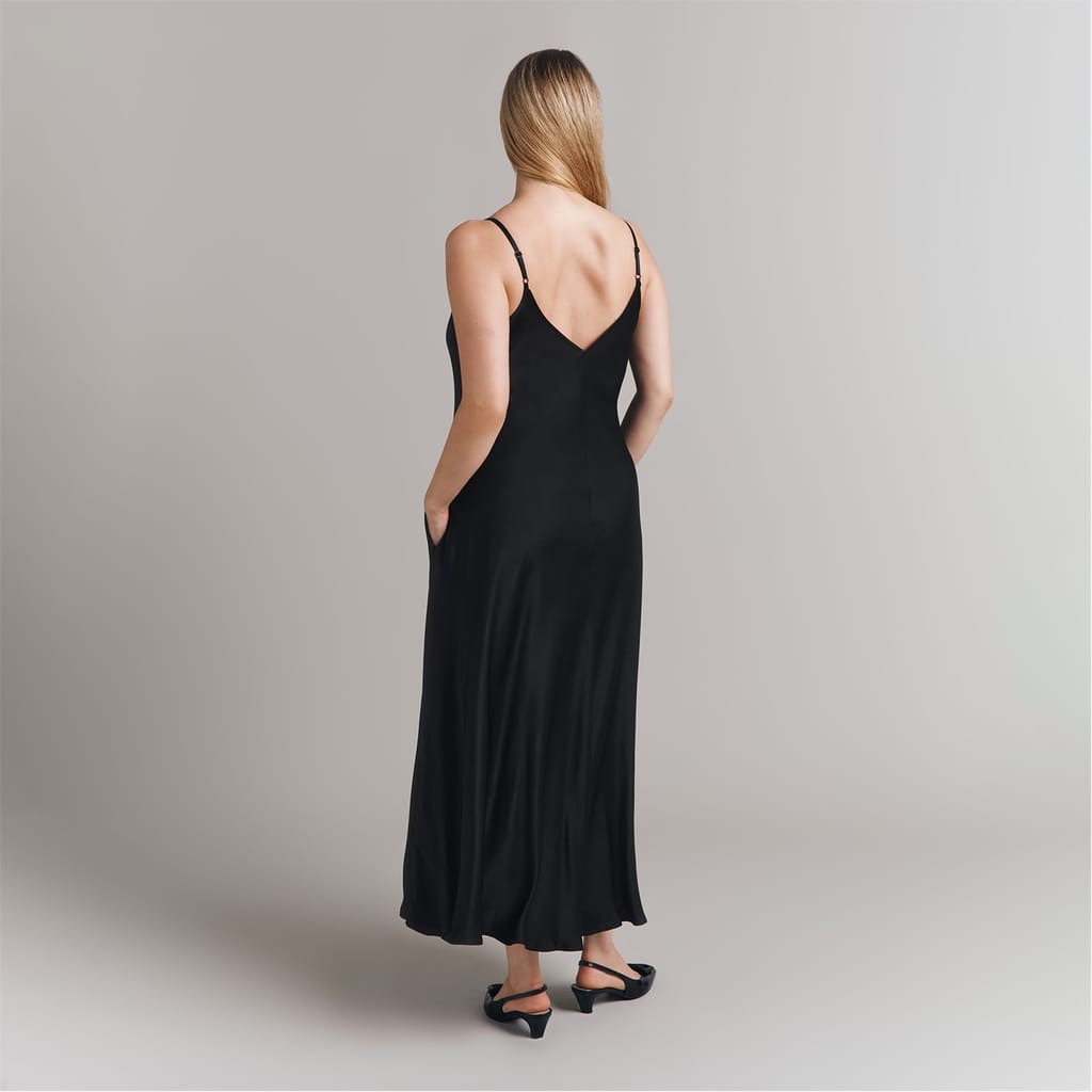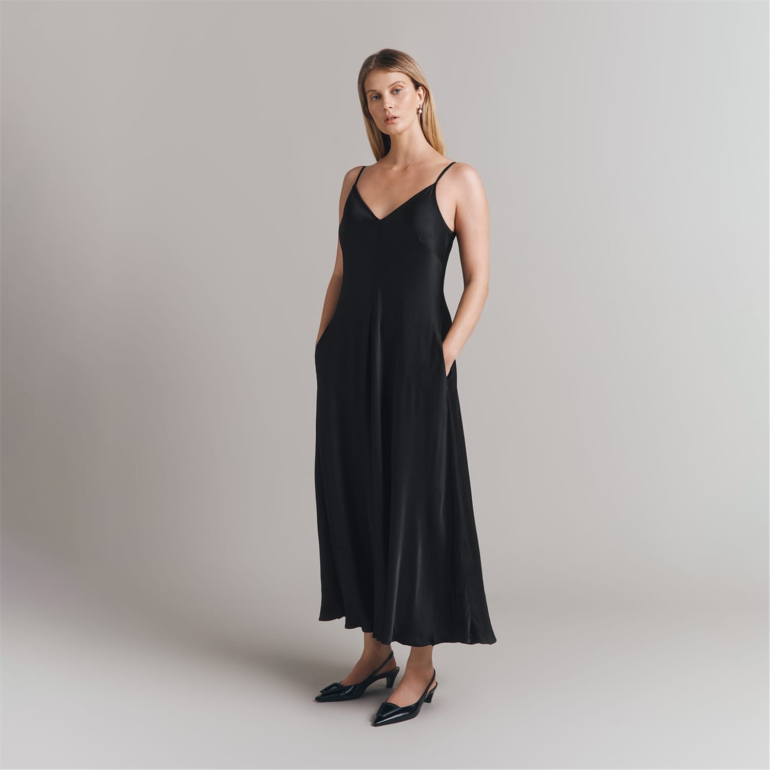 Discover the elegance of Ghost's slip dress, a maxi-length piece with a sophisticated V-neckline. This solid-coloured dress features spaghetti straps and practical pockets, offering a seamless blend of style and functionality. Perfect for those seeking a timeless and versatile addition to their wardrobe. -