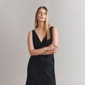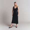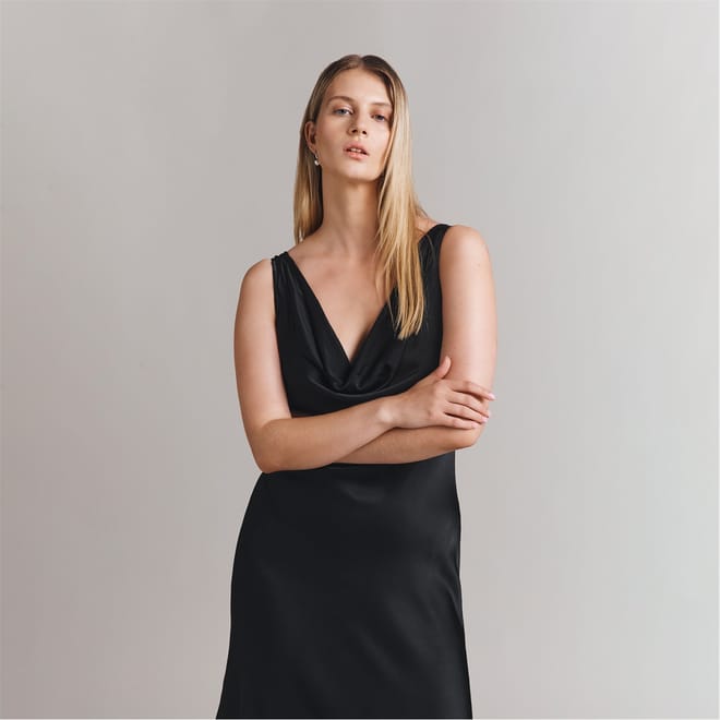 This Ghost slip dress is a sophisticated choice for any occasion. Crafted in a solid pattern, it features a cowl neck and a midi length, offering a sleek and elegant silhouette. The slim fit enhances its refined style, making it a timeless addition to your wardrobe. -