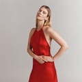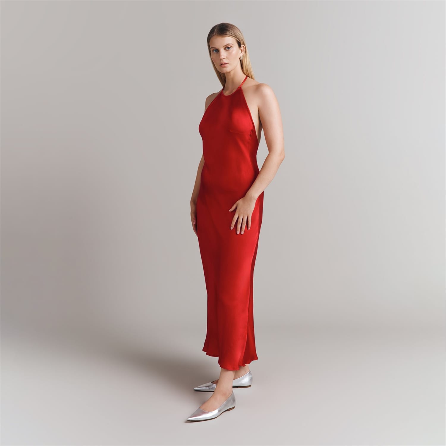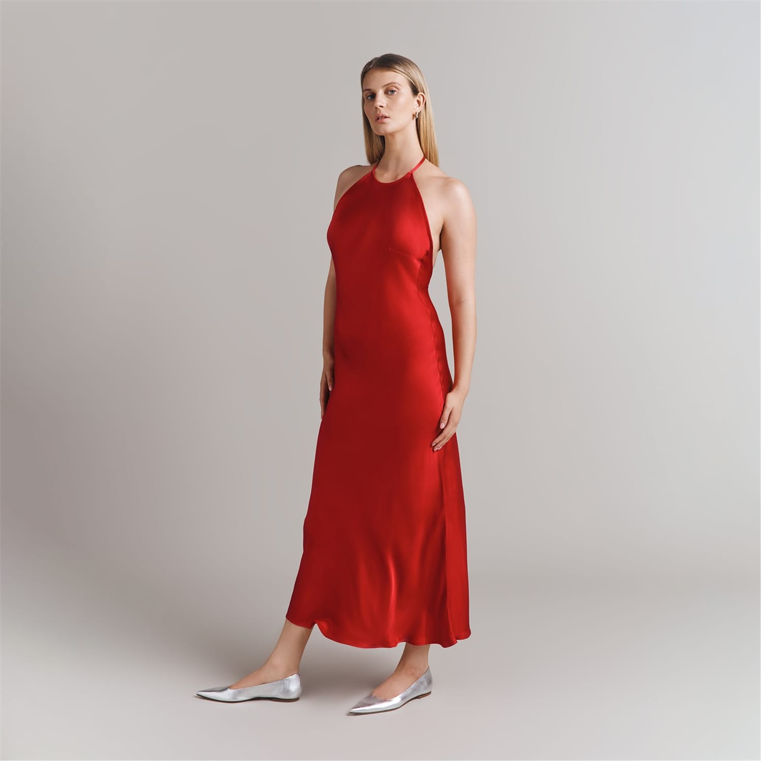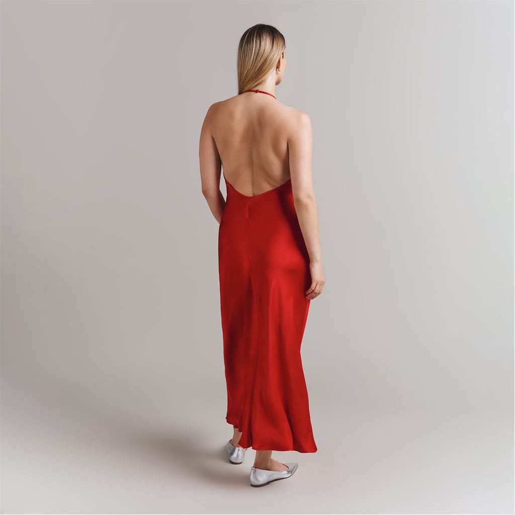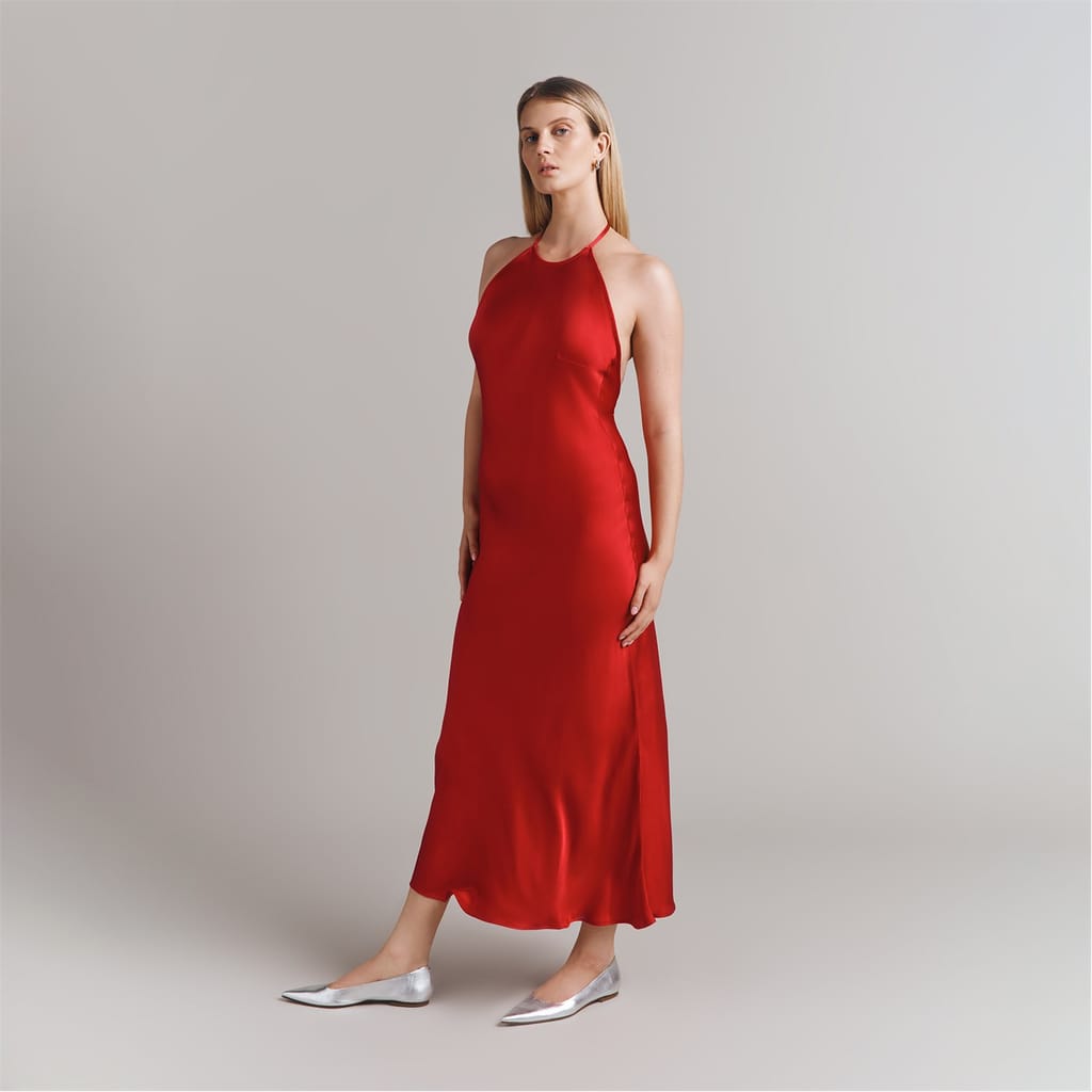 This Ghost slip dress is a sophisticated midi-length piece, featuring a halter neckline and a solid pattern. Designed with a slim fit, it offers a sleek silhouette perfect for various occasions. -