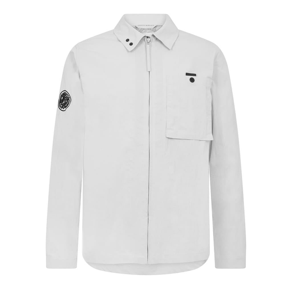 The Pretty Green Heaton overshirt is a versatile piece featuring a shirt collar and a curved hem. Designed with a regular fit, it offers a solid pattern and is equipped with a zipper and snap button closure. Embellished with a logo patch and patch pockets, this overshirt combines style and functionality effortlessly. -