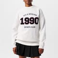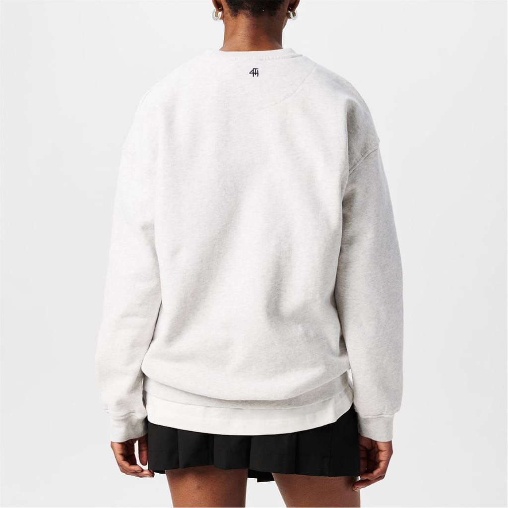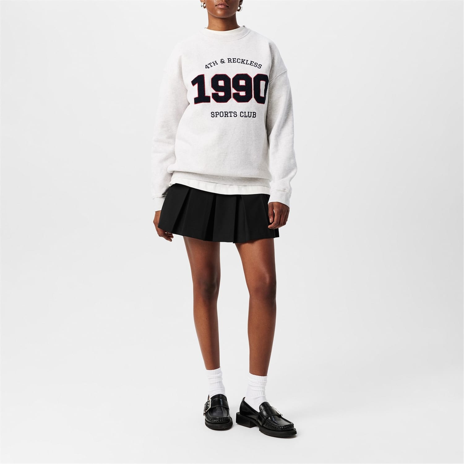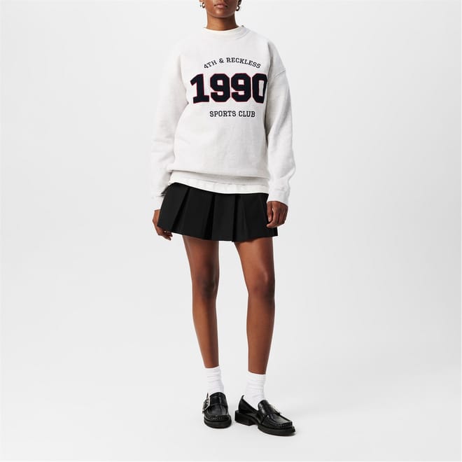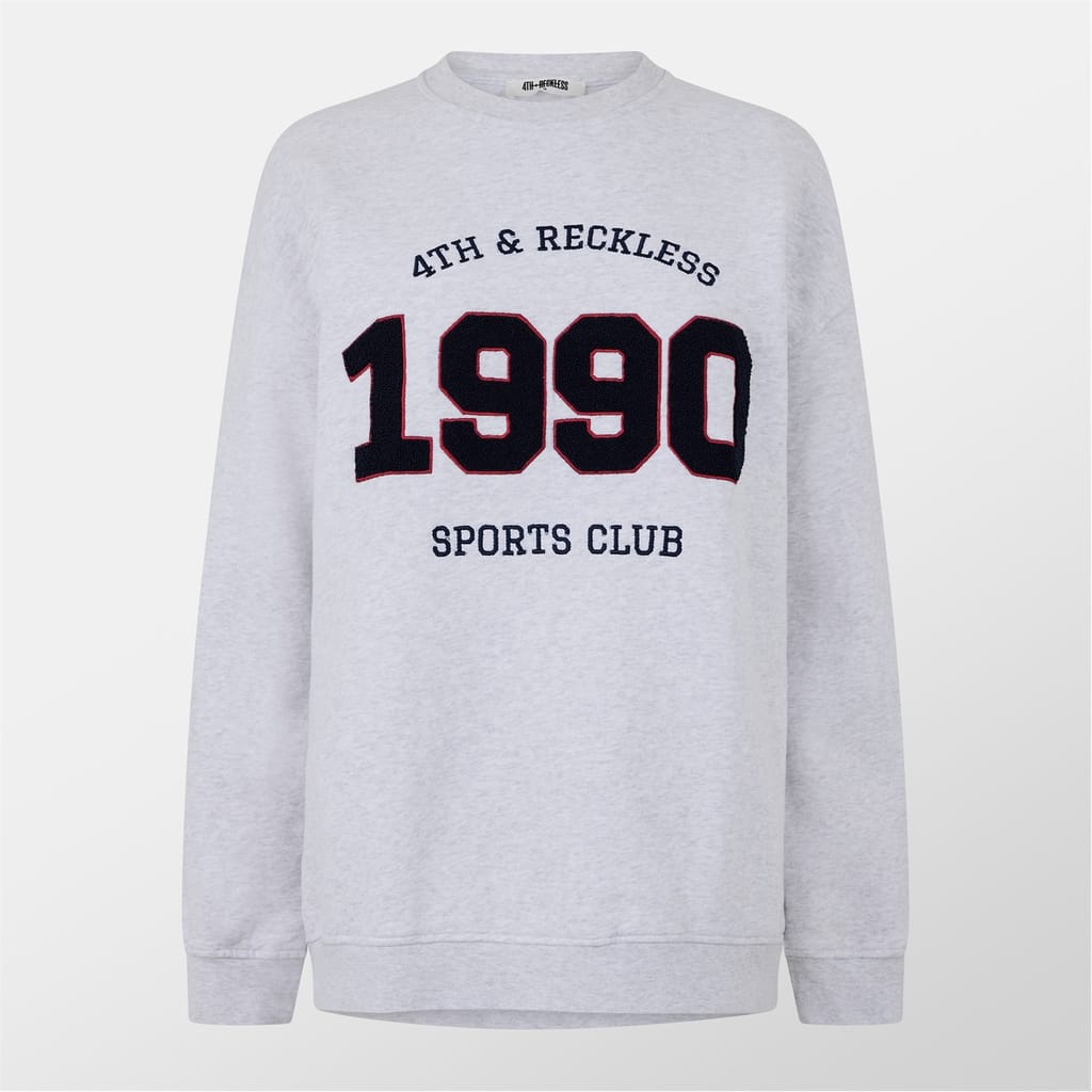 This 4th & Reckless top features a relaxed fit with long sleeves and a drop shoulder design. The crew neck and ribbed cuffs add a touch of comfort, while the graphic print and embroidered logo embellishments provide a stylish edge. -