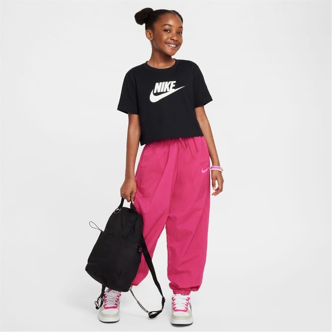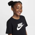 The Nike Futura cropped top is a casual essential, featuring a relaxed fit and short sleeves. Its crew neck design is complemented by a striking graphic print and a signature logo embellishment, making it a standout piece for any wardrobe. -