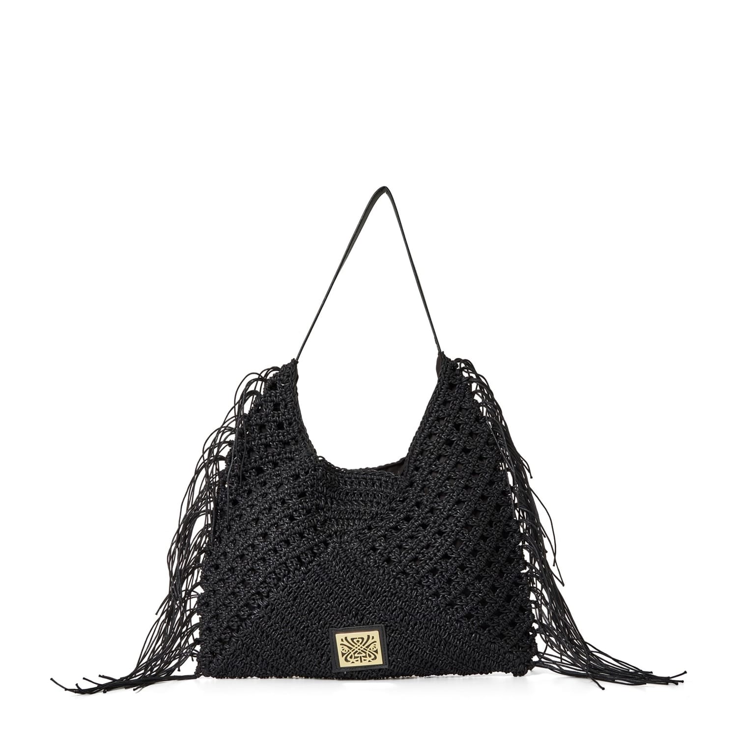 Discover the Biba hobo bag, a stylish addition to your collection. This bag features a shoulder handle for easy carrying and a snap button closure for secure storage. Adorned with fringe and a logo, it offers a unique touch to your ensemble. Perfect for those seeking a blend of fashion and functionality. -
