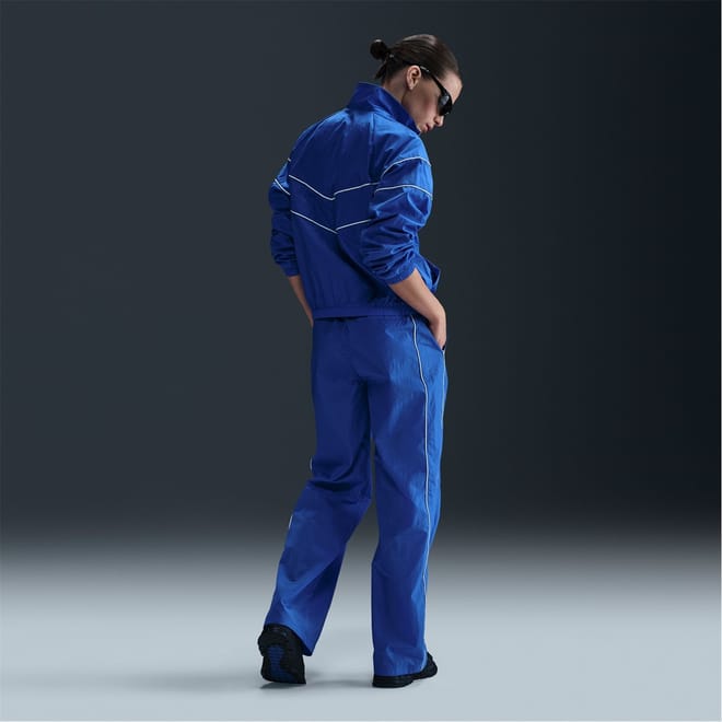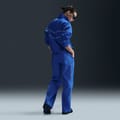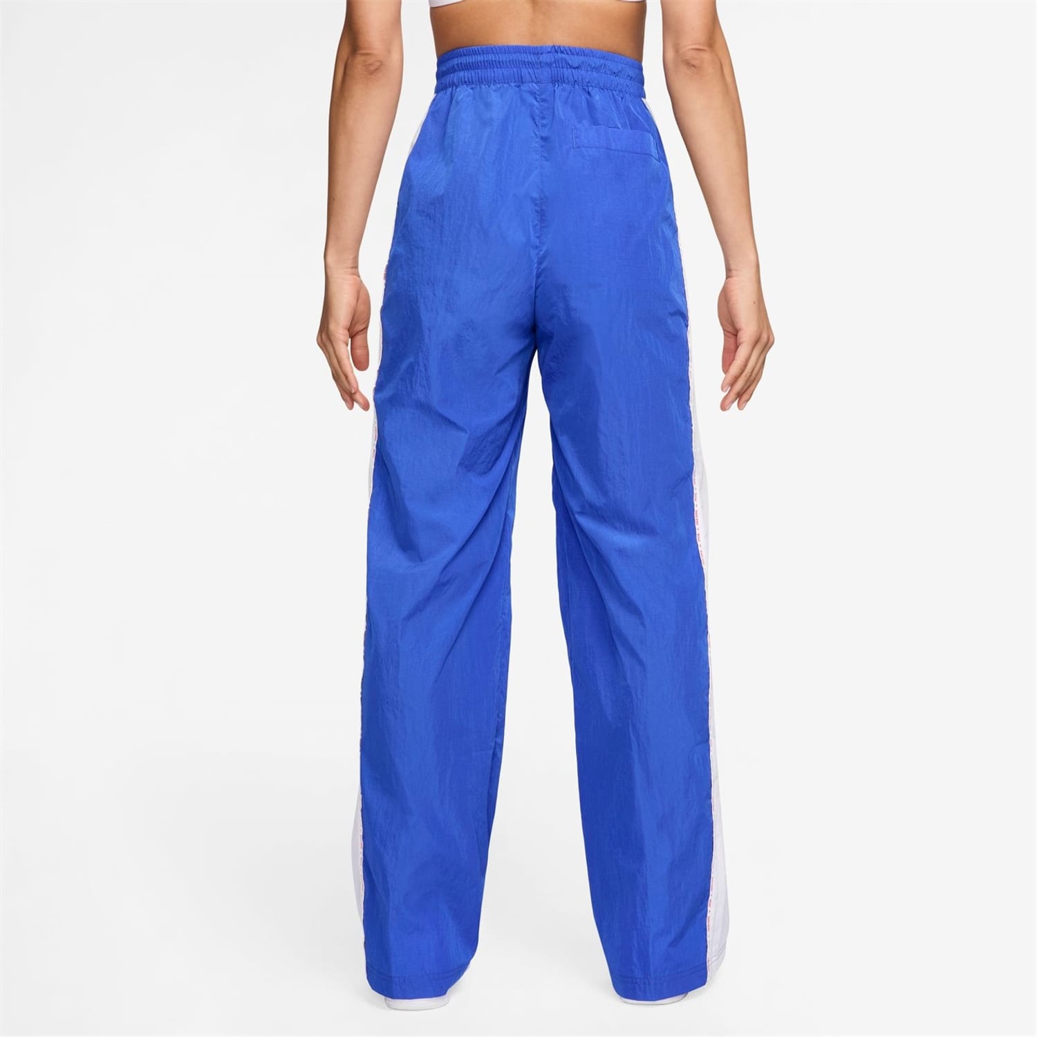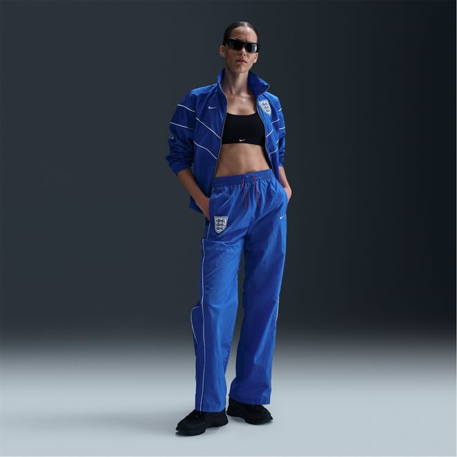Step out in style with the Nike England Woven Tracksuit Bottoms. Featuring a bold blue colourway with a contrasting stripe down the leg, they offer a sporty look with everyday comfort. The elasticated waist with drawstring ensures a secure fit, while the iconic England crest shows your support. Perfect for the pitch, stands or adding some Lioness flair to your ensemble.