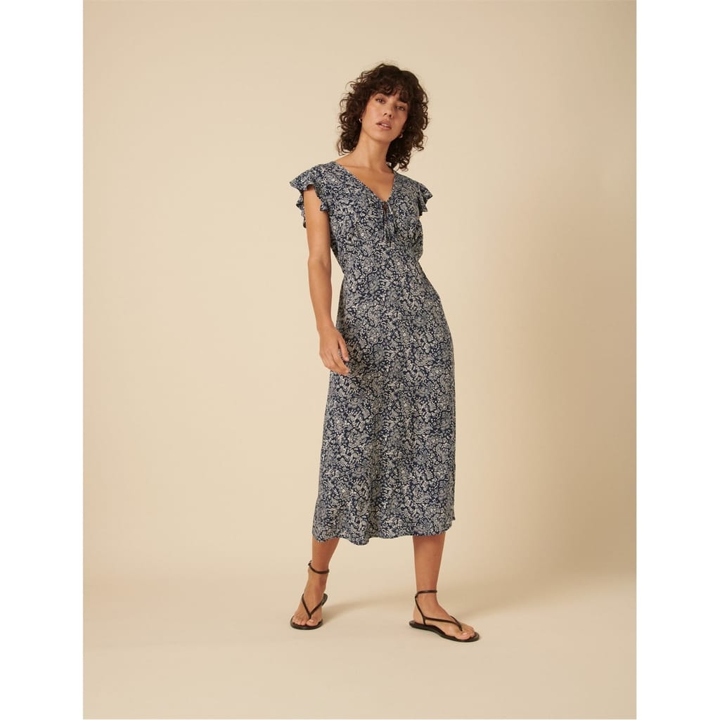 This midi dress from Nobody's Child features a charming floral pattern and a flattering V-neck. The regular fit ensures comfort, while the ruffle embellishments add a touch of elegance. The dress is designed with a straight hem, making it a versatile addition to any wardrobe. -