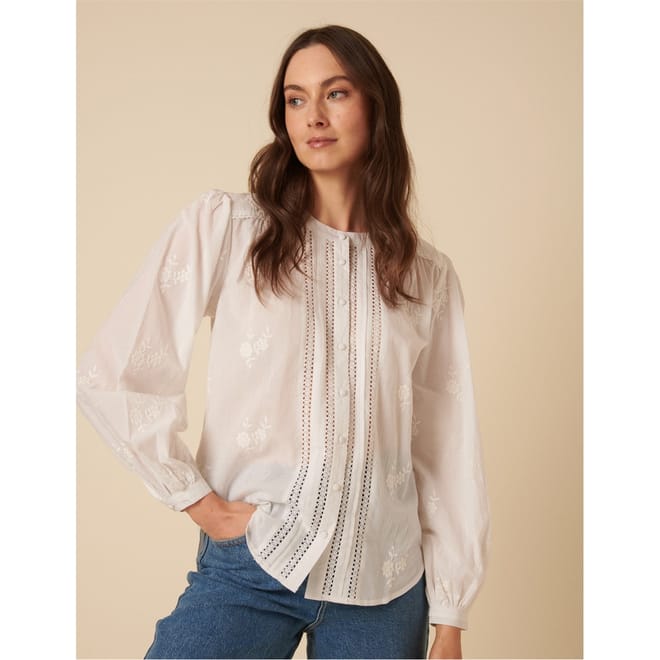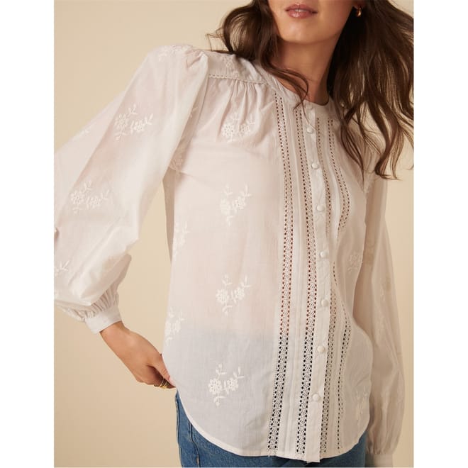 Discover the charm of Nobody's Child tops with this relaxed fit, long sleeve piece. Featuring a floral pattern, this top is adorned with eyelet and embroidered embellishments. The puff sleeves add a touch of elegance, while the crew neck and button closure complete the look. -
