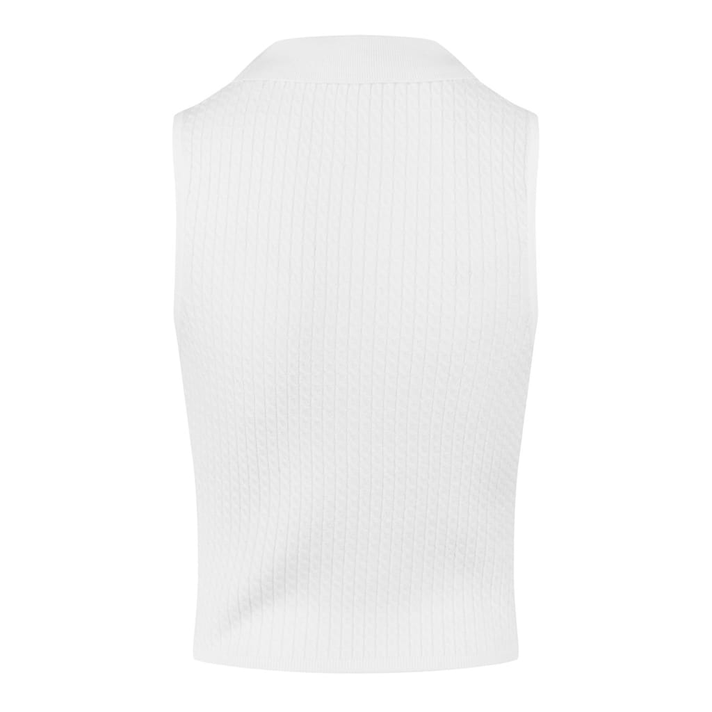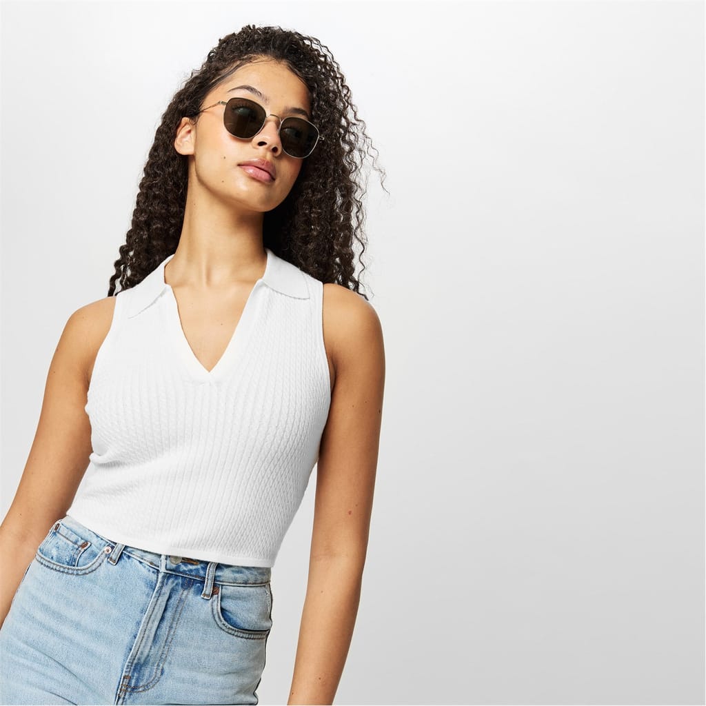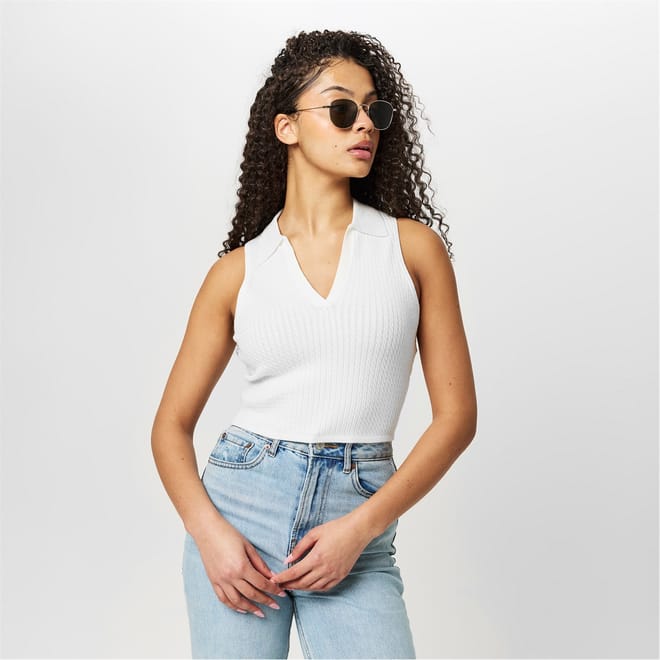 This Jack Wills top is a semi-formal piece featuring a sleeveless design and slim fit. The polo collar adds a touch of sophistication, while the ribbed pattern and cable detail enhance its knit texture. Ideal for those seeking a blend of style and comfort. -