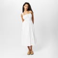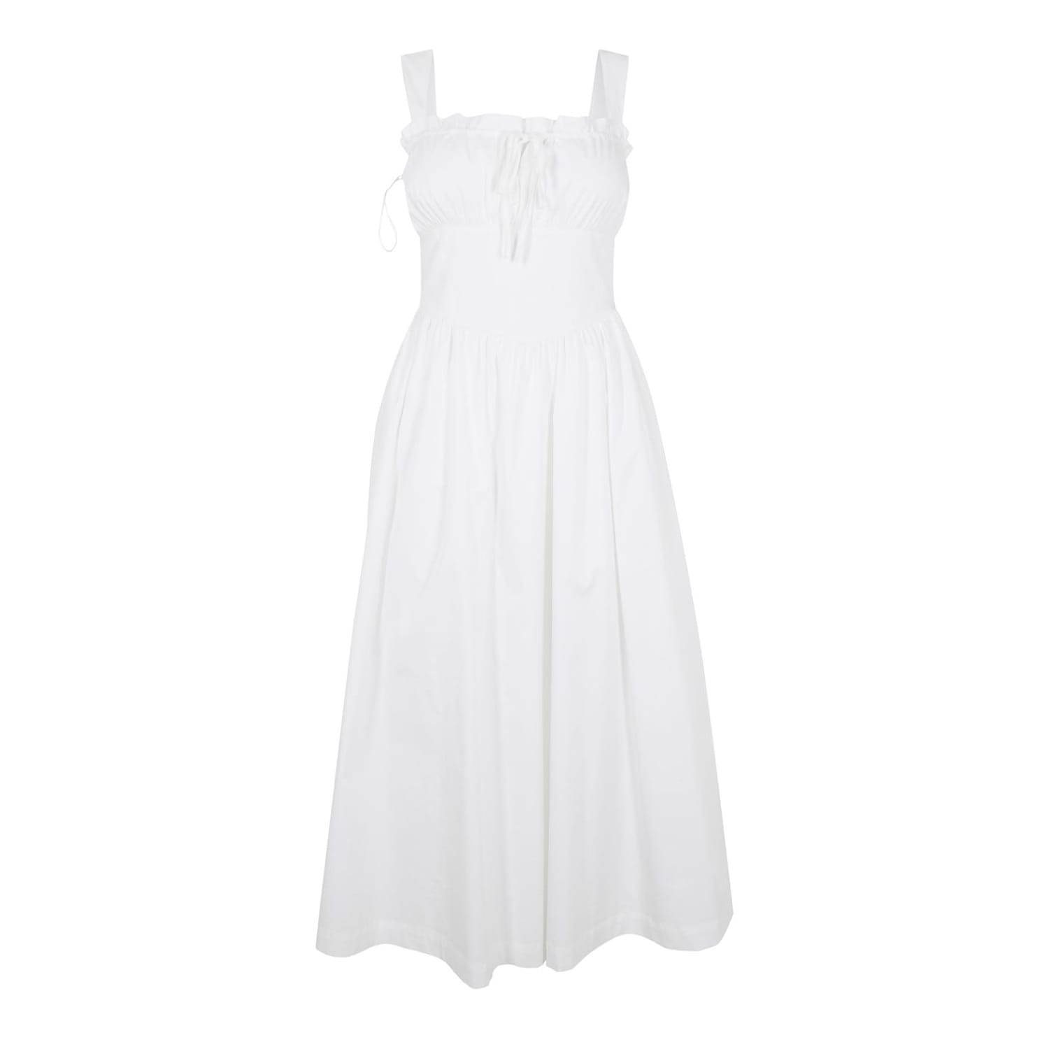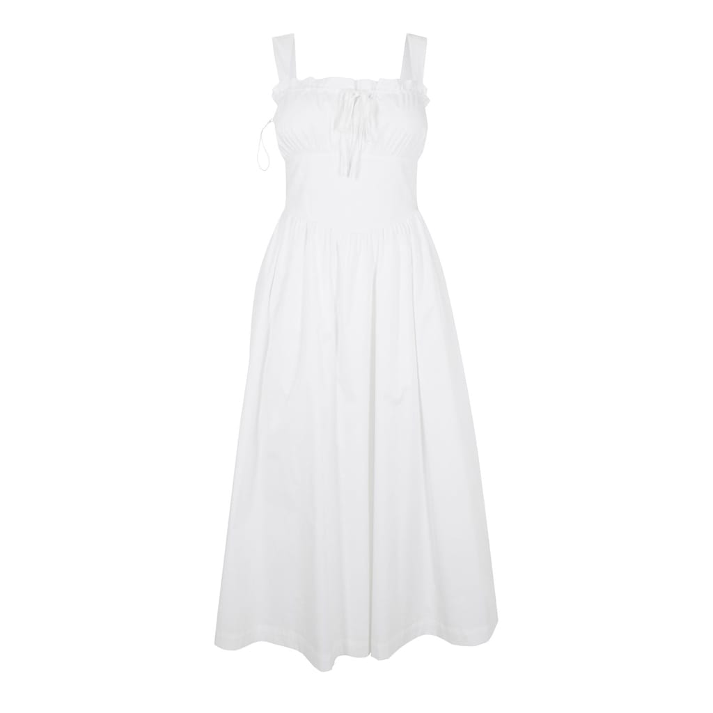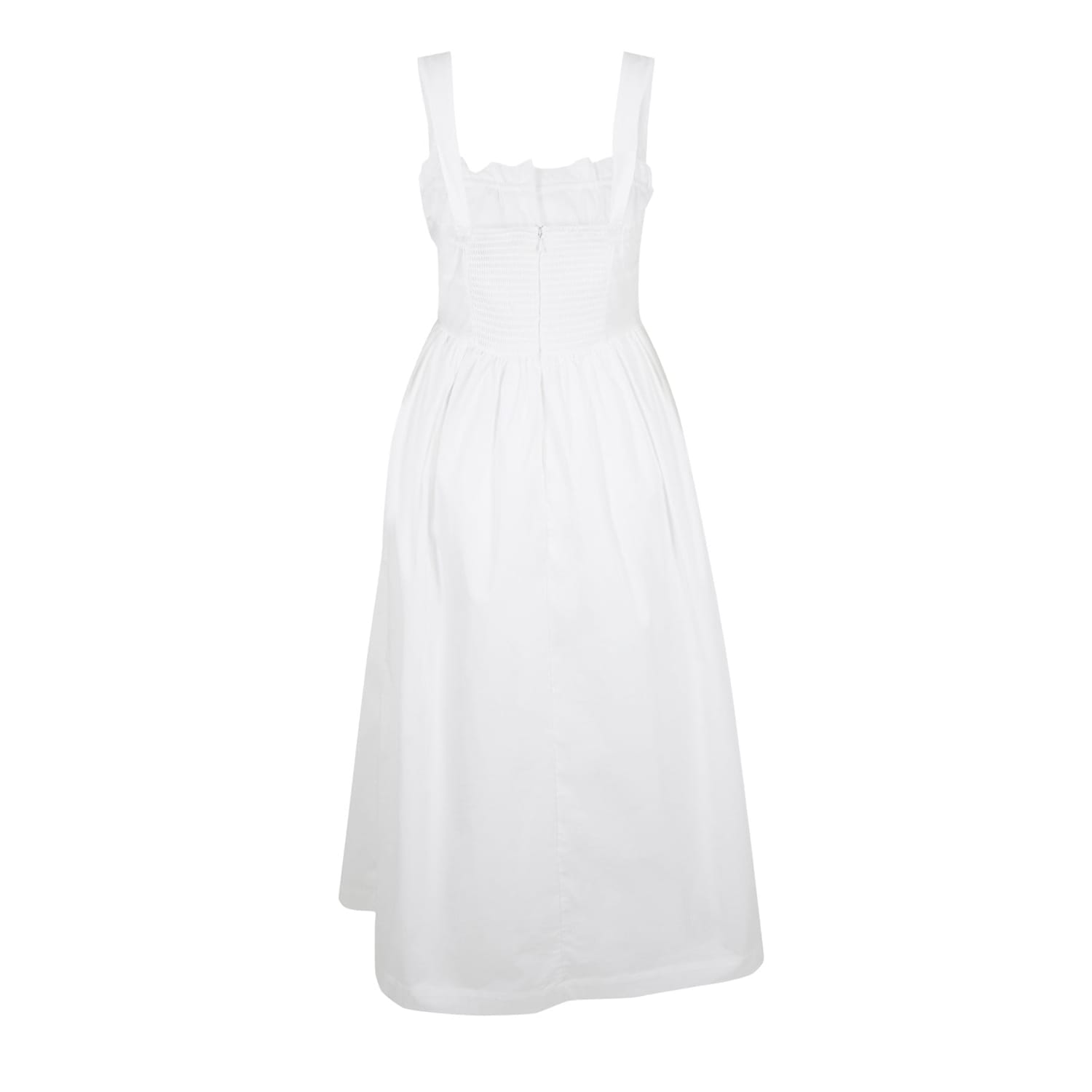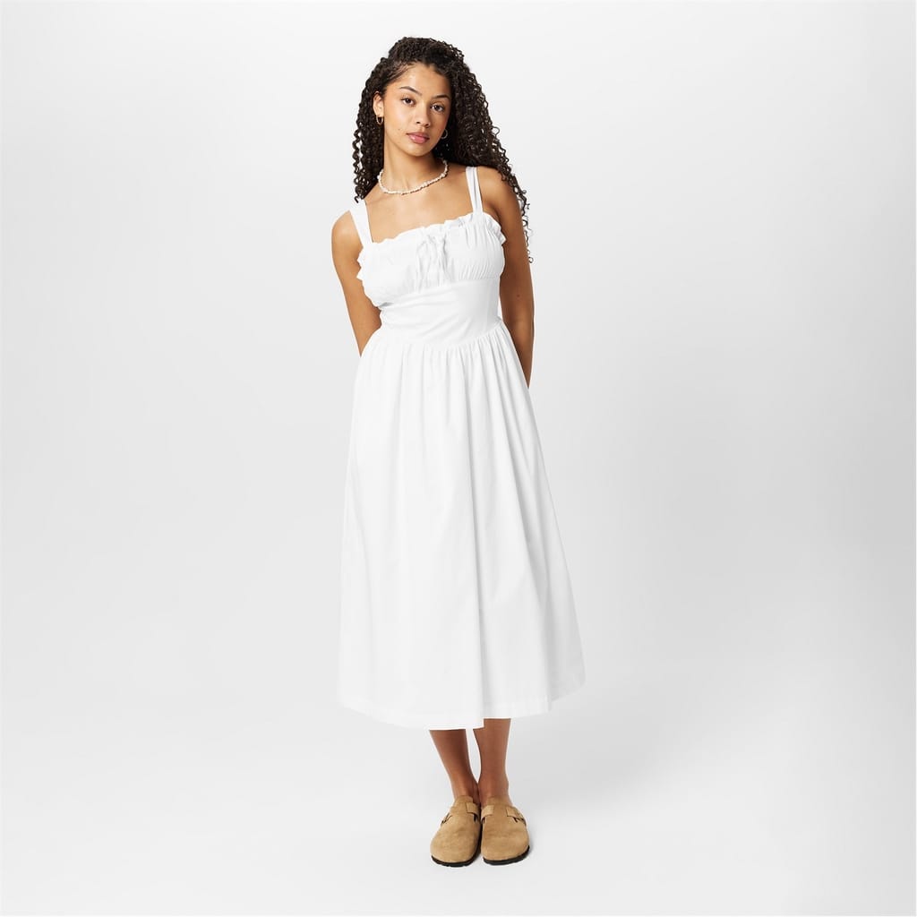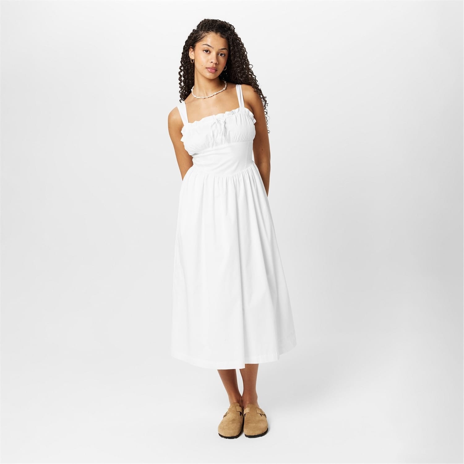 This Jack Wills midi dress features a square neck and a straight hem, offering a classic A-line silhouette. The solid pattern is complemented by ruffle embellishments, adding a touch of elegance to the design. Perfect for those seeking a timeless and sophisticated look. -