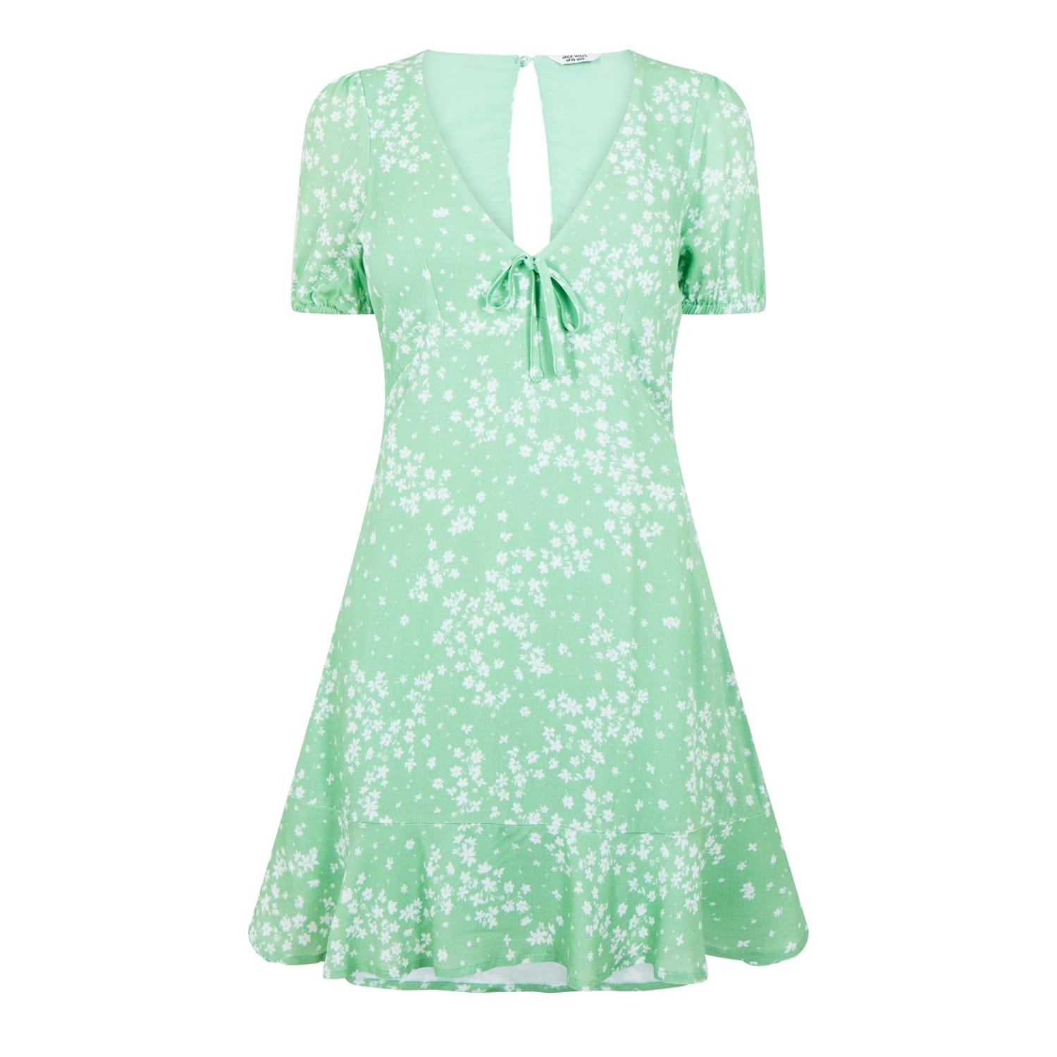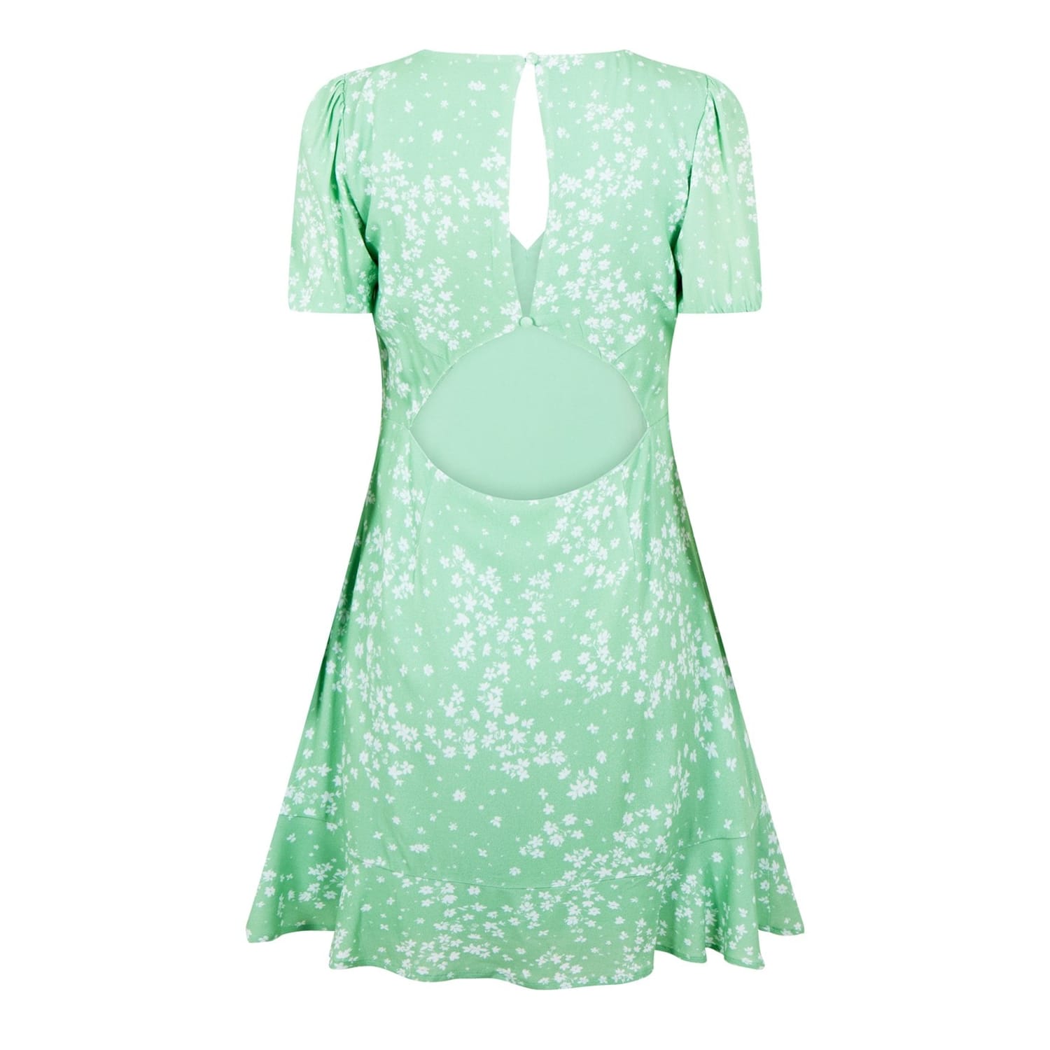 This Jack Wills mini dress features a charming floral pattern and a stylish cut-out embellishment. The A-line silhouette is complemented by a V-neck and puff sleeves, offering a regular fit. The dress is finished with a ruffle hem, adding a playful touch to its design. -