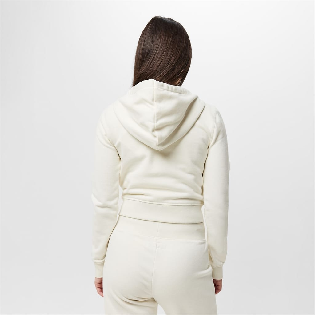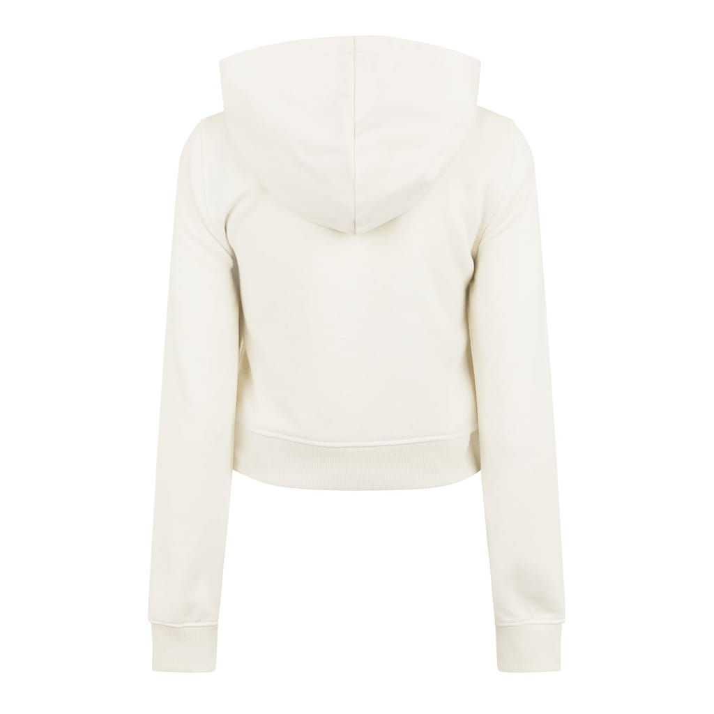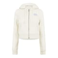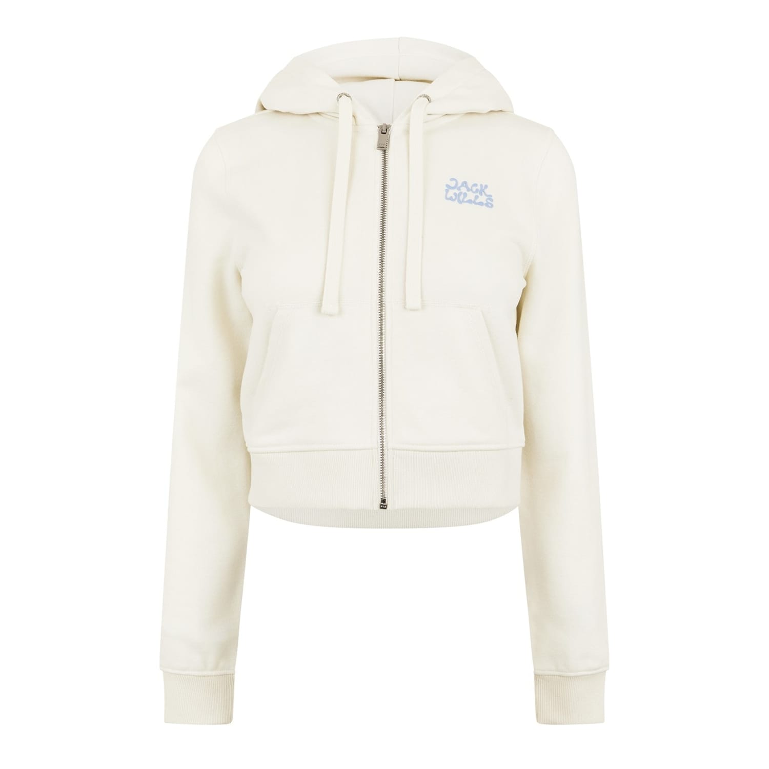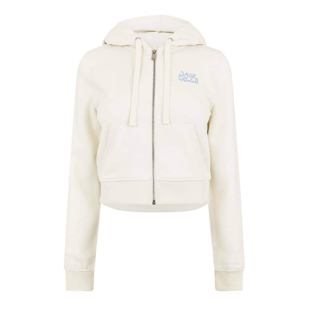 This Jack Wills cropped top from the outerwear collection features a slim fit and a hooded neckline. It includes a full zipper closure and long sleeves with ribbed cuffs. The solid pattern is complemented by a logo embellishment, adding a touch of brand identity. -
