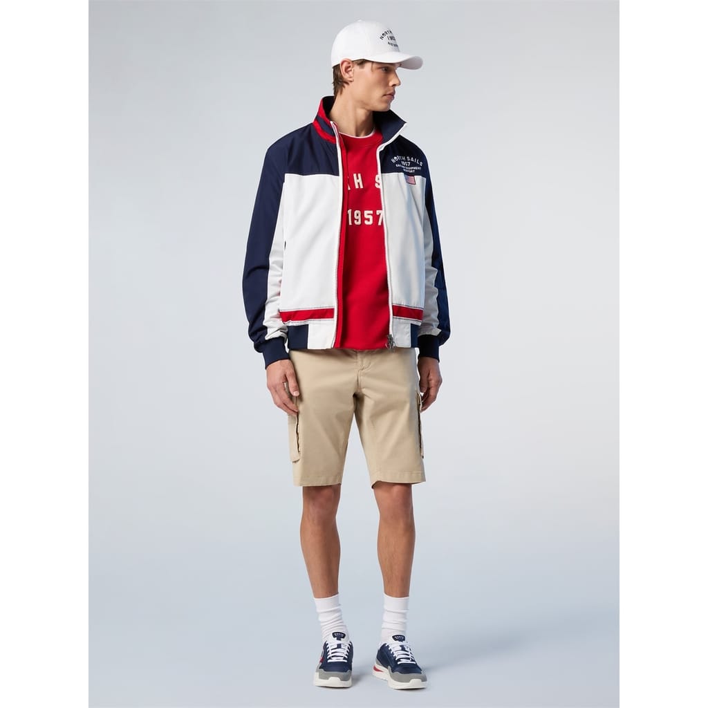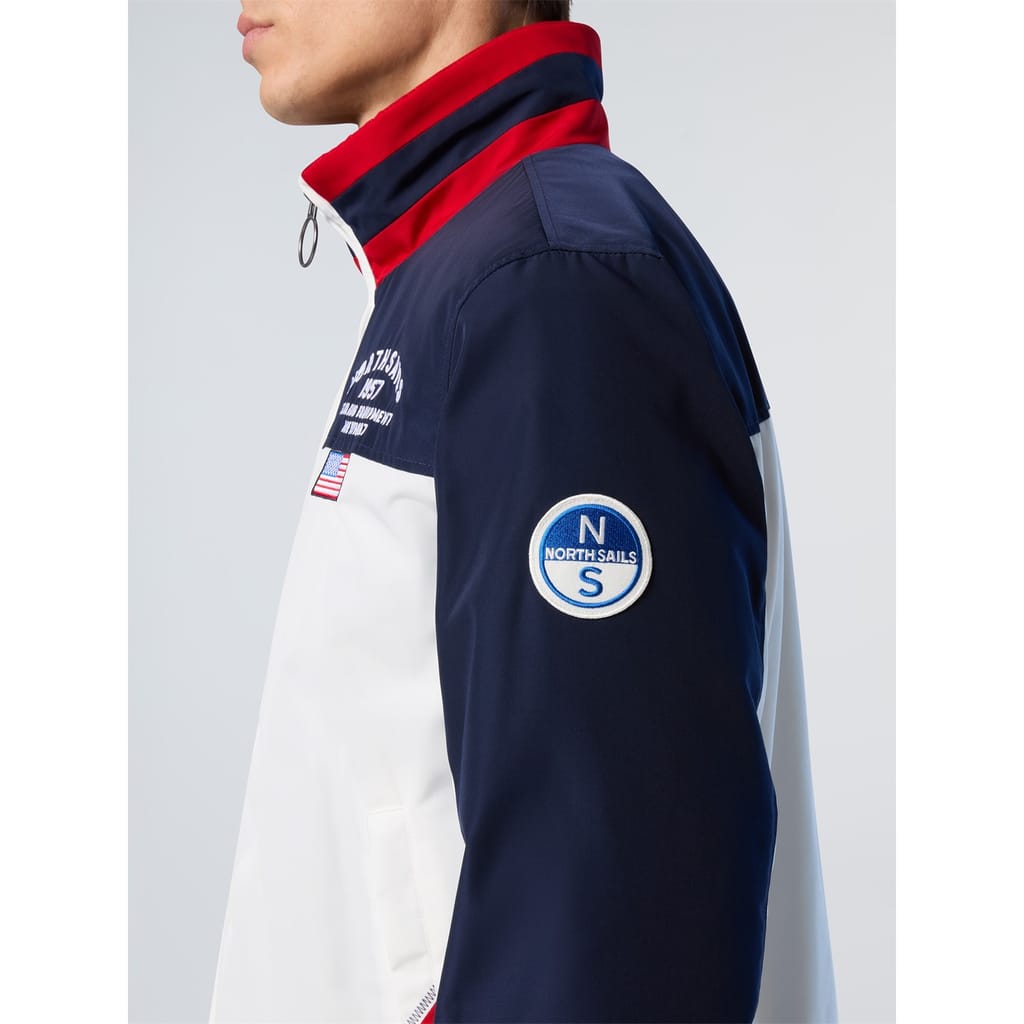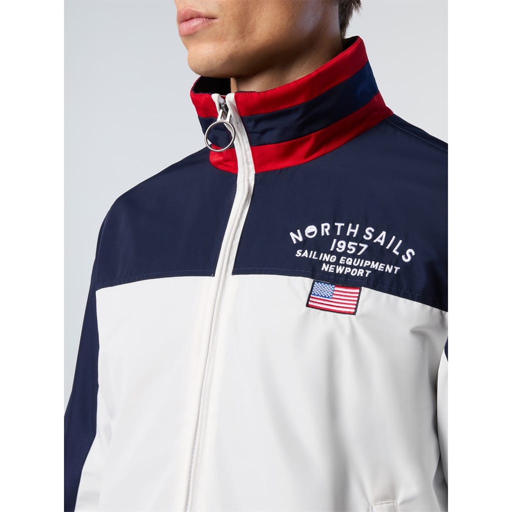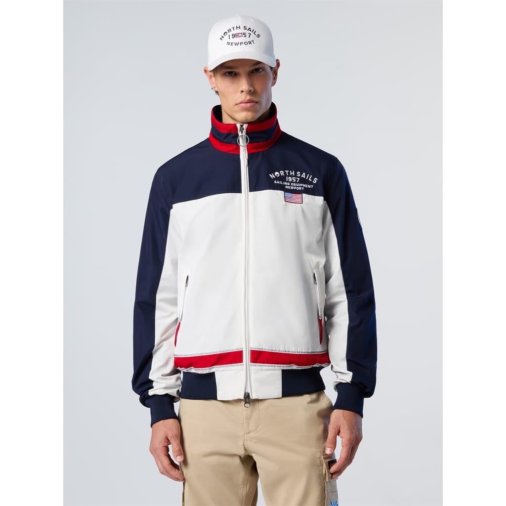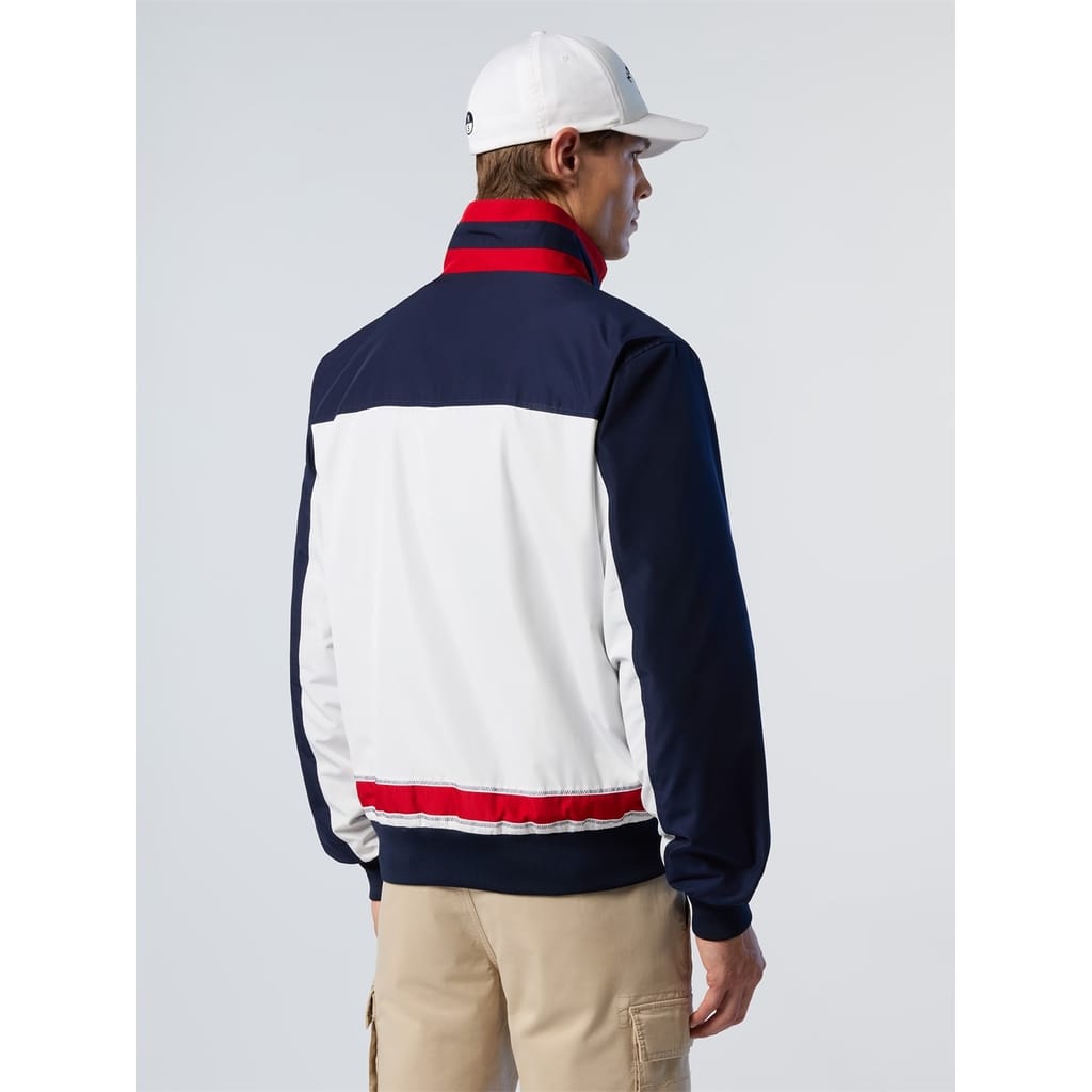 The North Sails bomber jacket offers a stylish sailor look with its short length and regular fit. Featuring a colour block pattern, it includes a zipper closure and snap buttons for added convenience. The ribbed hem and cuffs enhance its classic design, while the logo, pocket, and patch embellishments add distinctive details. -