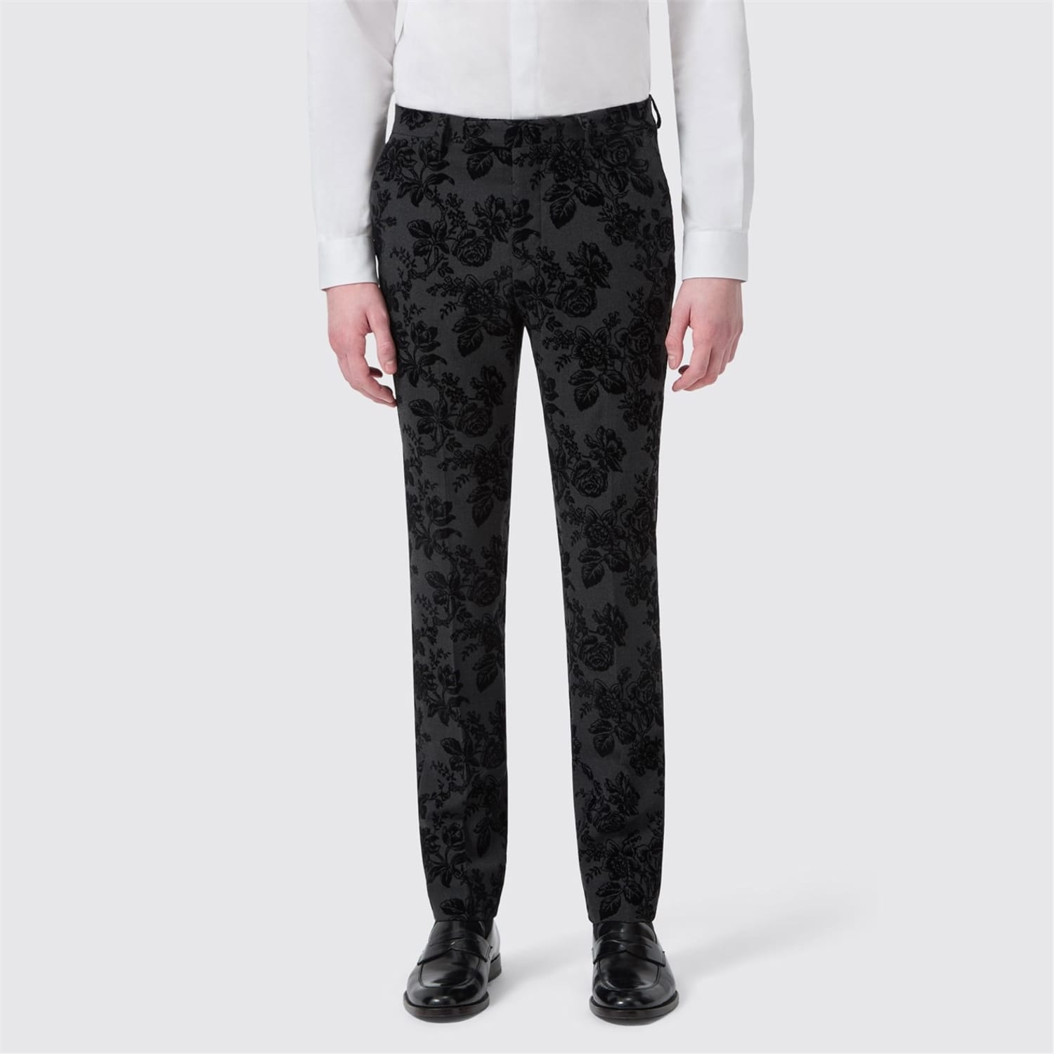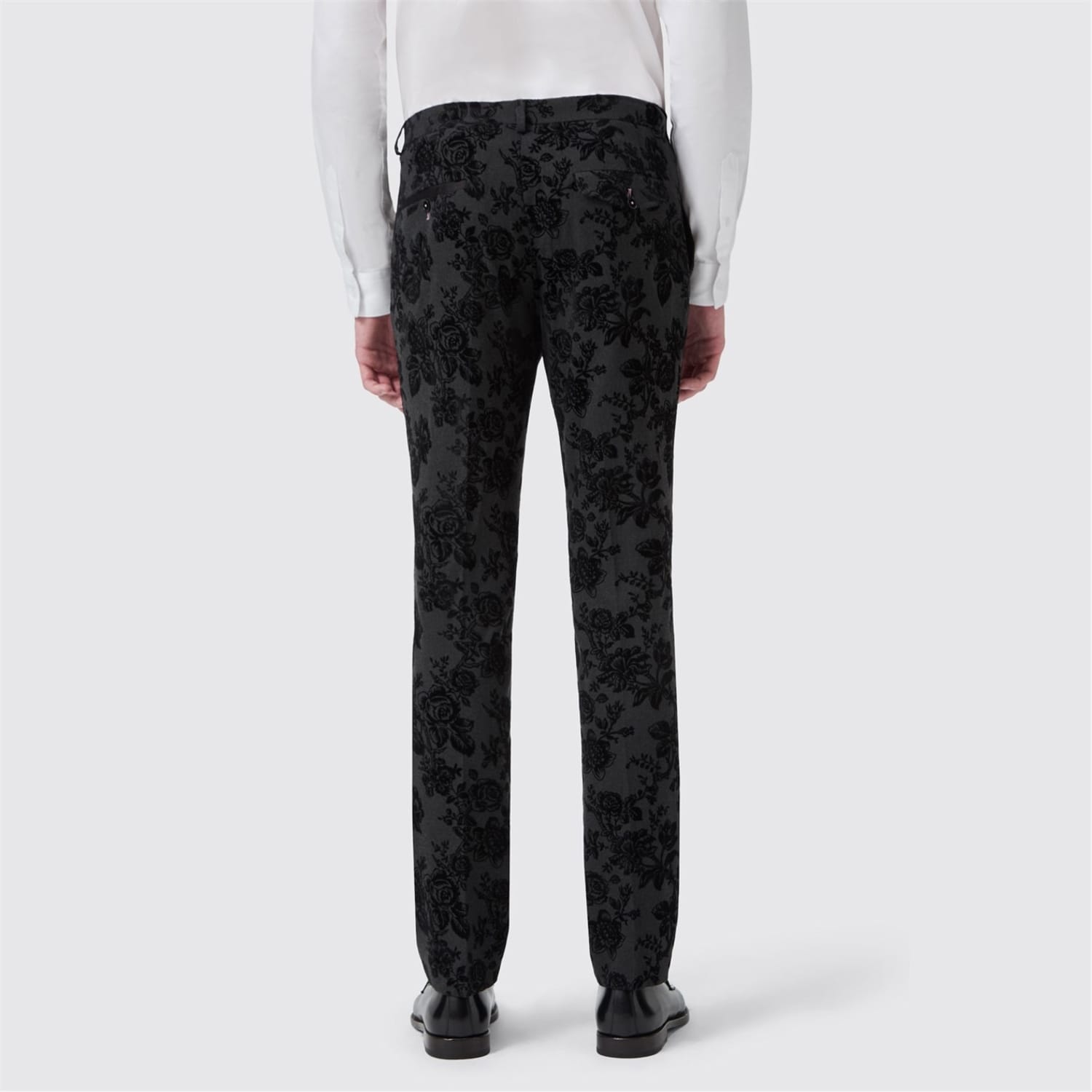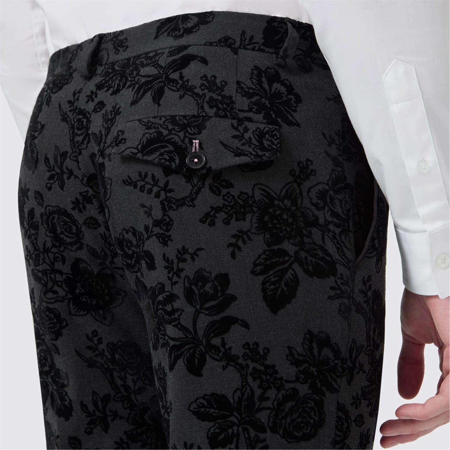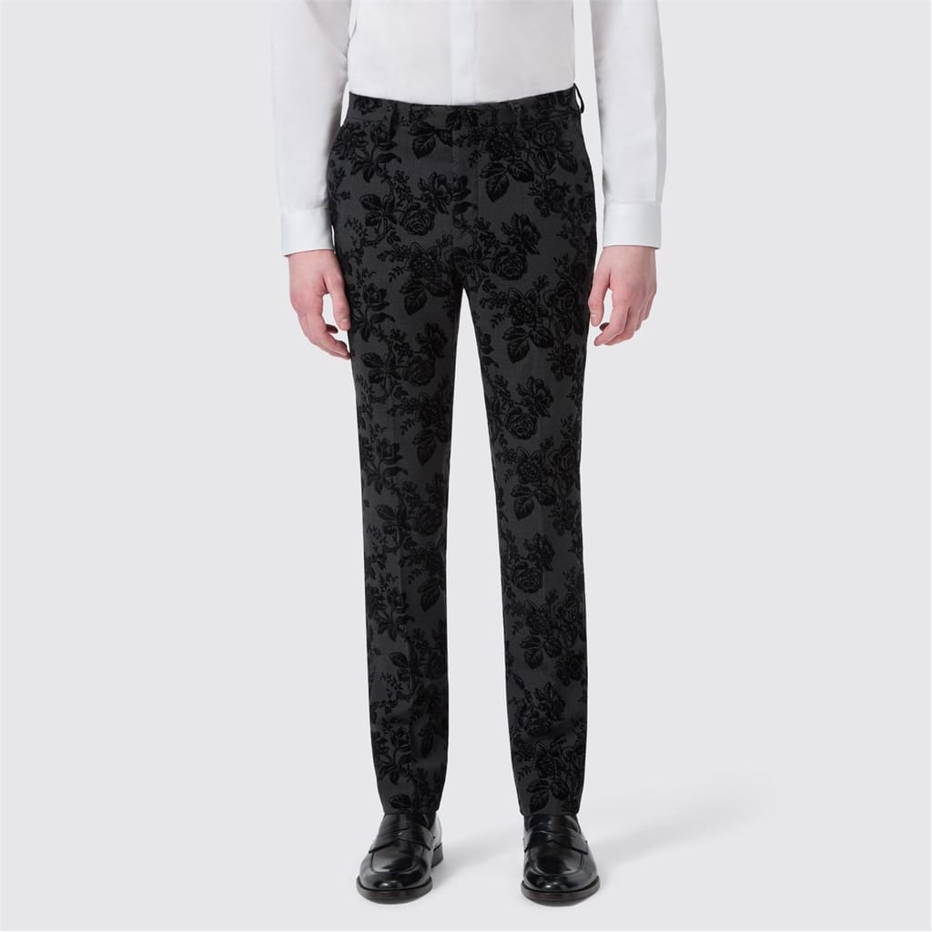 The Twisted Tailor Fleet Floral Tuxedo is the epitome of refined rebellion. This unique suit features a wool blend construction in a stretch fabric and contrast black sateen peak lapel. The flat front trousers are constructed with contrast piping on the slanted front pockets, belt loops and rear back pockets with the distinctive lime green thread stitching on the button holes. The black textured floral flocking adorns the suit, giving a darker edge to your evening wear ensemble. For maximum impact, pair it with the matching jacket and waistcoat, It's Twisted Tailors best selling suit for a reason.