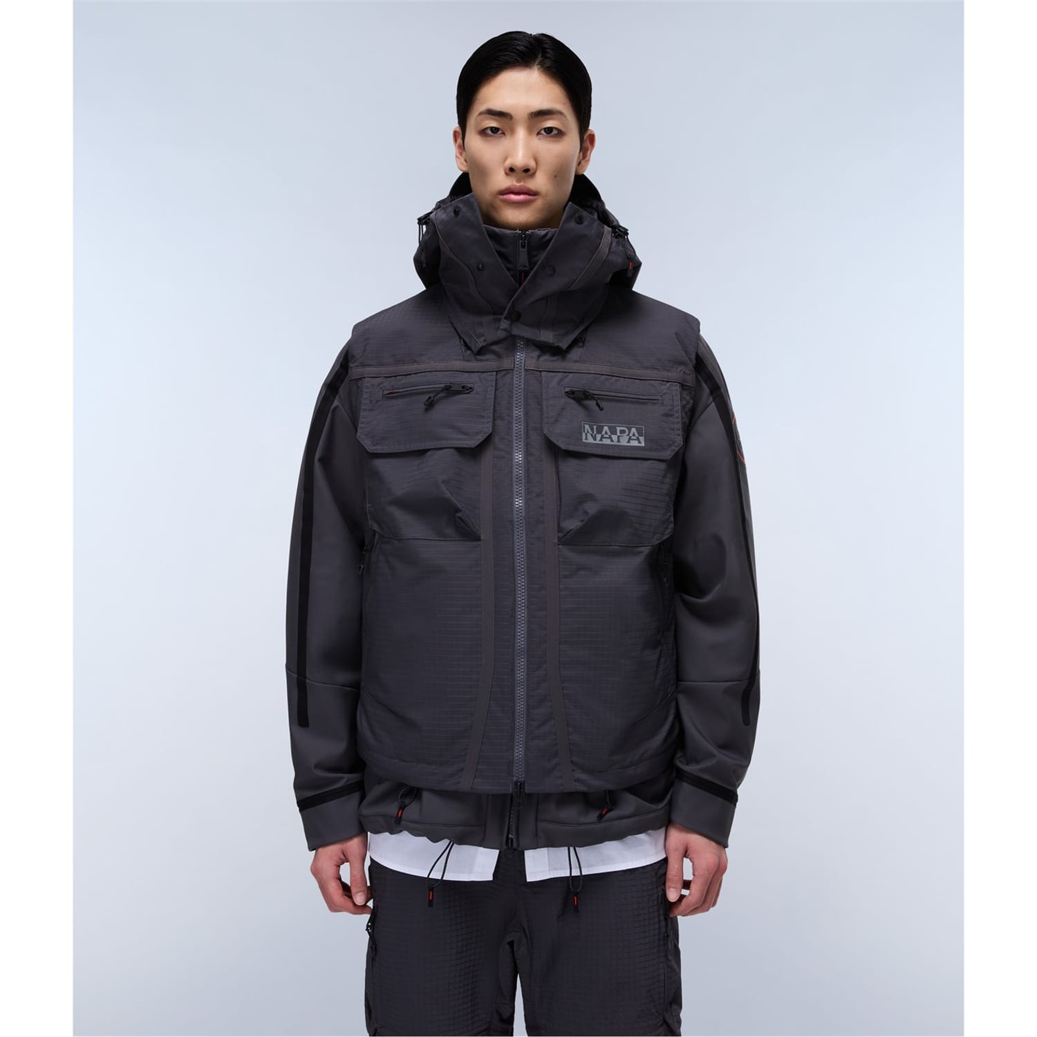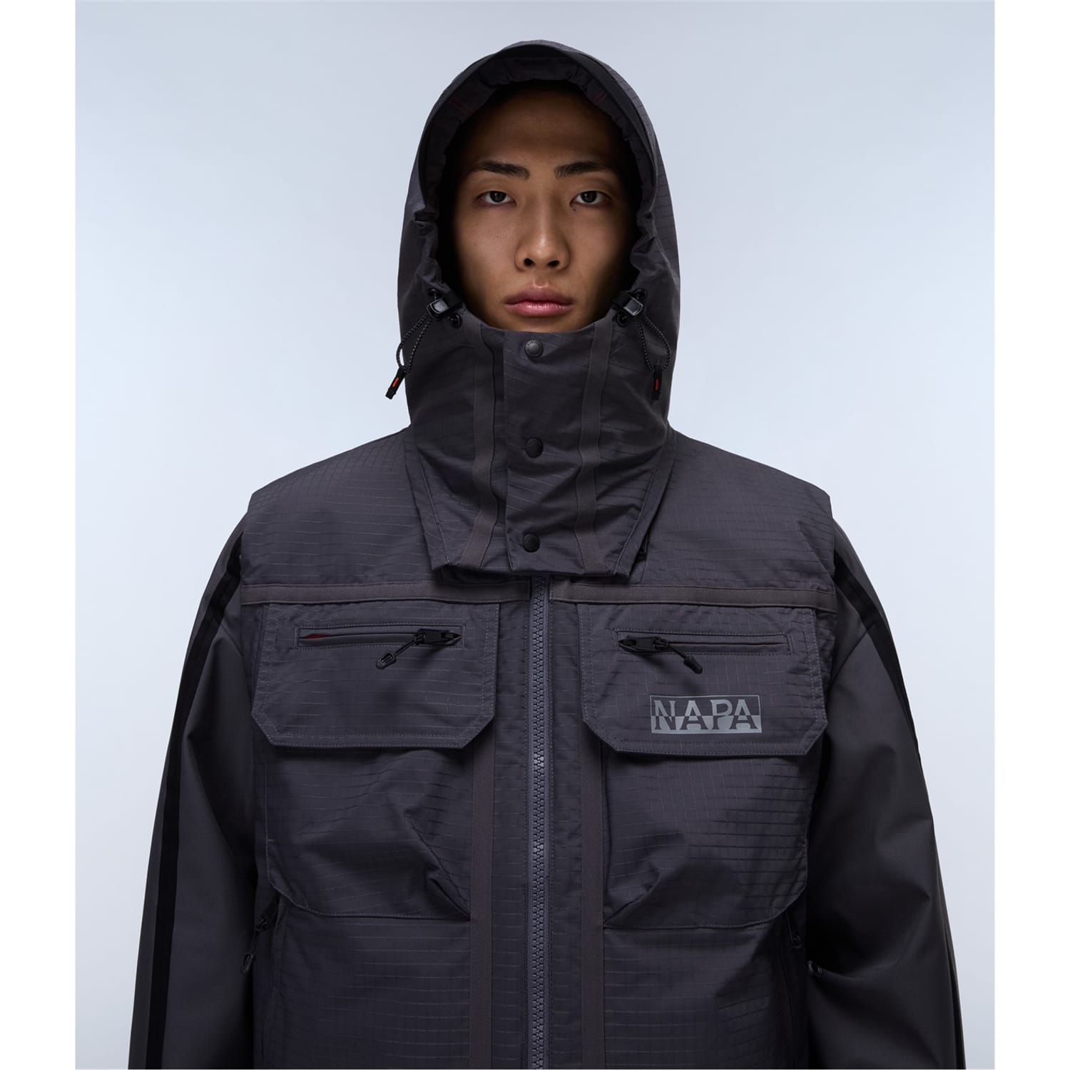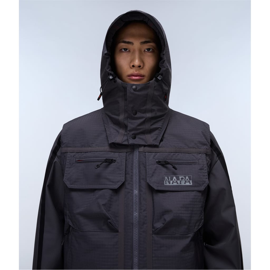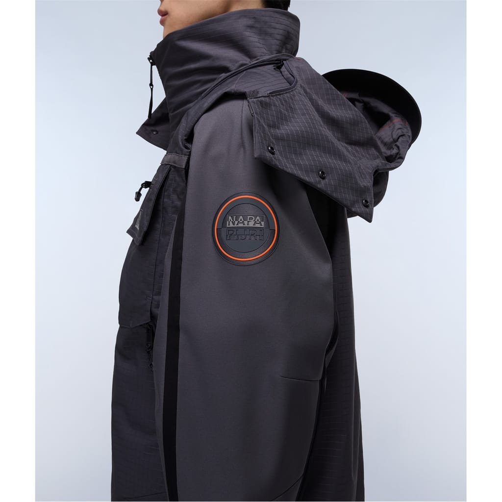 This Napapijri rain jacket is designed with a hooded neckline and a relaxed fit, offering both style and functionality. It features a water-repellent finish, ensuring protection against the elements. The jacket includes a zipper and snap button closure, complemented by practical embellishments such as pockets, a logo, a badge, a chest pocket, and front zipper pockets. The solid pattern and straight hem complete the look. -