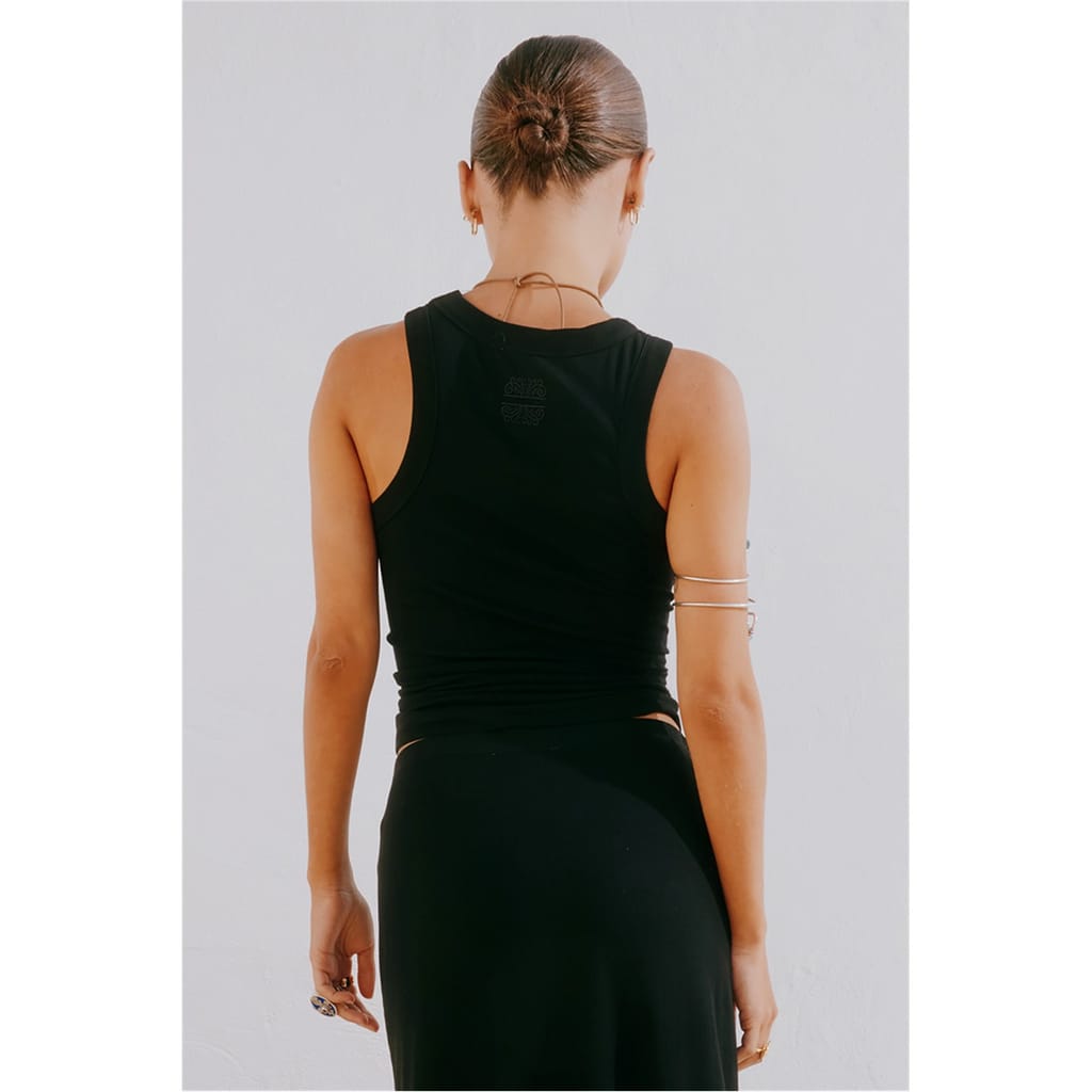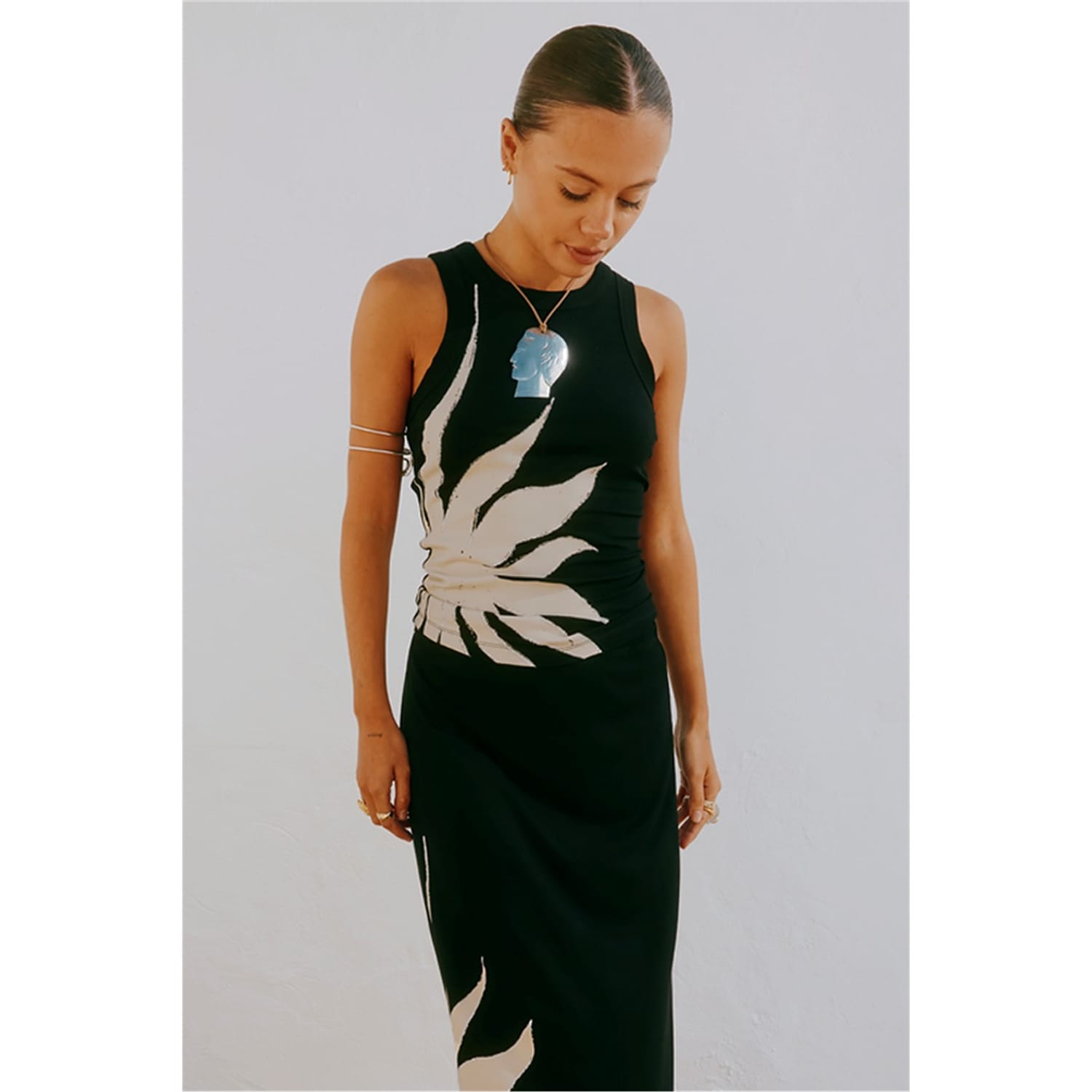 Discover the sleeveless top from Never Fully Dressed, featuring a crew neck and slim fit. This casual piece is adorned with an abstract pattern and a subtle logo embellishment, making it a stylish addition to your wardrobe. -