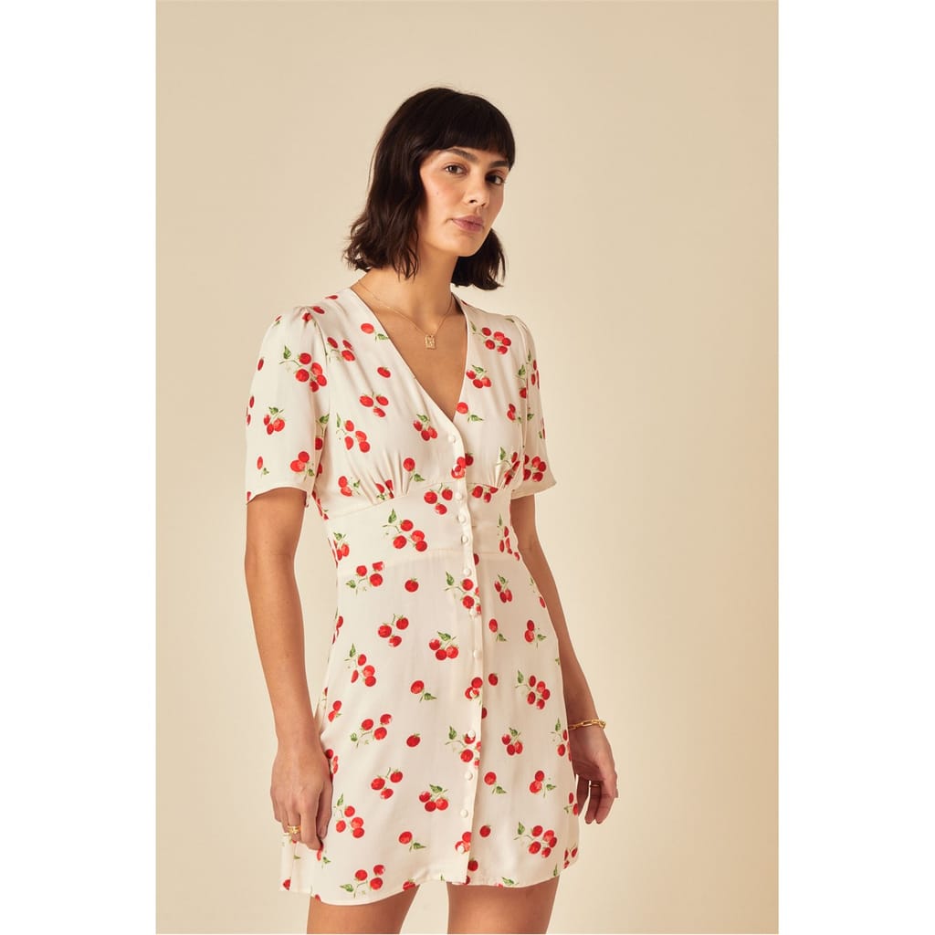 This mini A-line dress from Nobody's Child features a playful fruit pattern, perfect for adding a touch of fun to your wardrobe. The dress is designed with a flattering V-neck and charming puff sleeves, offering a stylish silhouette. A button closure and straight hem complete the look, while the regular fit ensures comfort and ease of movement. -