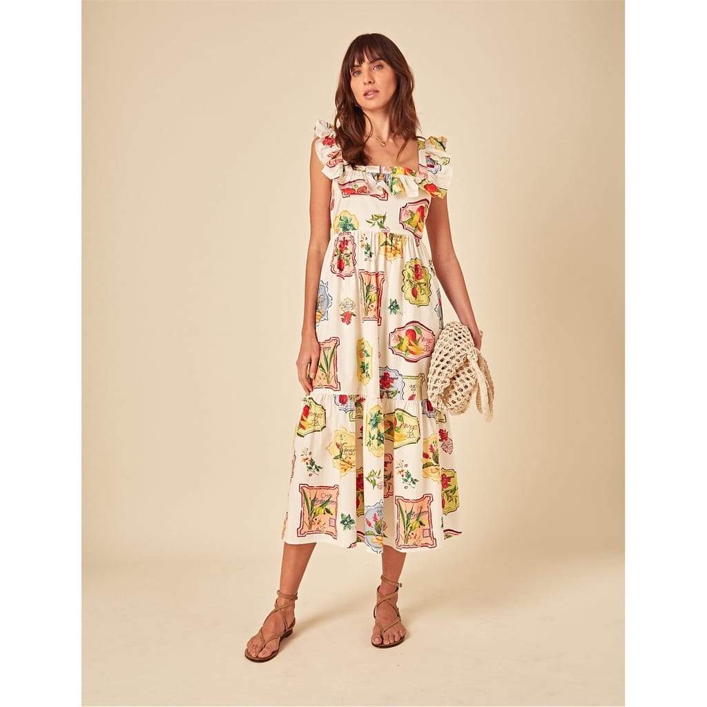 This midi A-line dress from Nobody's Child features a charming floral pattern. The square neckline and ruffle sleeves add a touch of elegance, while the straight hemline ensures a clean finish. Perfect for those seeking a stylish and comfortable option for various occasions. -
