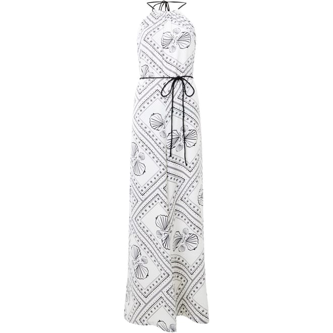 Discover the French Connection jumpsuit, featuring a geometric pattern that adds a modern touch. This sleeveless piece boasts a halter neckline and a tie closure, ensuring a comfortable and stylish fit. Designed with a relaxed fit, it offers both elegance and ease for any occasion. -