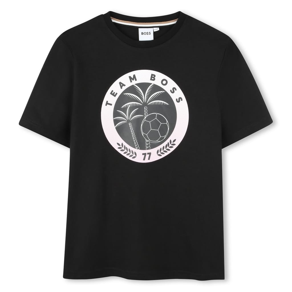 This Boss top for juniors features a regular fit and a striking graphic print with a football font. The short sleeves and crew neck design offer a comfortable and stylish look. The top is embellished with a logo, adding a touch of brand identity. -
