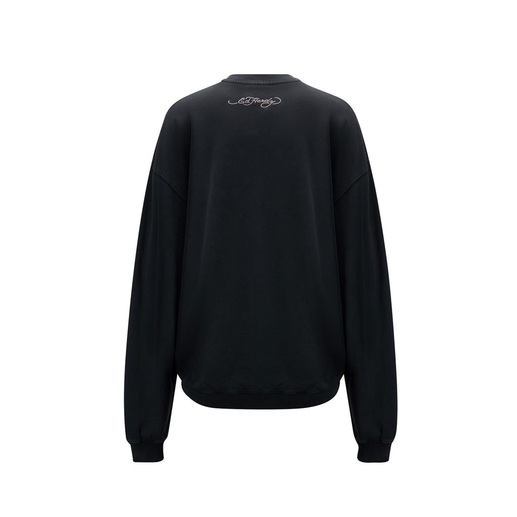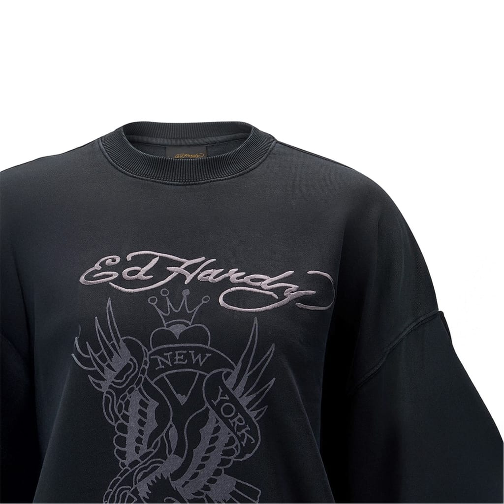 Ed Hardy NYC sweatshirt is a standout piece in your wardrobe. Featuring a crew neck and long sleeves with a drop shoulder design, this top provides a relaxed fit. It boasts ribbed cuffs and collar for added comfort. The sweatshirt is adorned with embroidered logos and striking graphic prints, adding a unique touch to its design. -