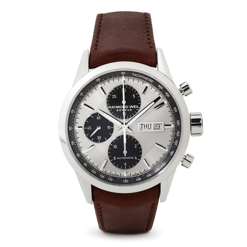 Redesigned to combine sophistication with a powerful look, RAYMOND WEIL’s newest edition of its best-seller, chronograph, embodies the freelancer collection’s free-spirit. The freelancer chronograph combines sophistication with a powerful and extremely stylish aesthetic. Equipped with a chronograph and day and date functions, this Freelancer watch will tempt you with its smooth design. Powered by a mechanical self-winding RW5200 movement providing a 46-hour power reserve, this latest addition to the freelancer collection features a sophisticated antique brown leather strap. Its style is assured and it will be with you every step of the way, both throughout your sporting adventures and on special occasions. -