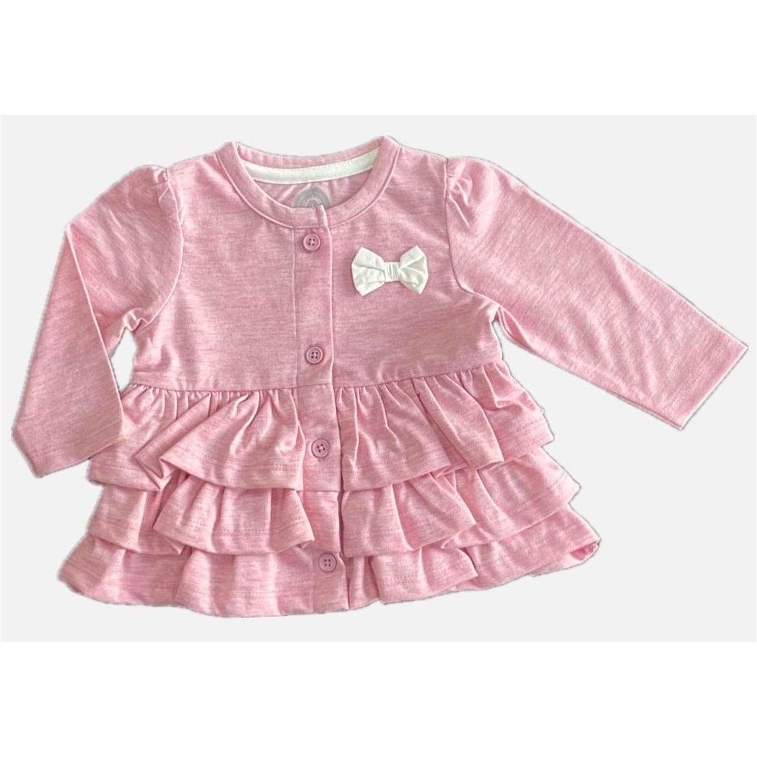 - Button-down front with pink buttons