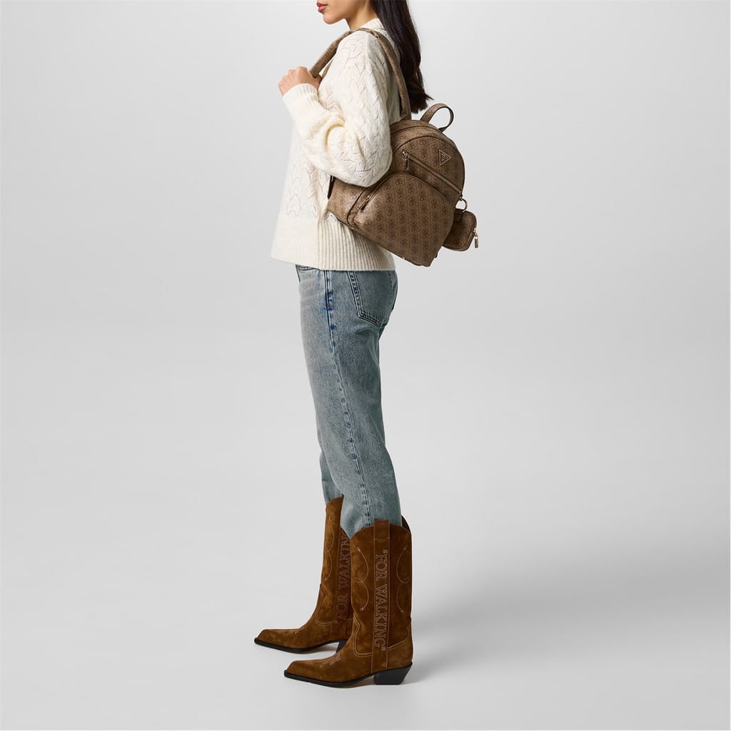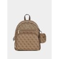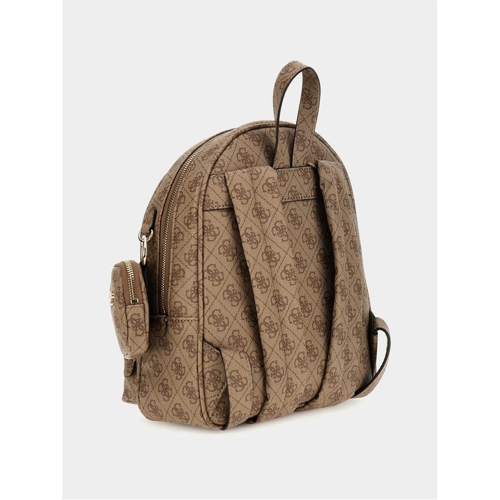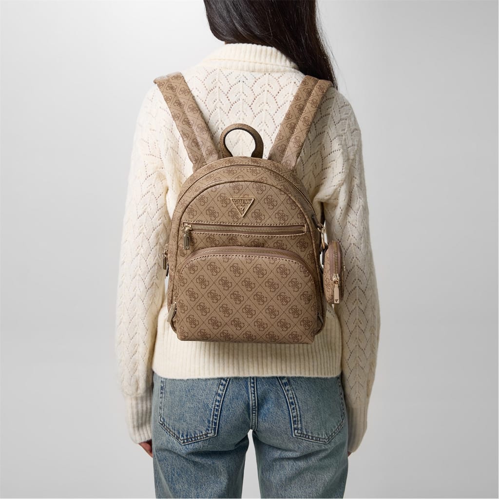 Discover the Guess backpack, featuring a stylish all-over logo pattern. This backpack is designed with a convenient top handle and a secure zipper closure. It includes a front zipper pocket for added functionality. The iconic Guess logo and monogram embellishments add a touch of brand identity, making it a perfect choice for those who appreciate both style and practicality. -