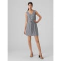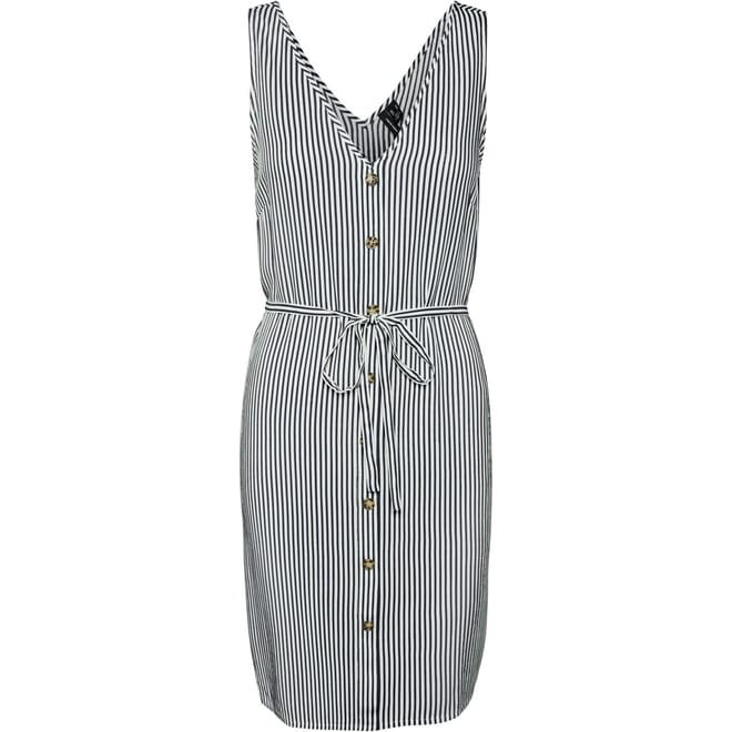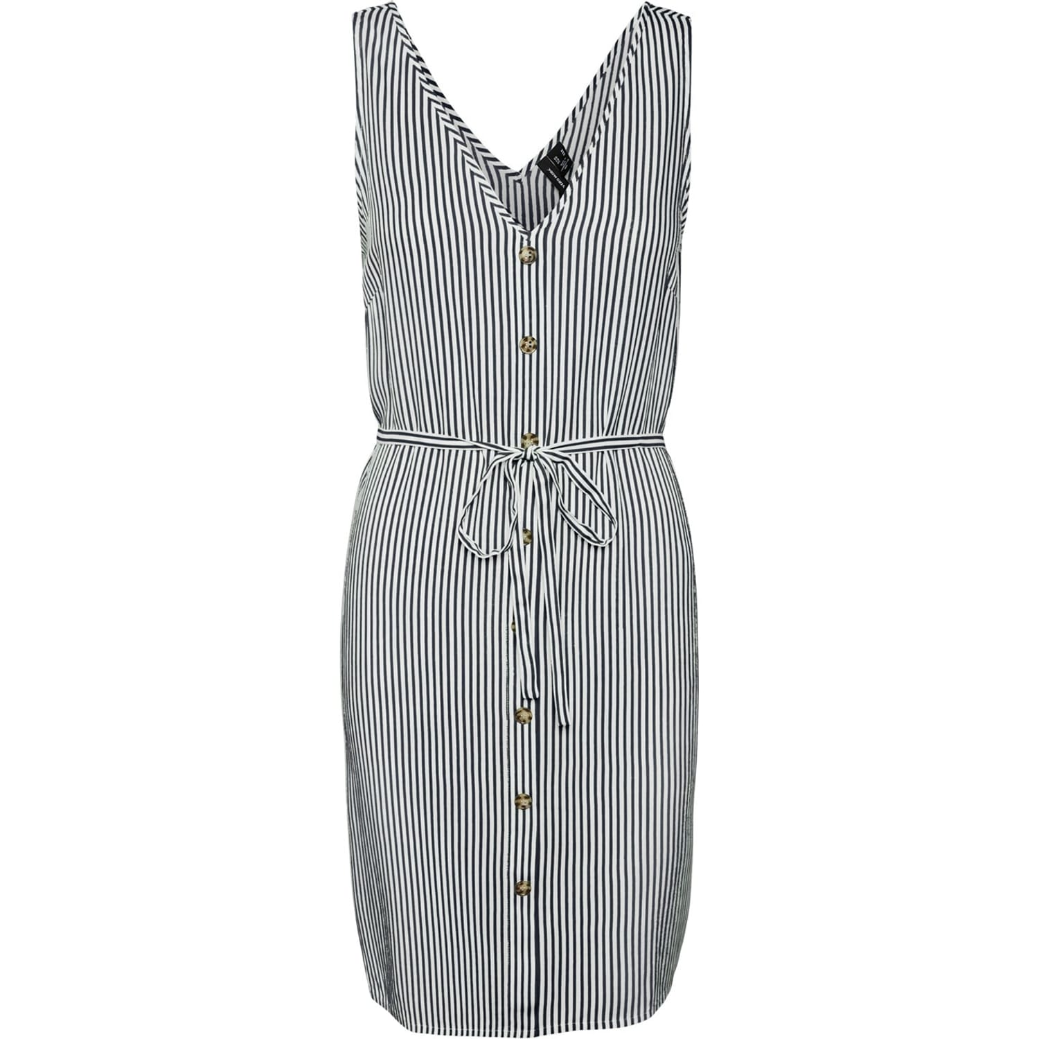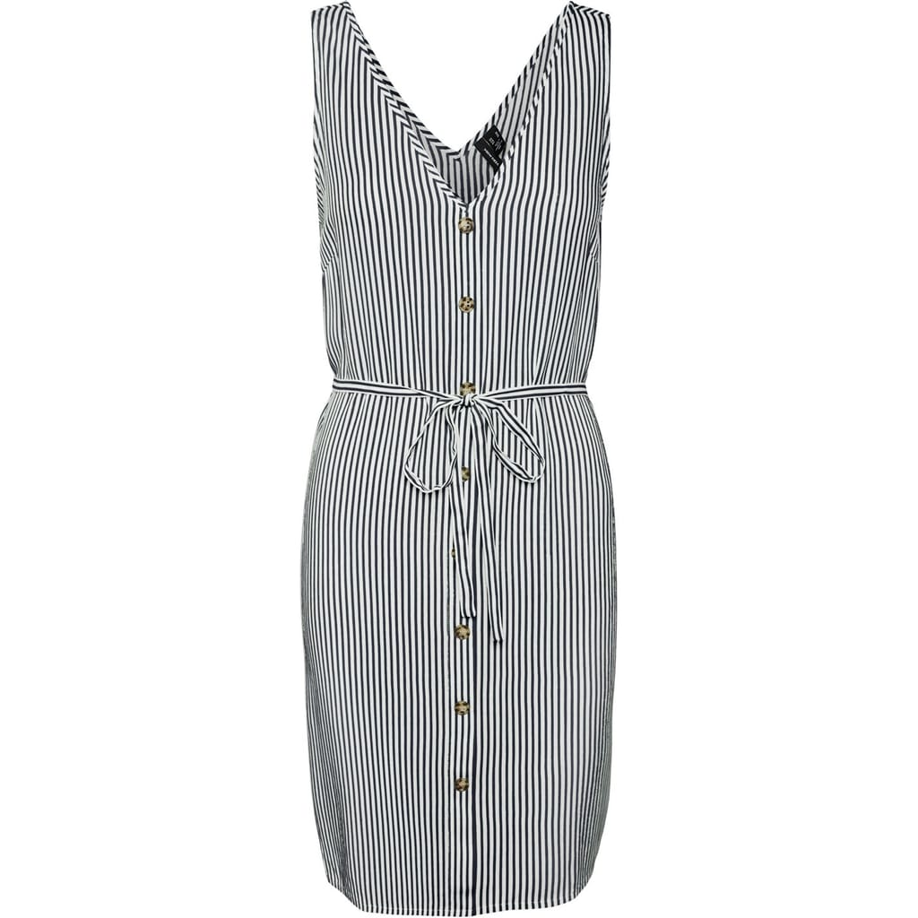 This Vero Moda mini dress features a classic A-line style with a V-neck and a button closure. The dress showcases a striking stripe pattern and a straight hem, offering a regular fit. Perfect for those seeking a stylish and contemporary look. -