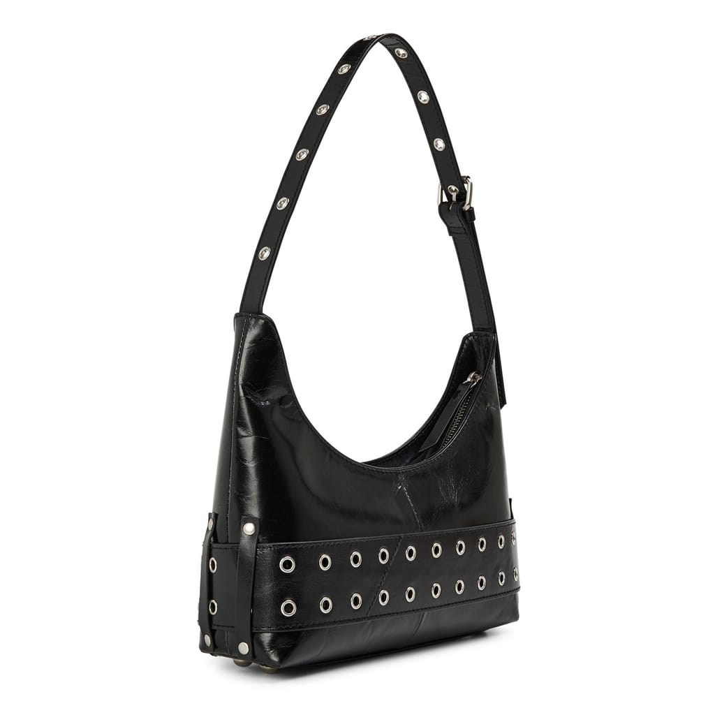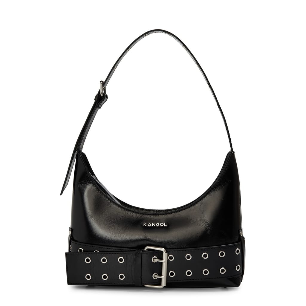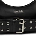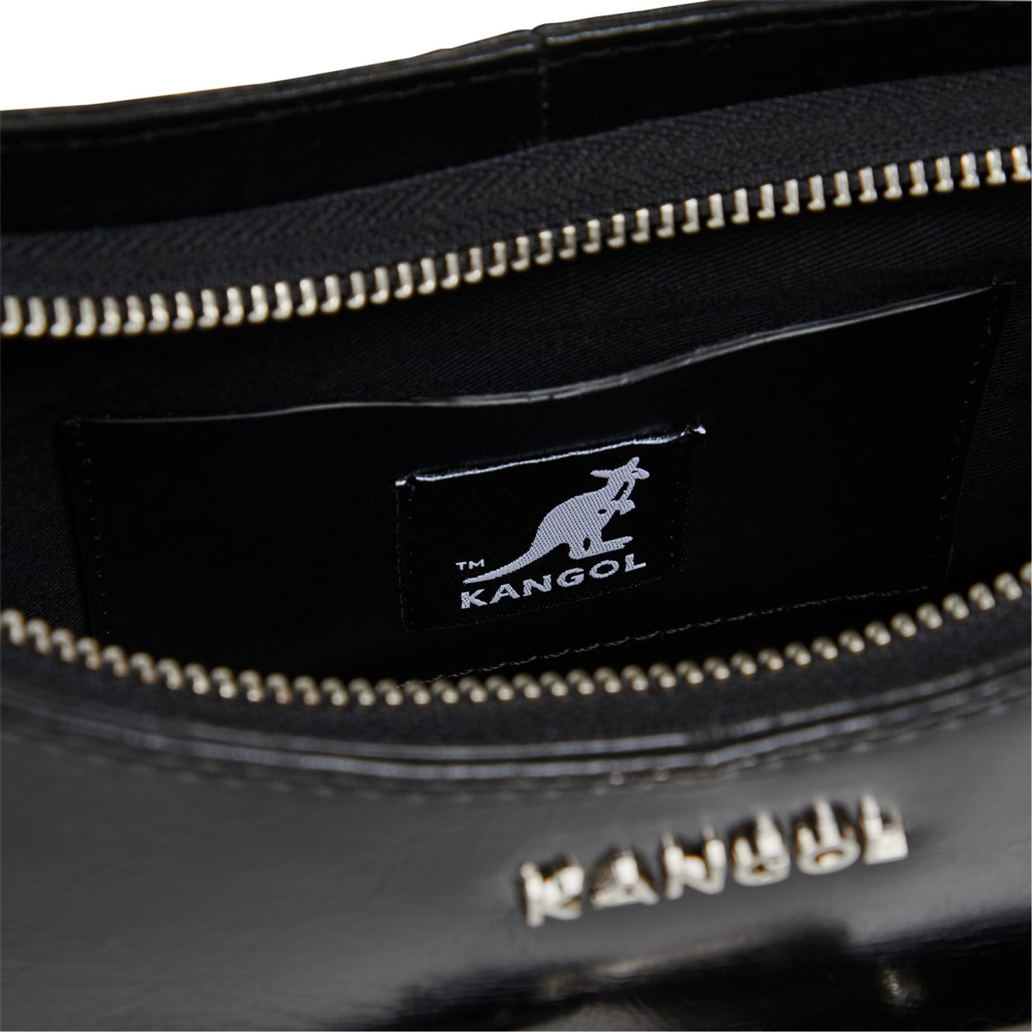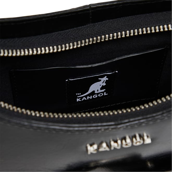 Discover the Kangol hobo bag, a stylish accessory featuring a shoulder handle for comfortable carrying. This bag is designed with a secure buckle and zipper closure, ensuring your belongings are safe. Adorned with a distinctive metal logo and eyelet embellishments, it offers a touch of elegance and brand recognition. Perfect for those seeking a blend of functionality and style. -