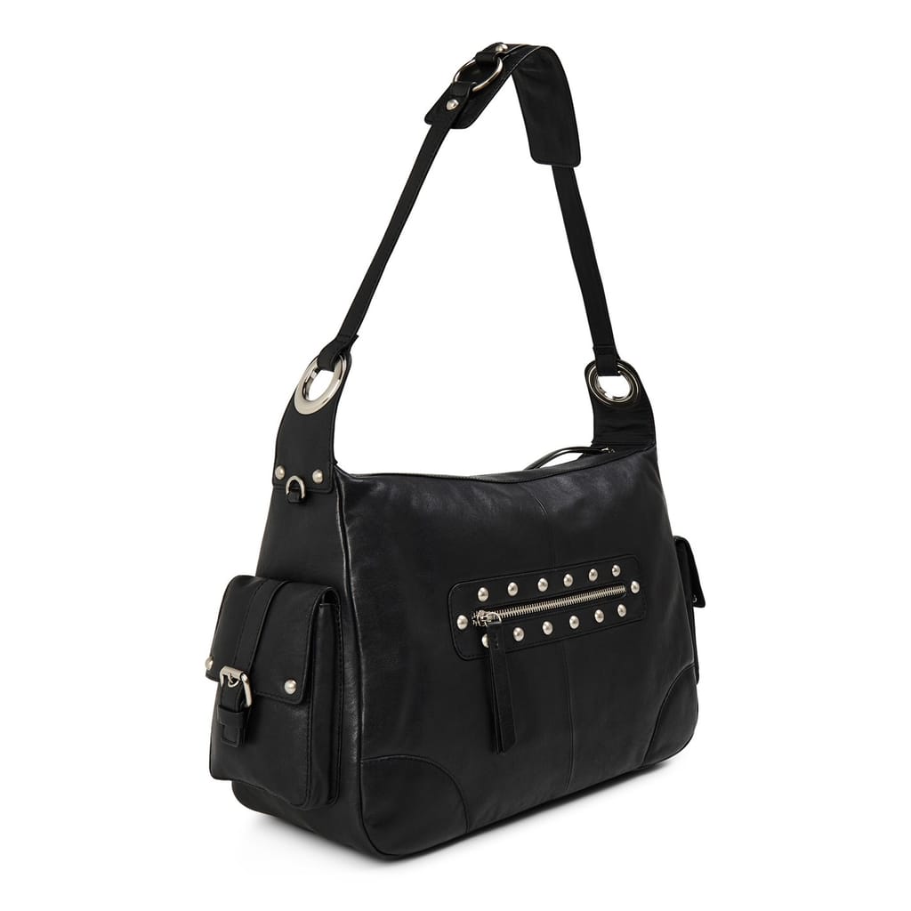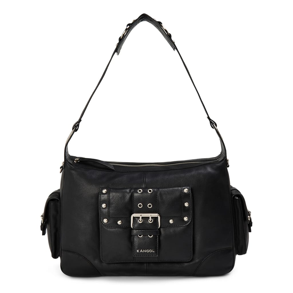 Discover the Kangol hobo bag, a stylish addition to your collection. This shoulder bag features a secure buckle and zipper closure, ensuring your belongings are safe. Adorned with stud embellishments and a metal logo, it offers a touch of elegance. The practical design includes a pocket for added convenience, making it a versatile choice for any occasion. -