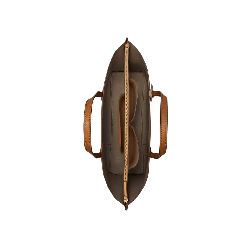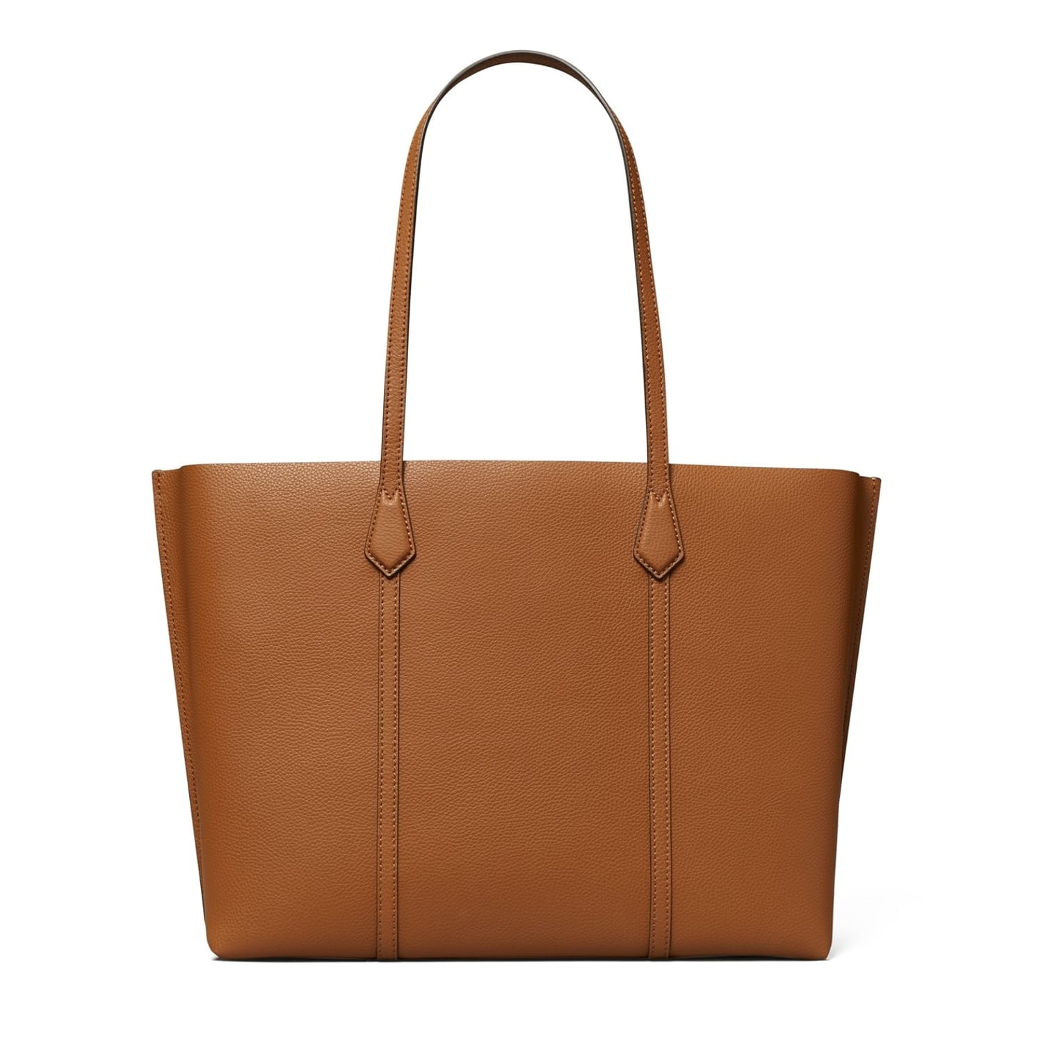 Update your accessories with the Perry Large Tote from Tory Burch. With a spacious main compartment that can hold a 13" laptop the Perry tote also offers 4 interior compartments for added storage. Crafted from Italian pebbled leather this bag is finished with a removable charm featuring the brands signature double T hardware.