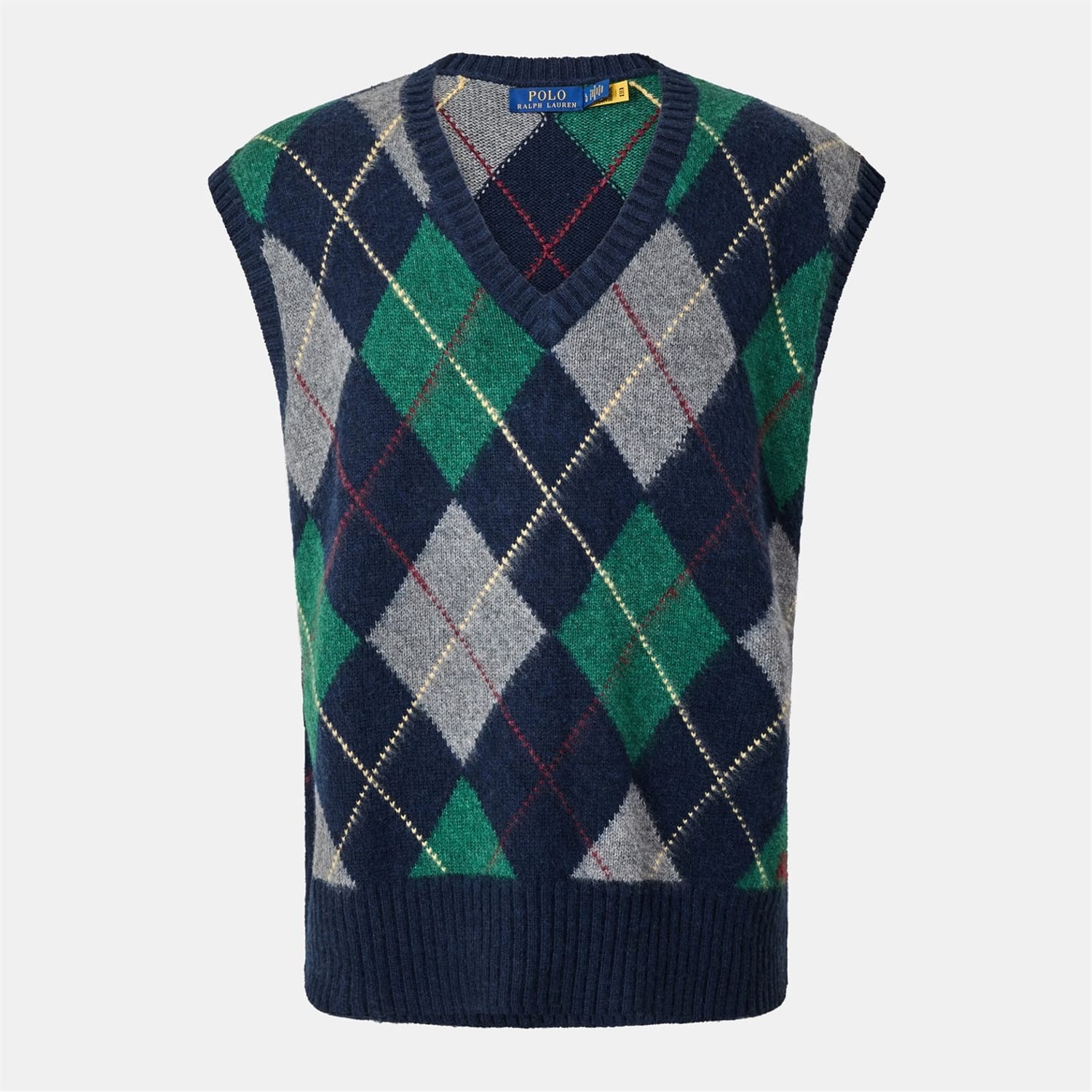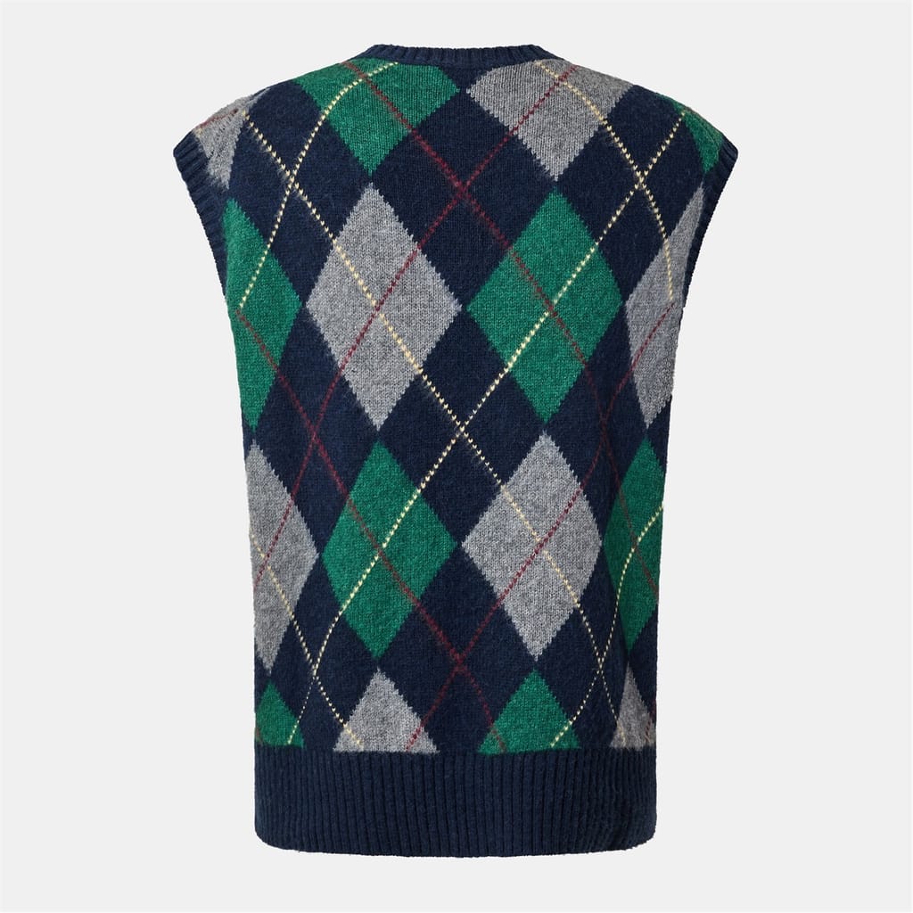 This Polo Ralph Lauren top features a striking argyle pattern, complemented by a V-neckline and sleeveless design. Embellished with crystals and a subtle logo, it offers a unique blend of style and sophistication. -