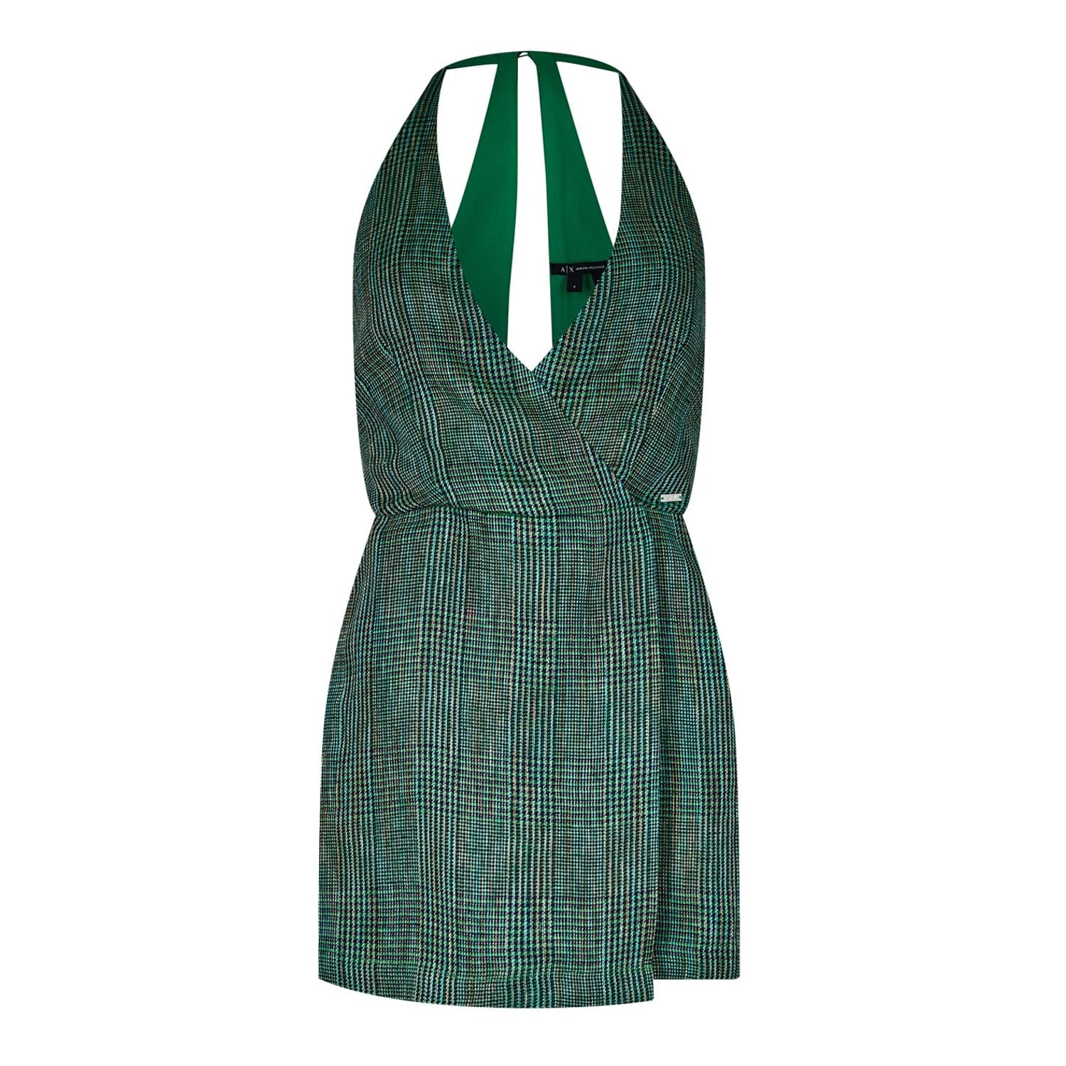 This Armani Exchange mini dress features a chic wrap style with a halter neckline, perfect for a modern look. The plaid pattern adds a touch of classic elegance, making it a versatile choice for various occasions. -