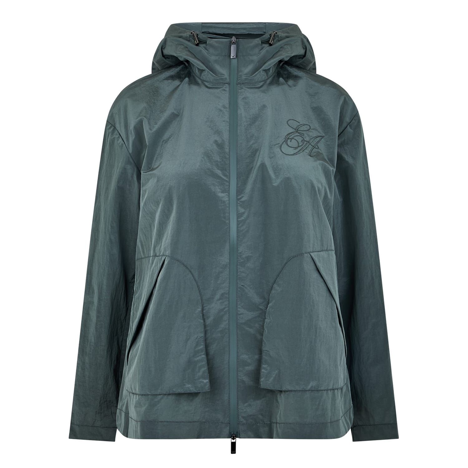 Explore the Emporio Armani Softshell Jacket, designed with a hooded neckline for added style. The jacket showcases a solid pattern and features a straight hem and a relaxed fit. It has a practical zipper closure and includes an elegant embroidered logo, adding a touch of sophistication to this essential piece. -