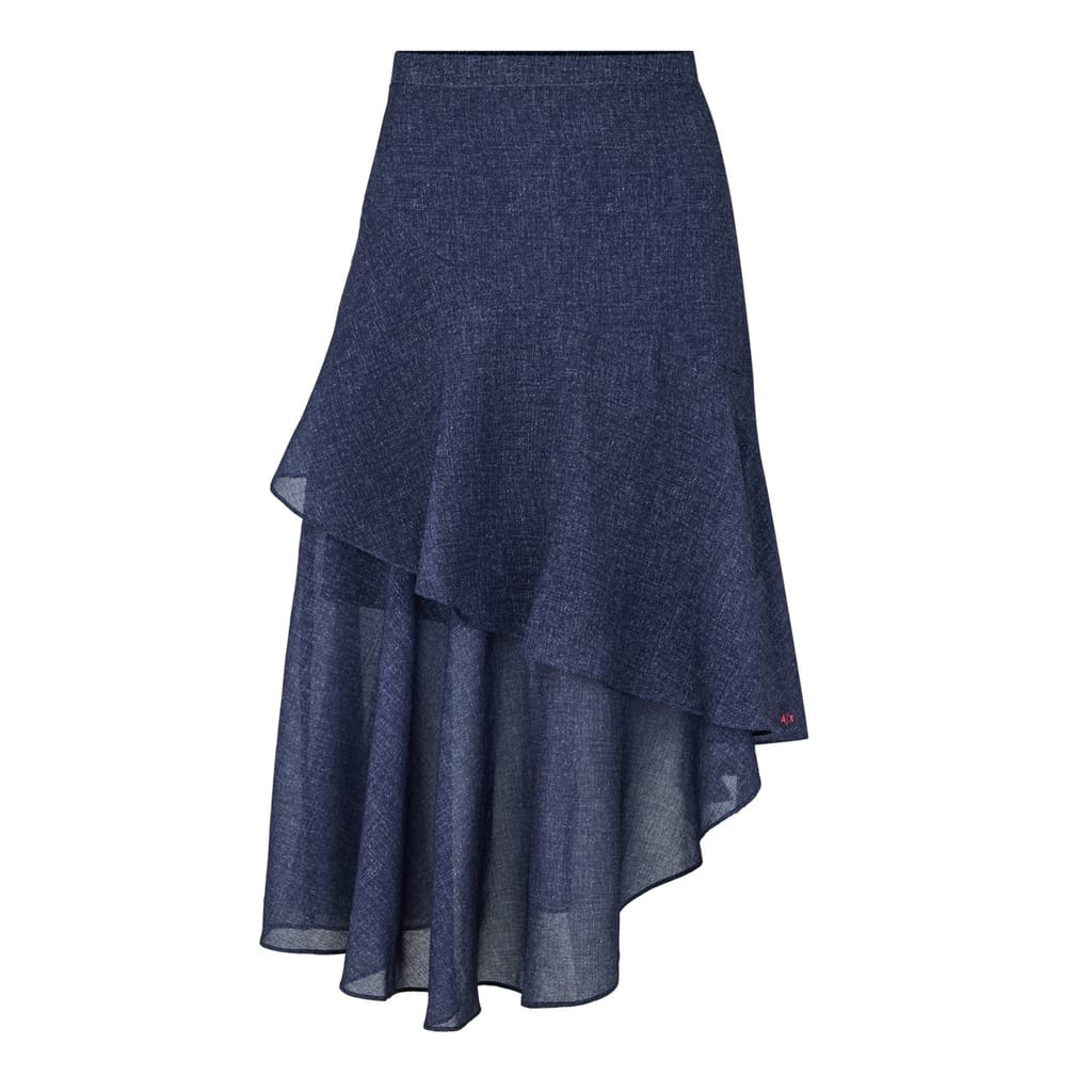 This Armani Exchange midi skirt features an asymmetrical design with elegant ruffle embellishments. Perfect for casual collections, it offers a unique style that stands out. -