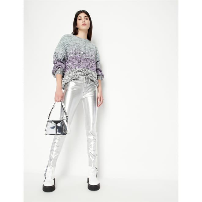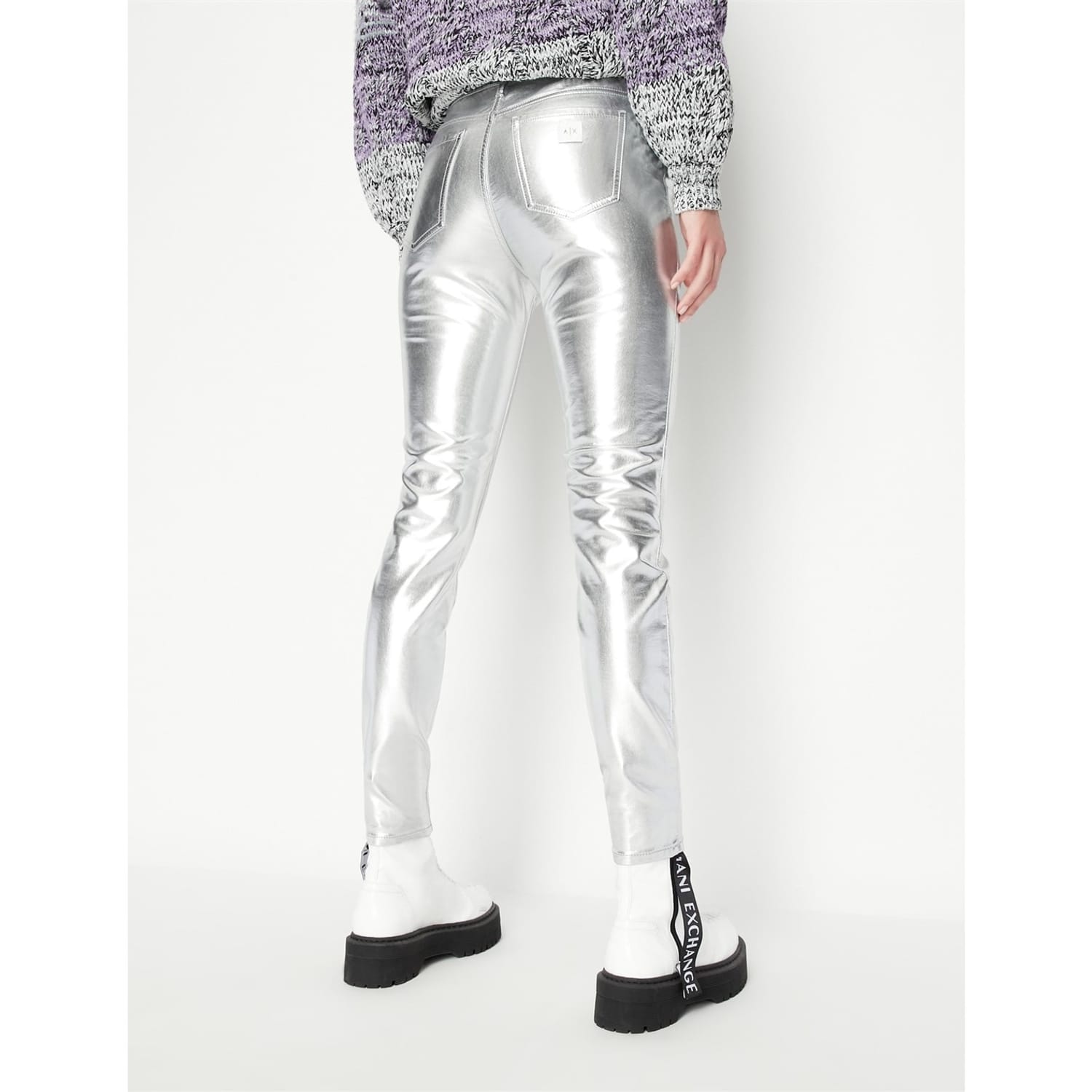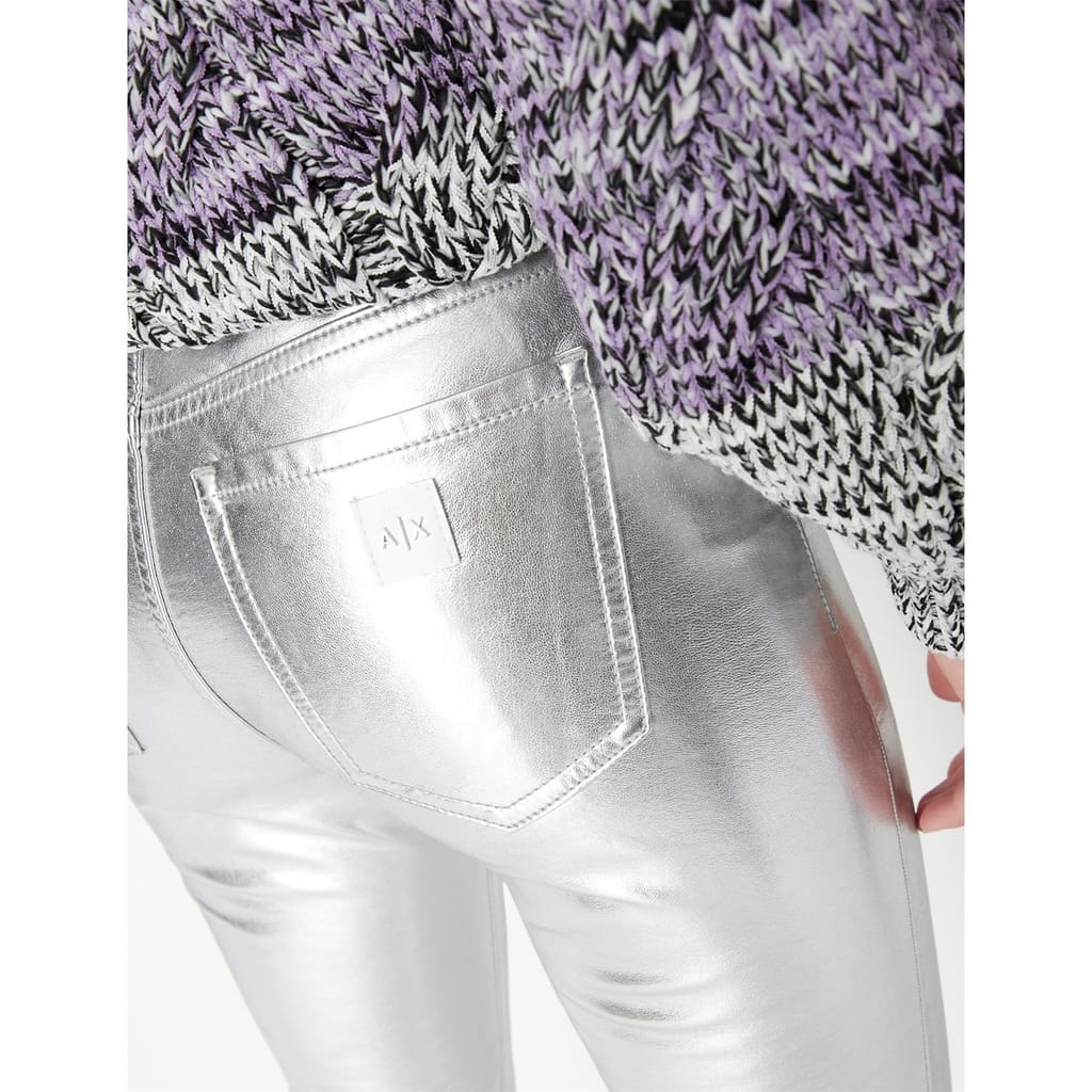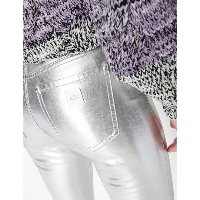Discover the Armani Exchange metallic pants, featuring a stylish zip fly and button closure. These pants are designed with practical pockets, offering both functionality and a modern aesthetic. Perfect for those seeking a blend of fashion and utility. -