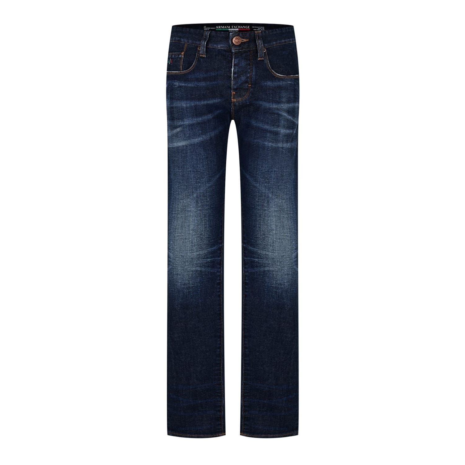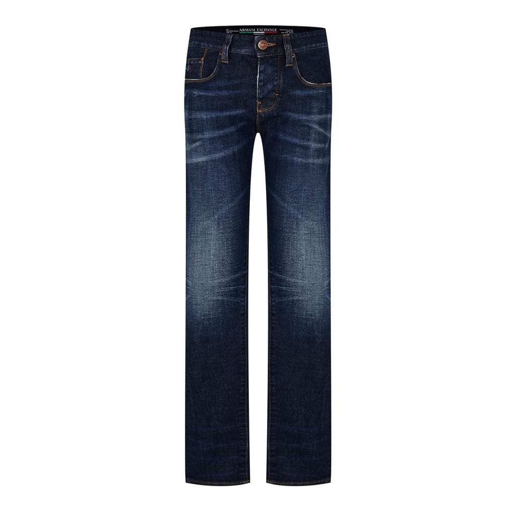 Armani Exchange presents these classic jeans featuring a dark wash and a straight fit. The five-pocket design is complemented by a button and zip fly closure, offering both style and functionality. A subtle logo embellishment adds a touch of brand identity, making these jeans a versatile addition to any wardrobe. -