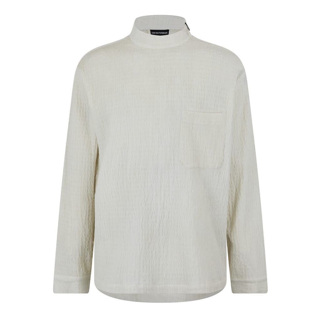 This Emporio Armani jacket combines the classic styles of Harrington and bomber designs. It features a mock neck, curved hem, and a relaxed fit, providing comfort and style. The ribbed pattern adds a subtle texture, while pockets offer practicality. Ideal for those seeking a versatile outerwear piece. -