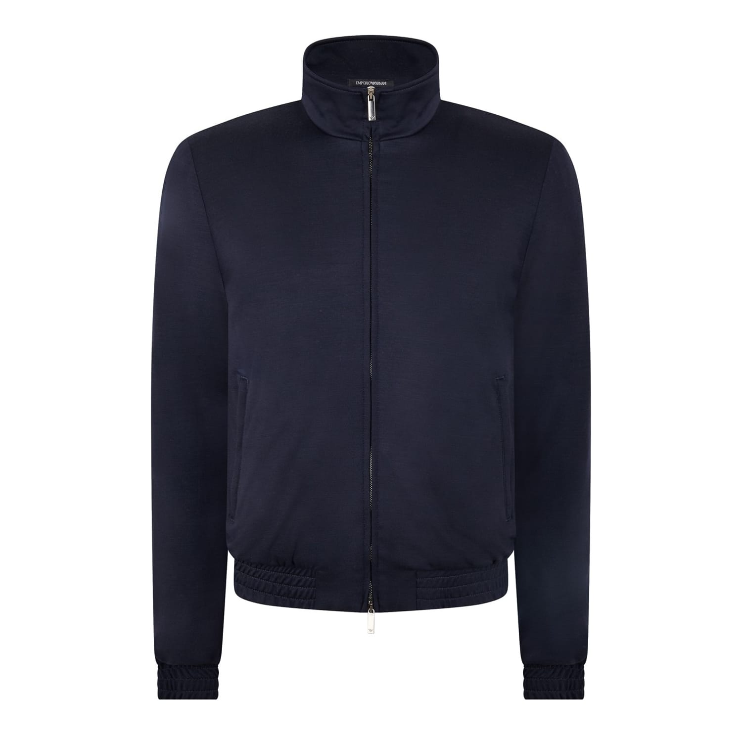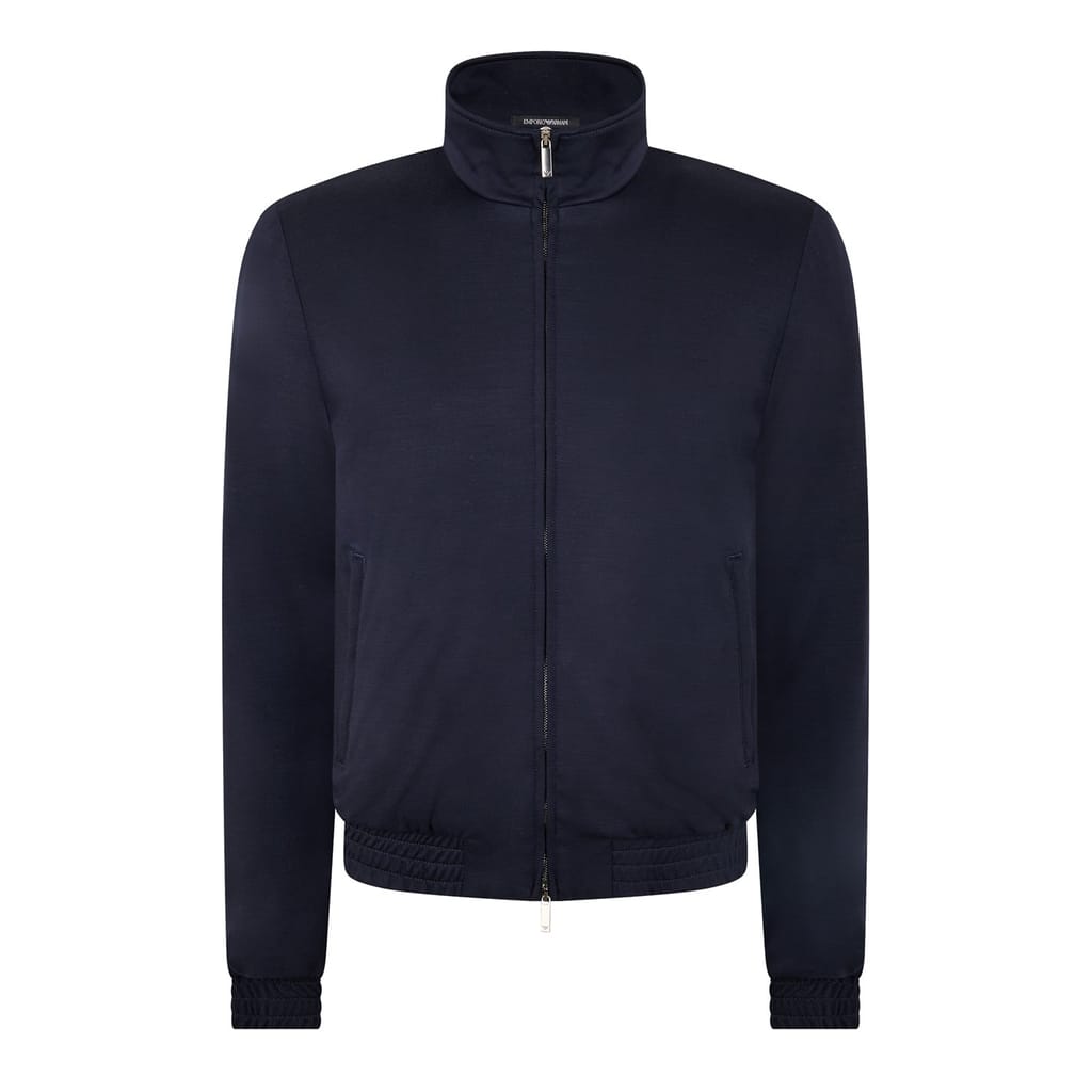 This Emporio Armani harrington jacket features a classic design with a high neck and ribbed cuffs. Made in a short length, it showcases a solid pattern with a regular fit. The jacket includes a zipper closure for convenience and is adorned with a logo embellishment. Practicality is enhanced with pockets and a ribbed hem, making it a stylish choice for any occasion. -