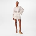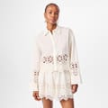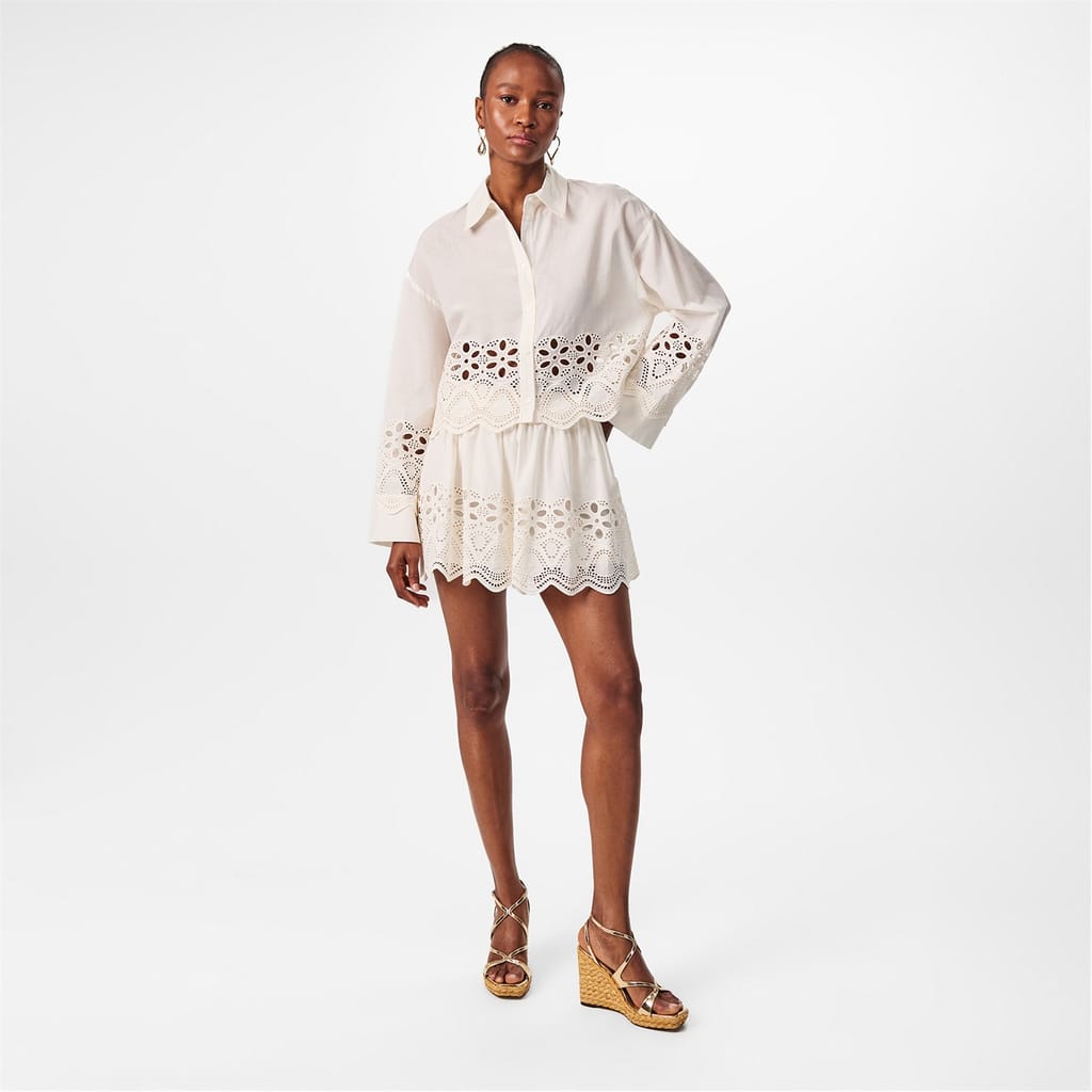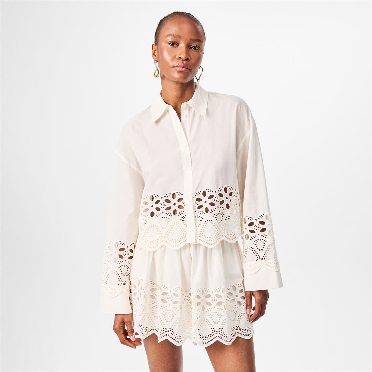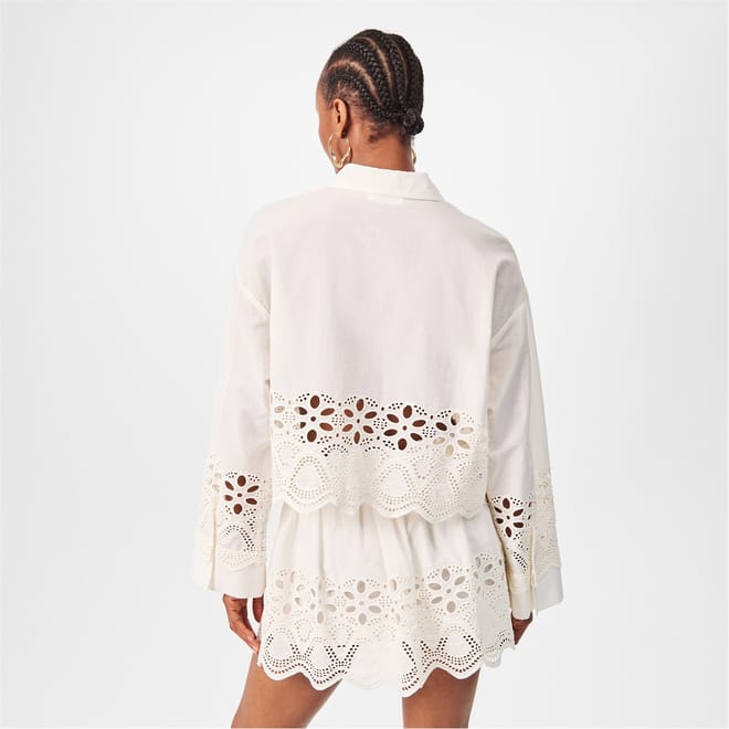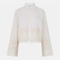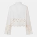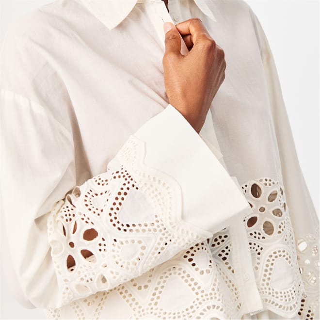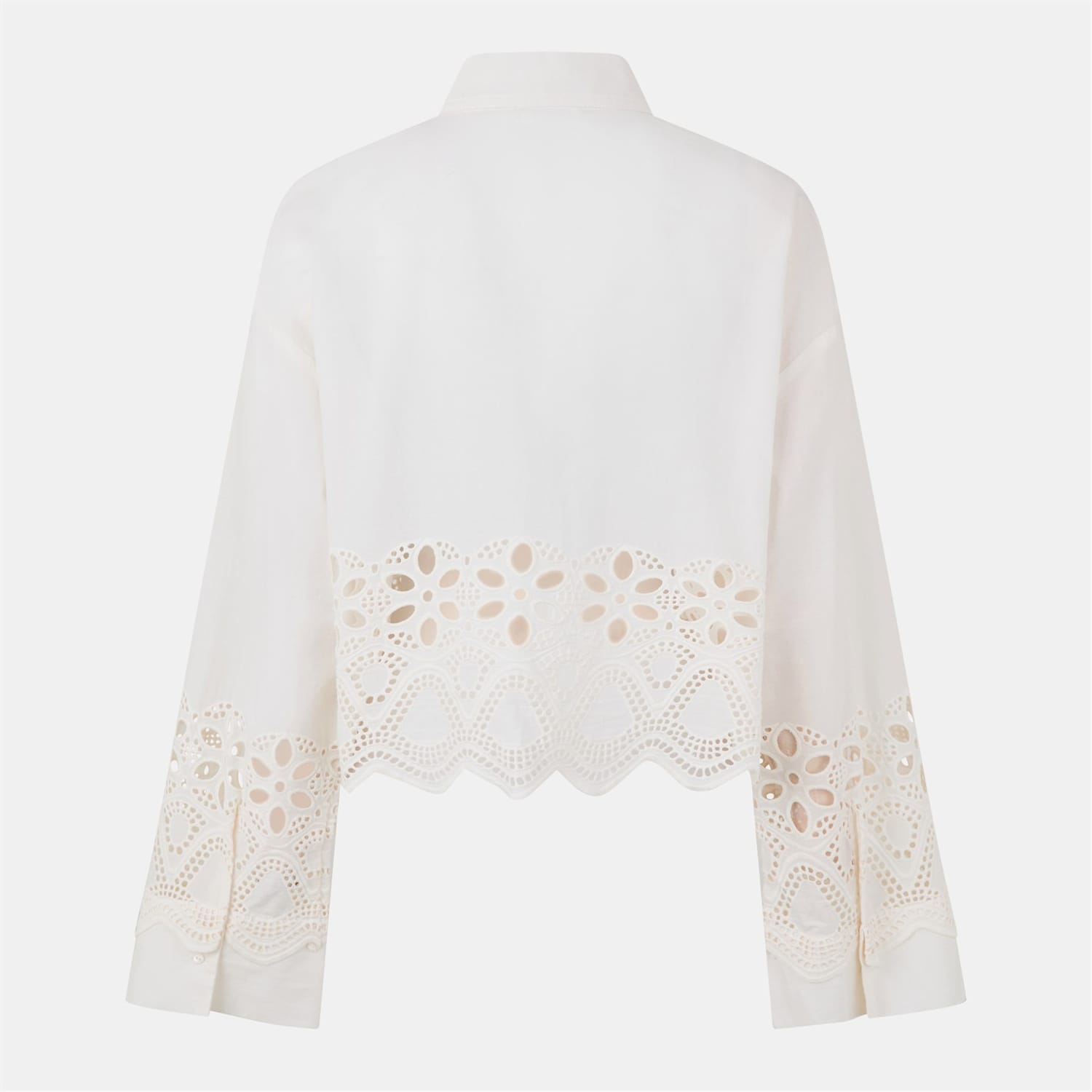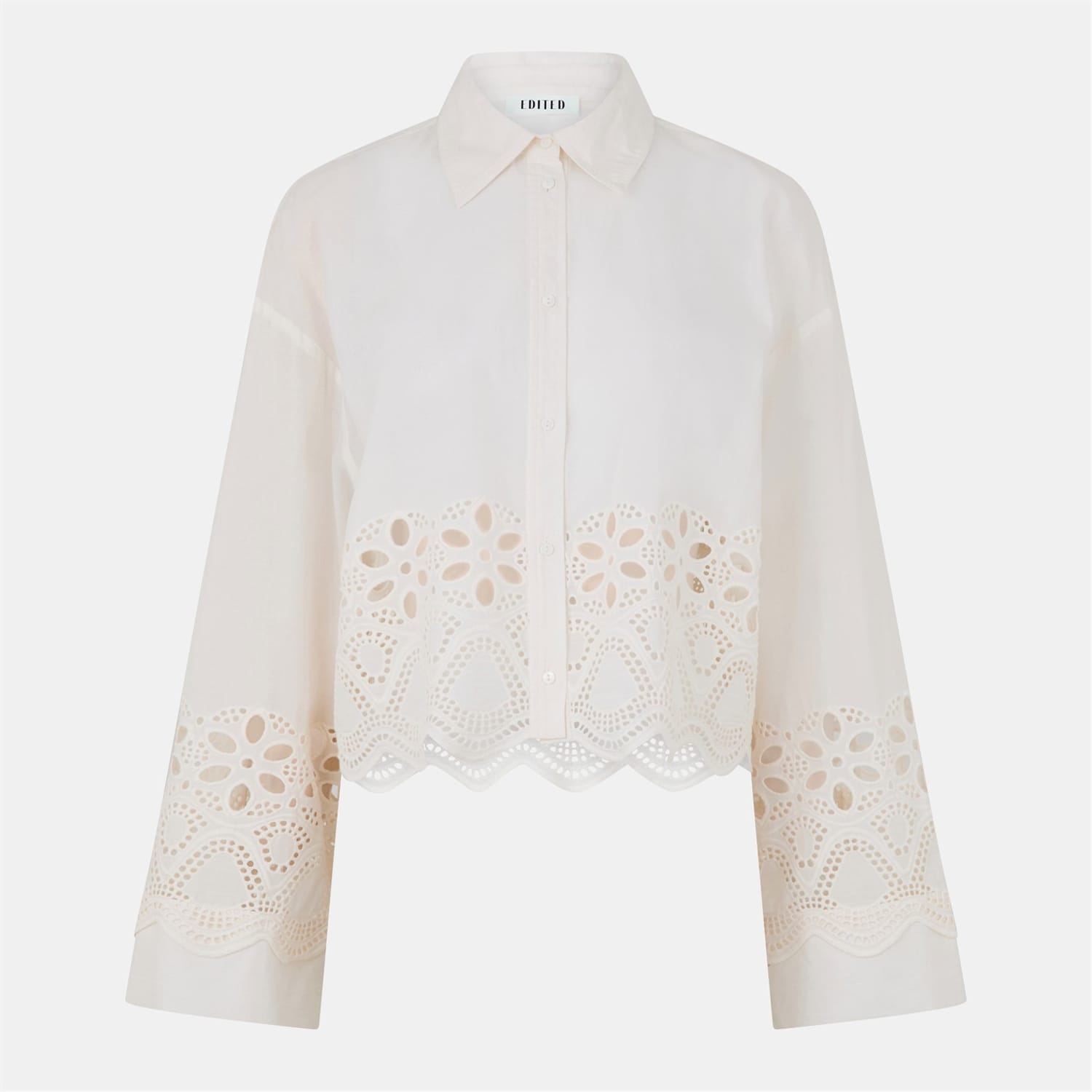 Long sleeved cropped collared shirt with eyelet embroidered details on hem and sleeves