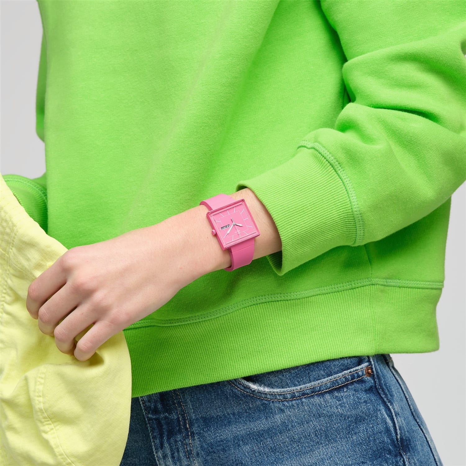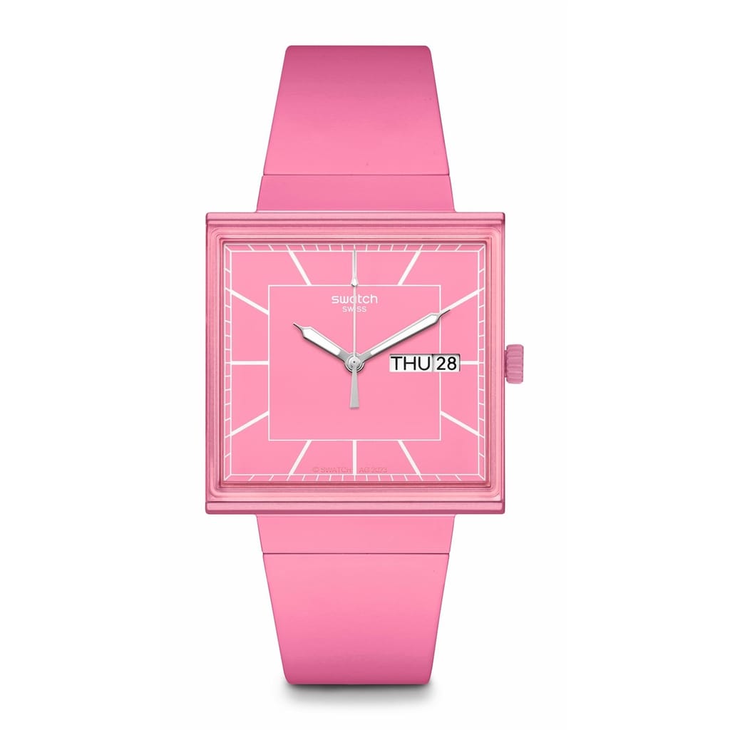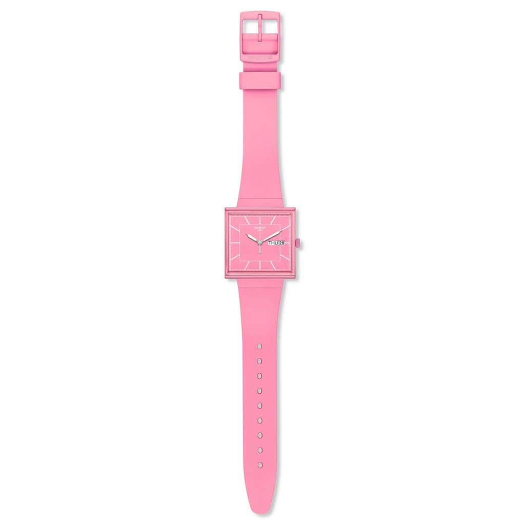 Discover the Swatch wrist watch, a stylish timepiece featuring a pink dial and an analogue display. This watch is designed with a durable rubber strap in a single wrap style, ensuring comfort and a secure fit. Perfect for those who appreciate a blend of functionality and modern design in their accessories. -