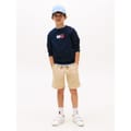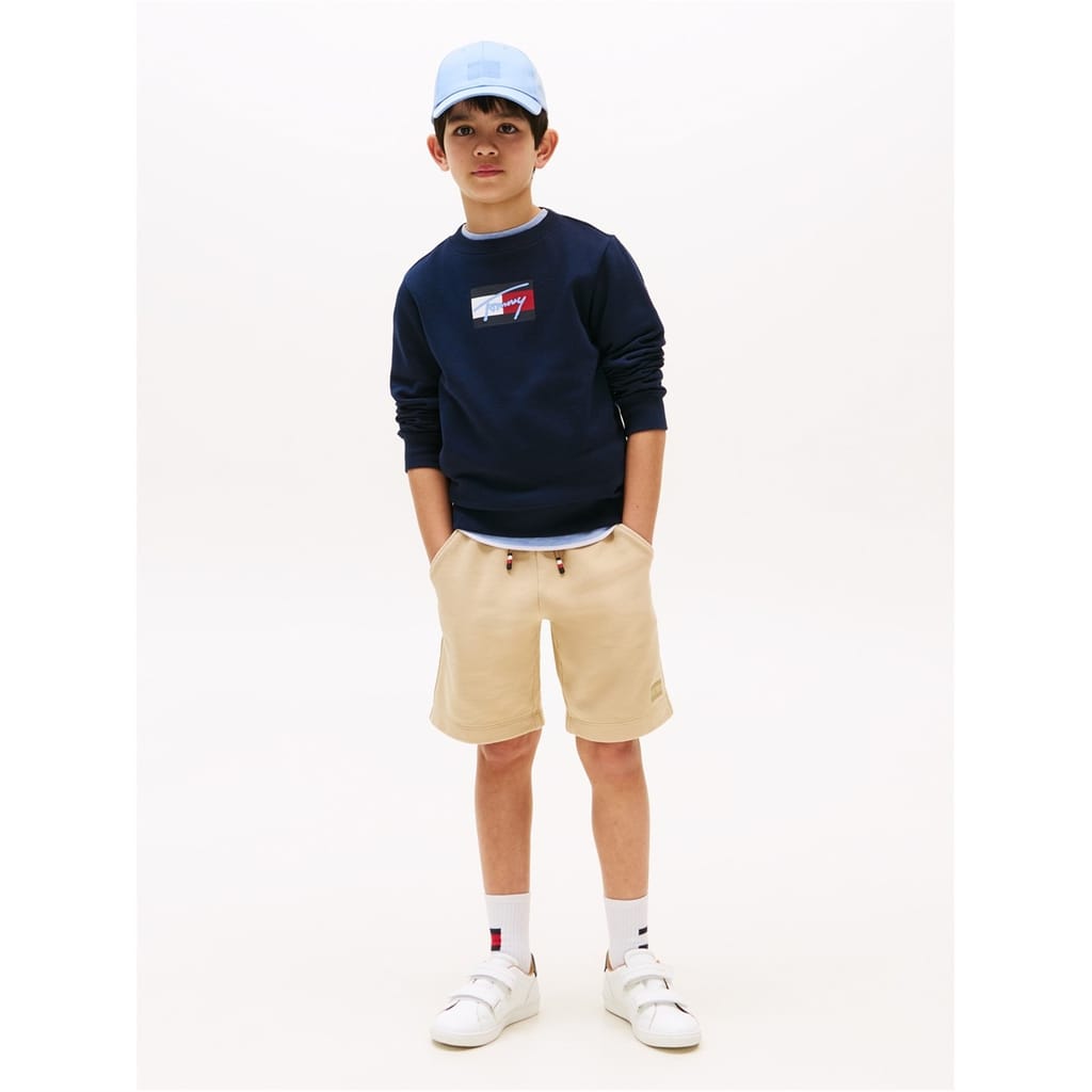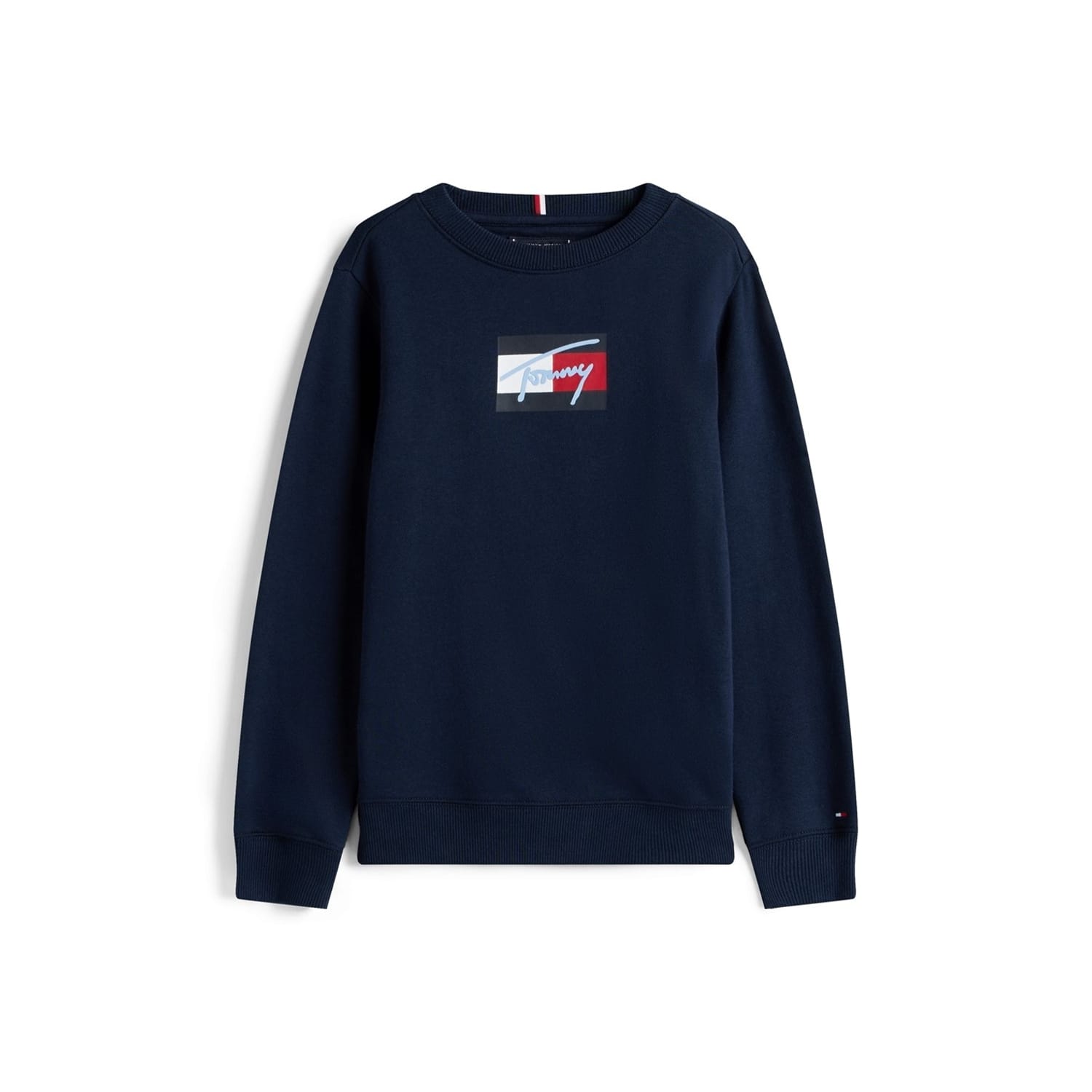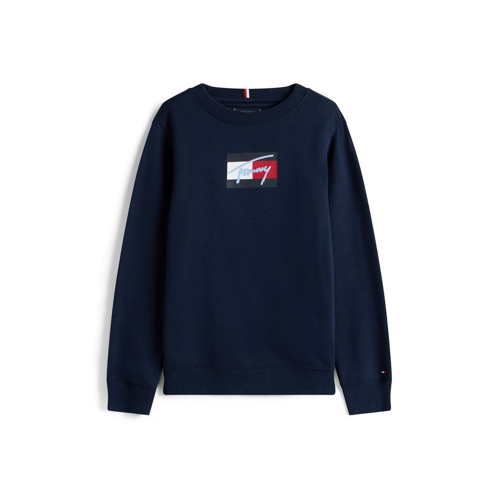 This Tommy Hilfiger top features a crew neck and long sleeves, offering a regular fit. The solid pattern is complemented by a ribbed collar and ribbed cuffs, adding a touch of detail. The top is adorned with a distinctive logo, including a script logo, showcasing the brand's signature style. -