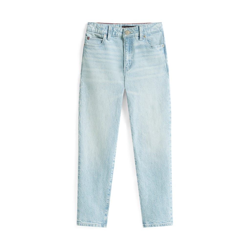 Tommy Hilfiger jeans feature a light wash with a straight fit and a classic five-pocket design. The jeans include a zip fly, front button, and belt loops for secure wear. Embellished with a waist patch and logo, these jeans offer practical pockets including back and coin pockets, making them a versatile addition to your wardrobe. -