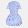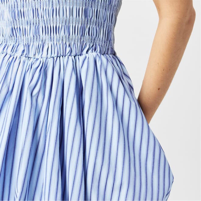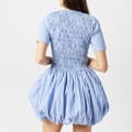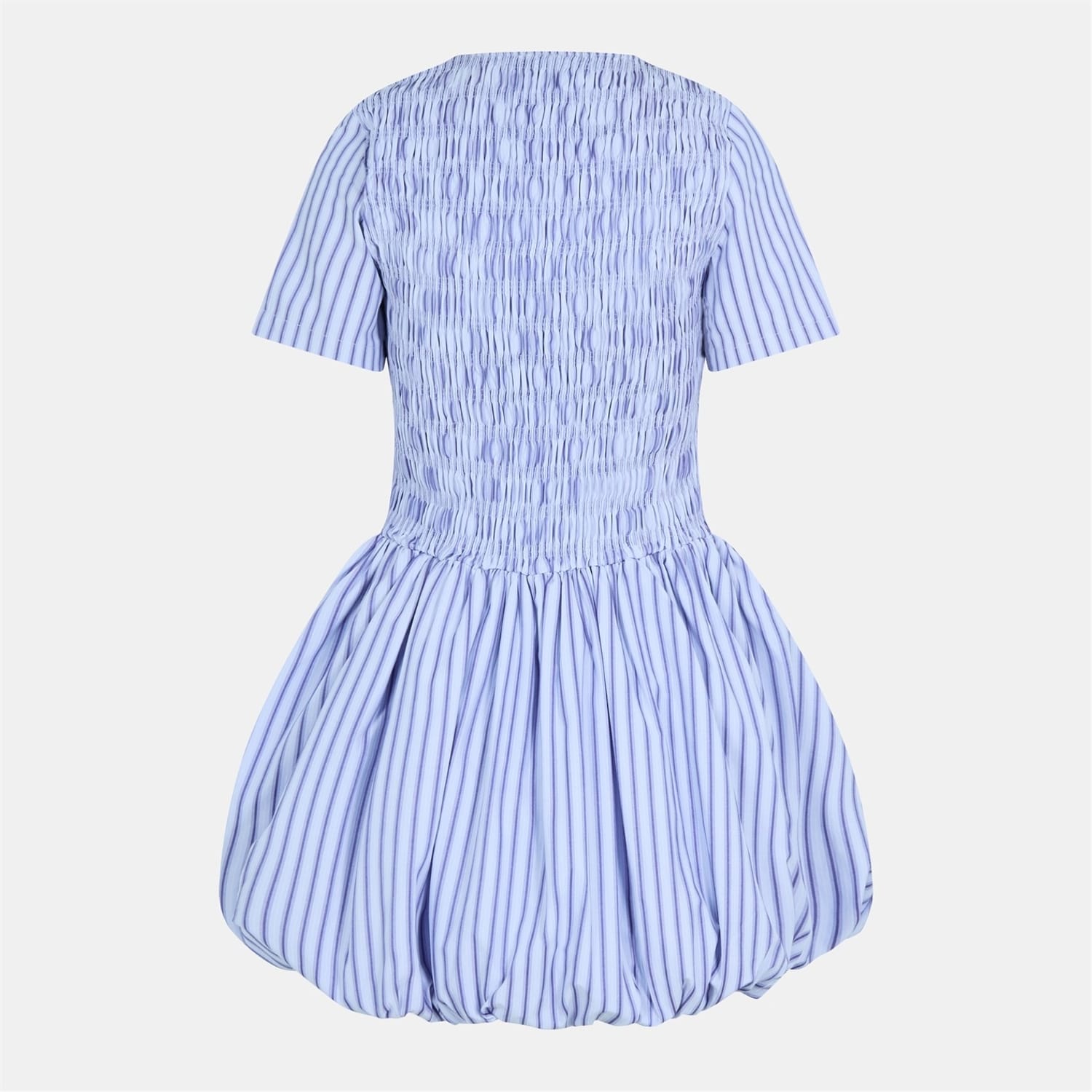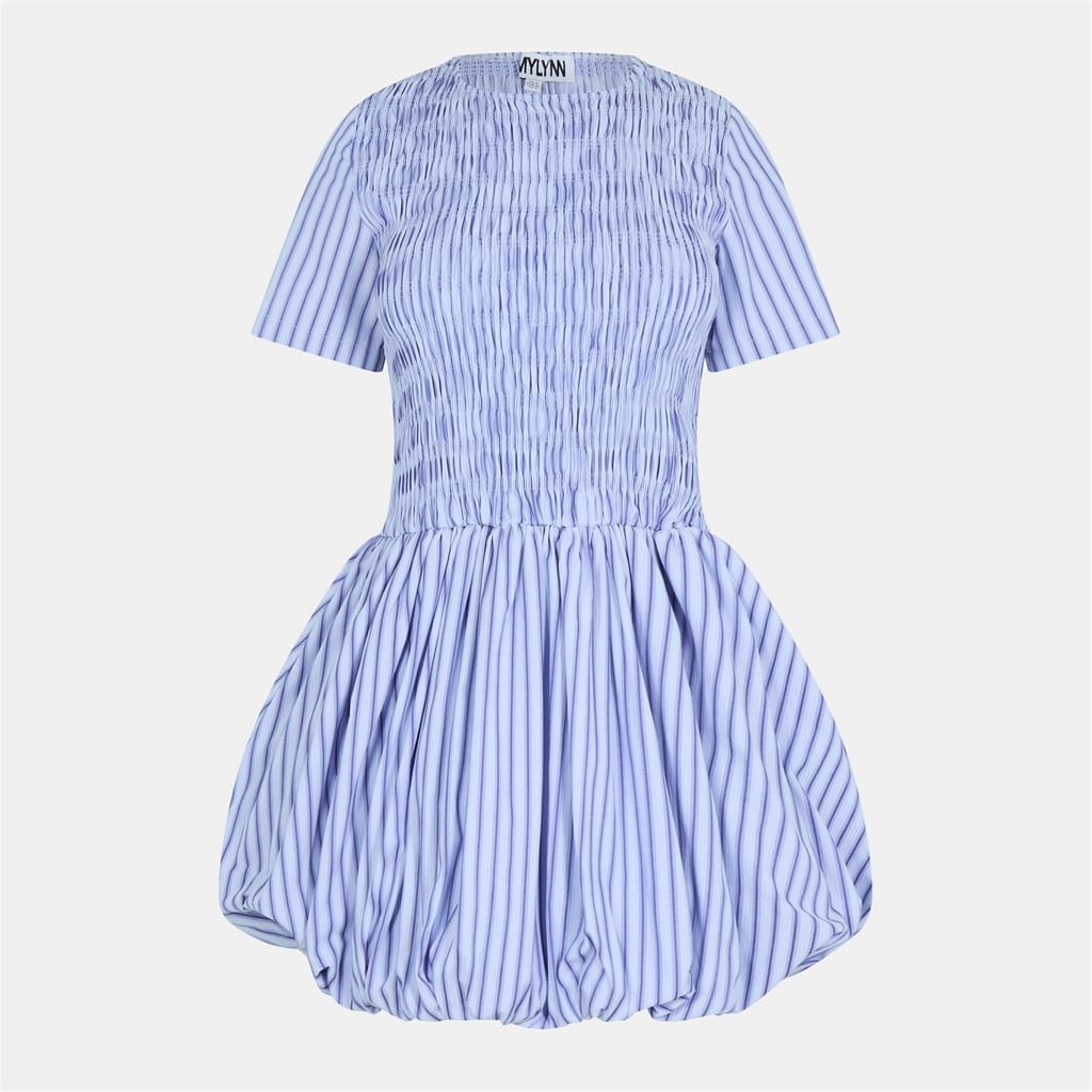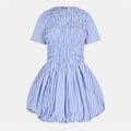 This Amylynn mini dress features a charming babydoll style with a crew neck and puff sleeves. The striped pattern adds a playful touch, making it a versatile choice for various occasions. -