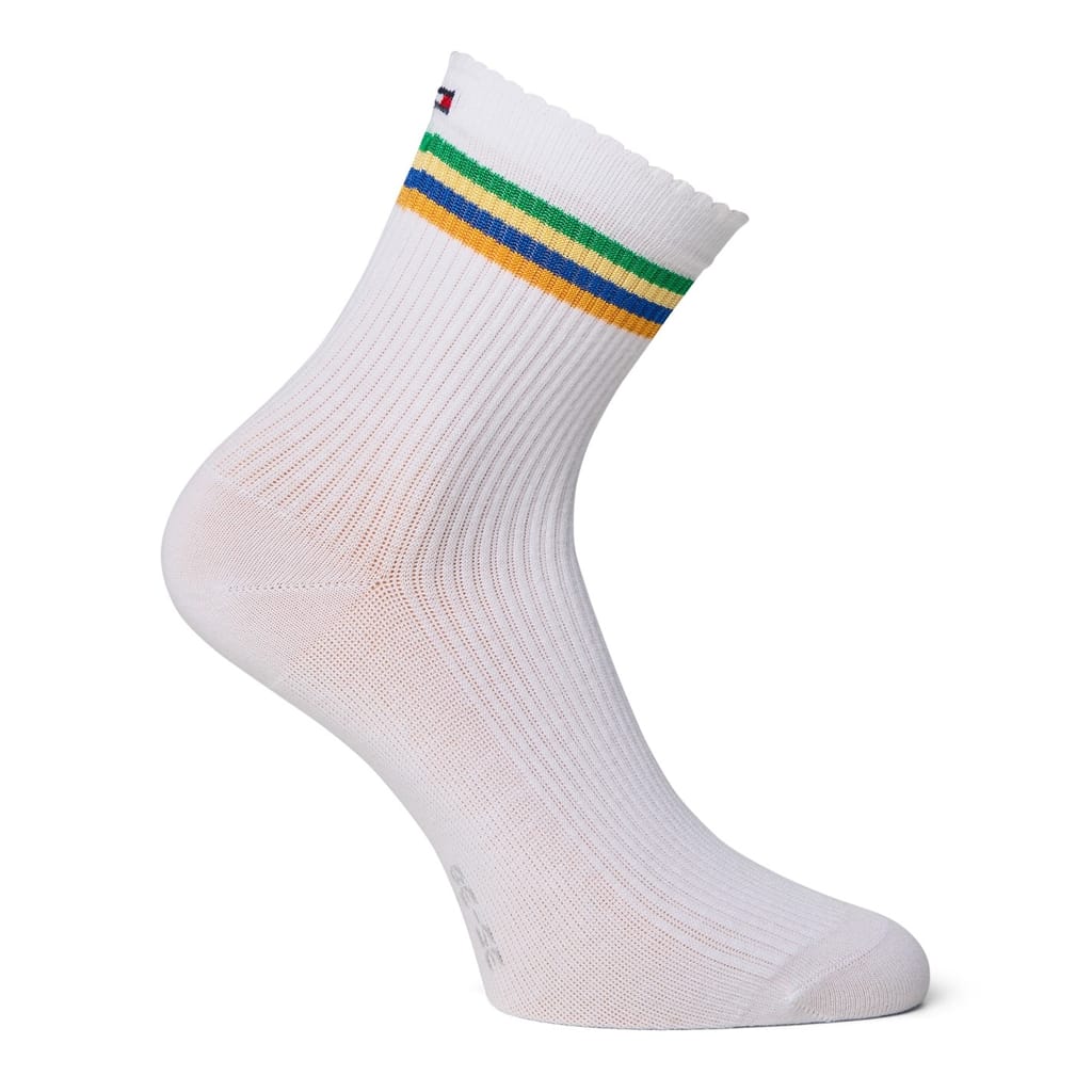 Tommy Hilfiger crew socks feature a stylish horizontal stripe pattern, adding a touch of flair to your sock collection. These socks are adorned with the iconic logo, ensuring a blend of comfort and brand recognition. Perfect for those who appreciate both style and quality in their everyday essentials. -