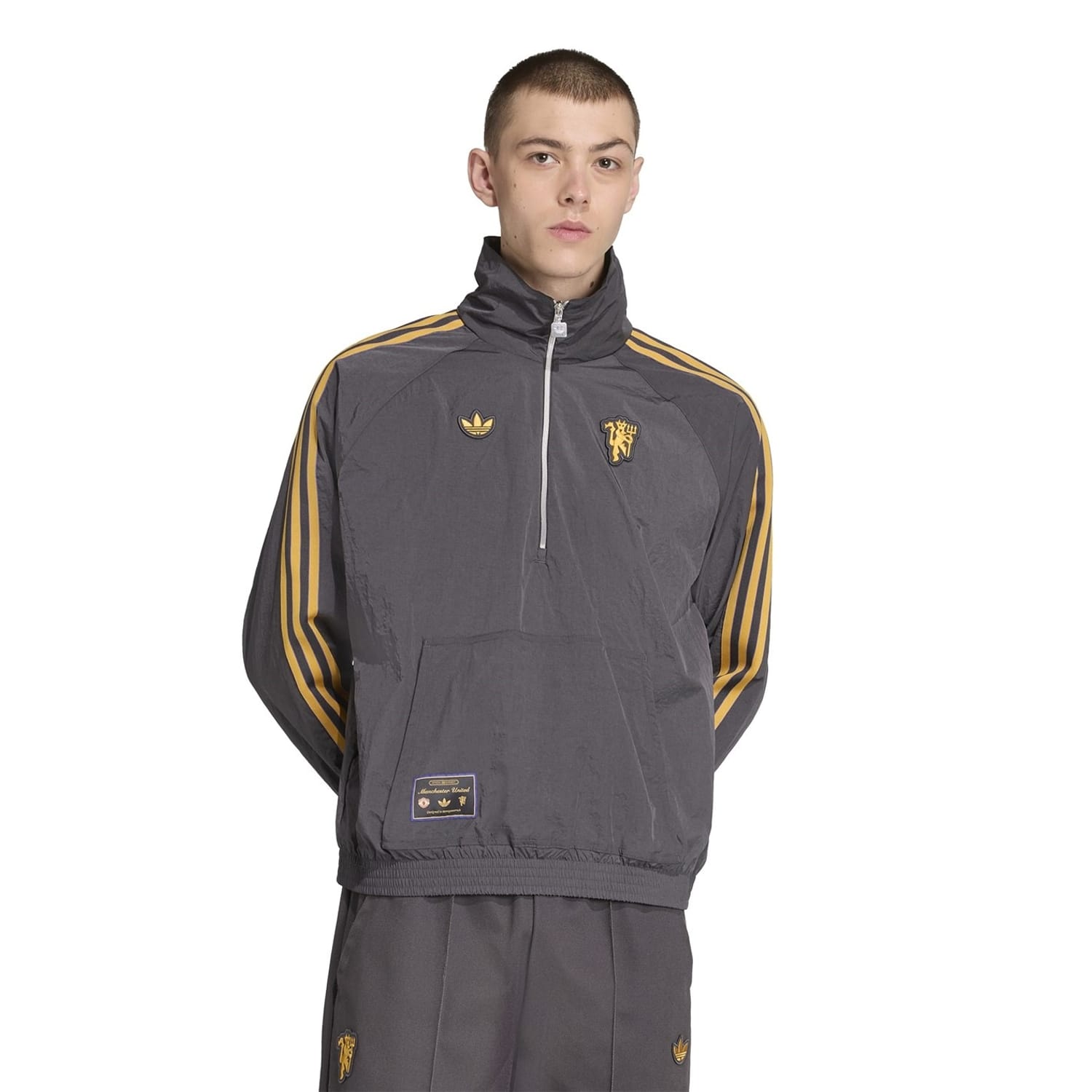 Stay ready in sleek, sporty style with the adidas Manchester United Half Zip Jacket. The badge on the chest creates a signature touch, while the classic three-stripe design offers a sleek, sporty style. Perfect for light training, layering on breezy matchdays, or adding a smart edge to your everyday fanwear.