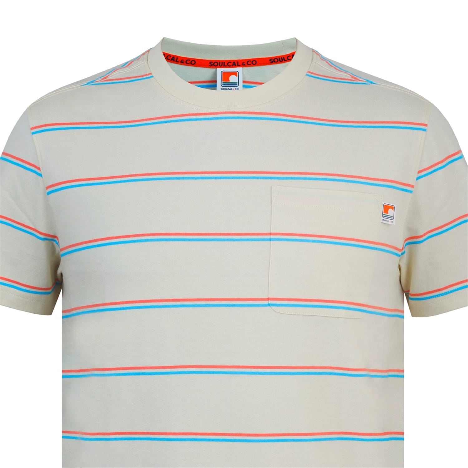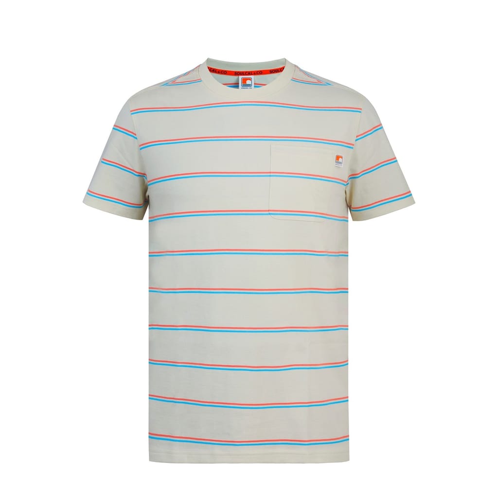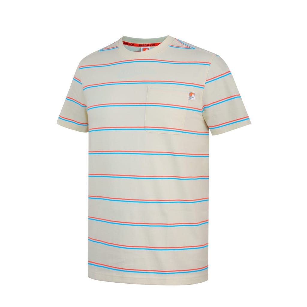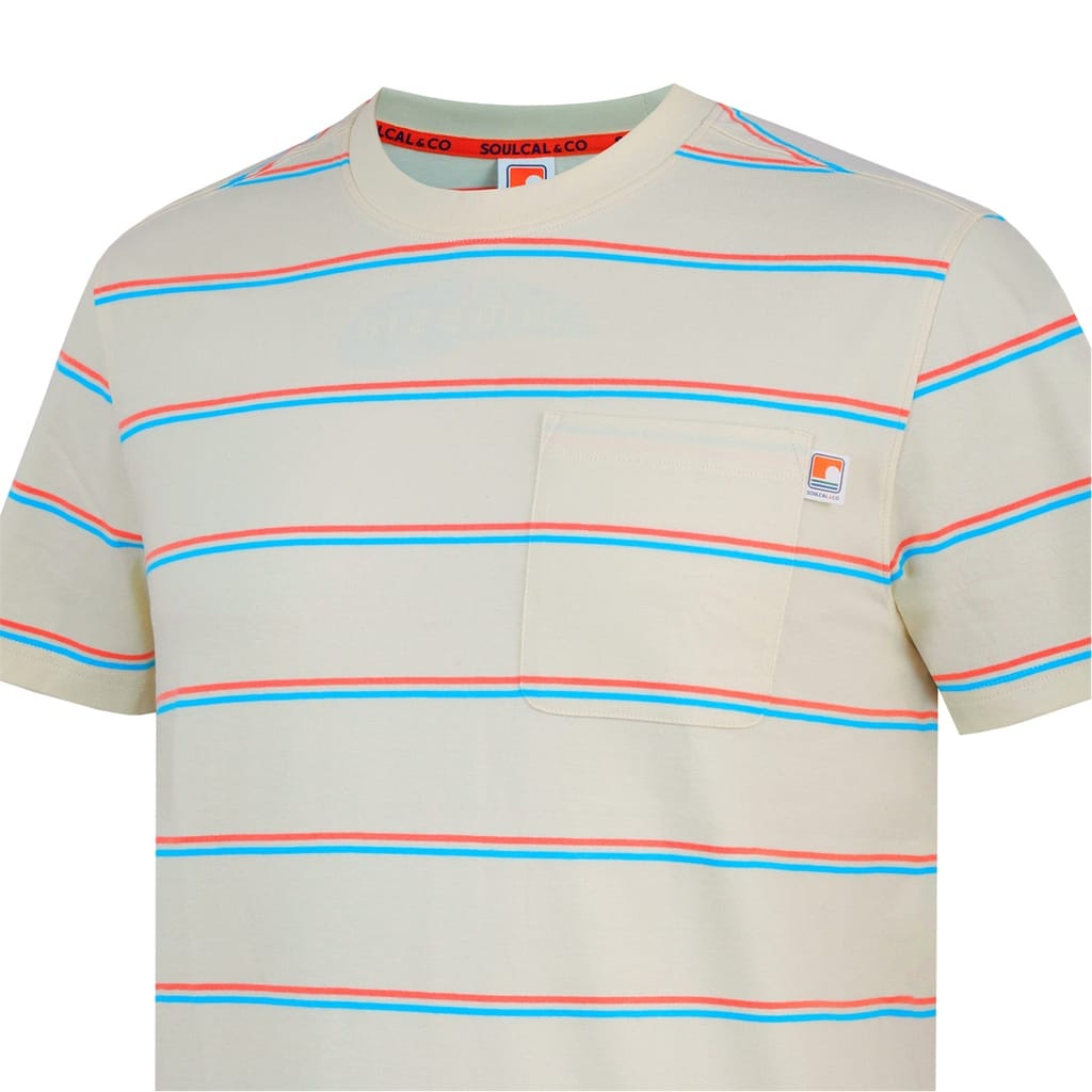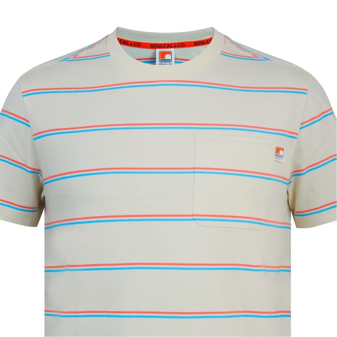This Soulcal top features a classic stripe pattern and a regular fit, perfect for casual wear. The short sleeves and crew neck design offer a comfortable and relaxed style. A pocket adds a practical touch, while the logo embellishment subtly showcases the brand's identity. -