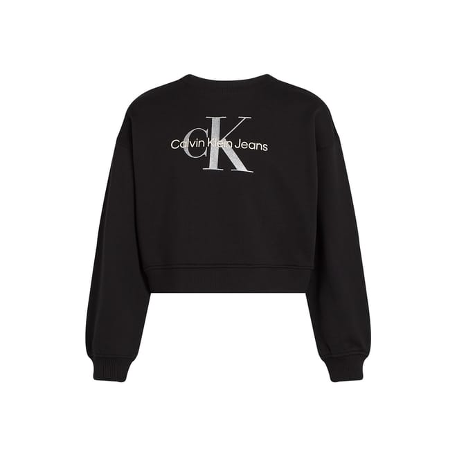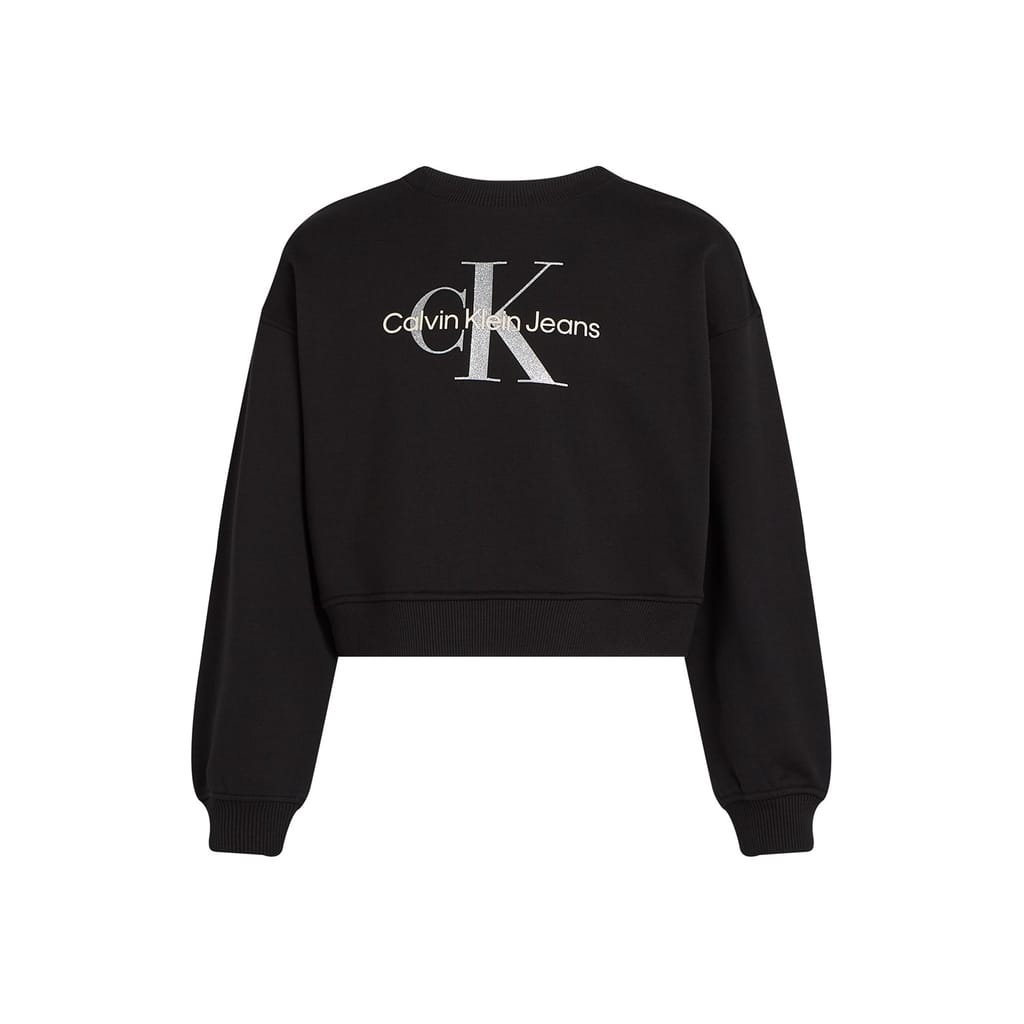This Calvin Klein Jeans top features a cropped length with a crew neck and long sleeves. The solid design is enhanced with glitter, monogram, and logo embellishments, adding a touch of style. The regular fit ensures comfort, while the ribbed cuffs provide a neat finish. -