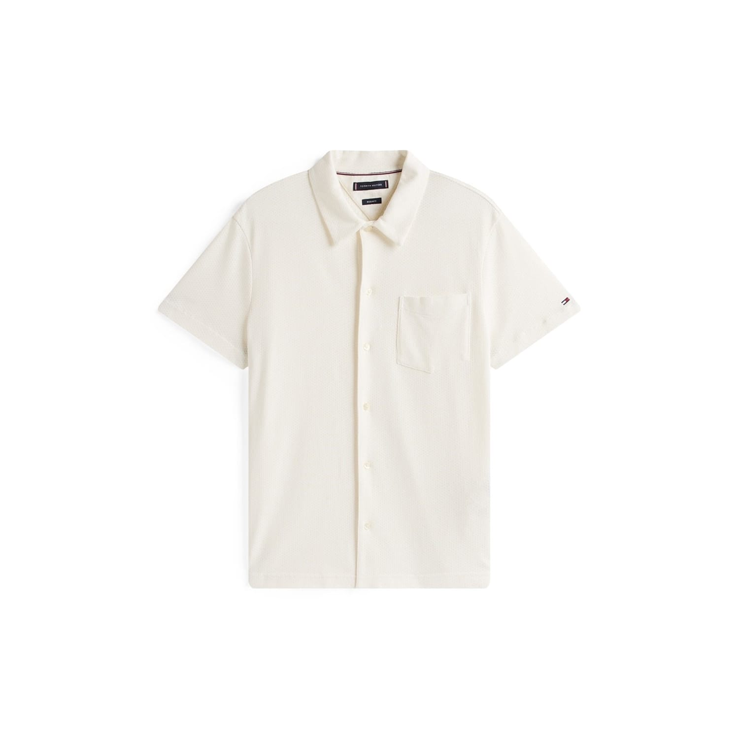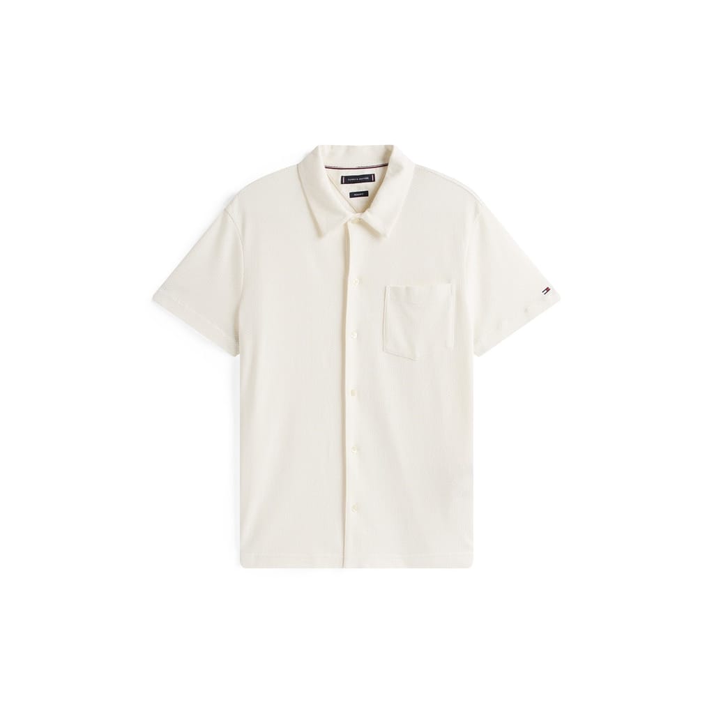 This Tommy Hilfiger top features a distinctive waffle pattern and a classic shirt collar. Designed with short sleeves and a regular fit, it offers a comfortable and stylish look. The button closure adds a touch of sophistication, while the logo and pocket embellishments enhance its casual appeal. -